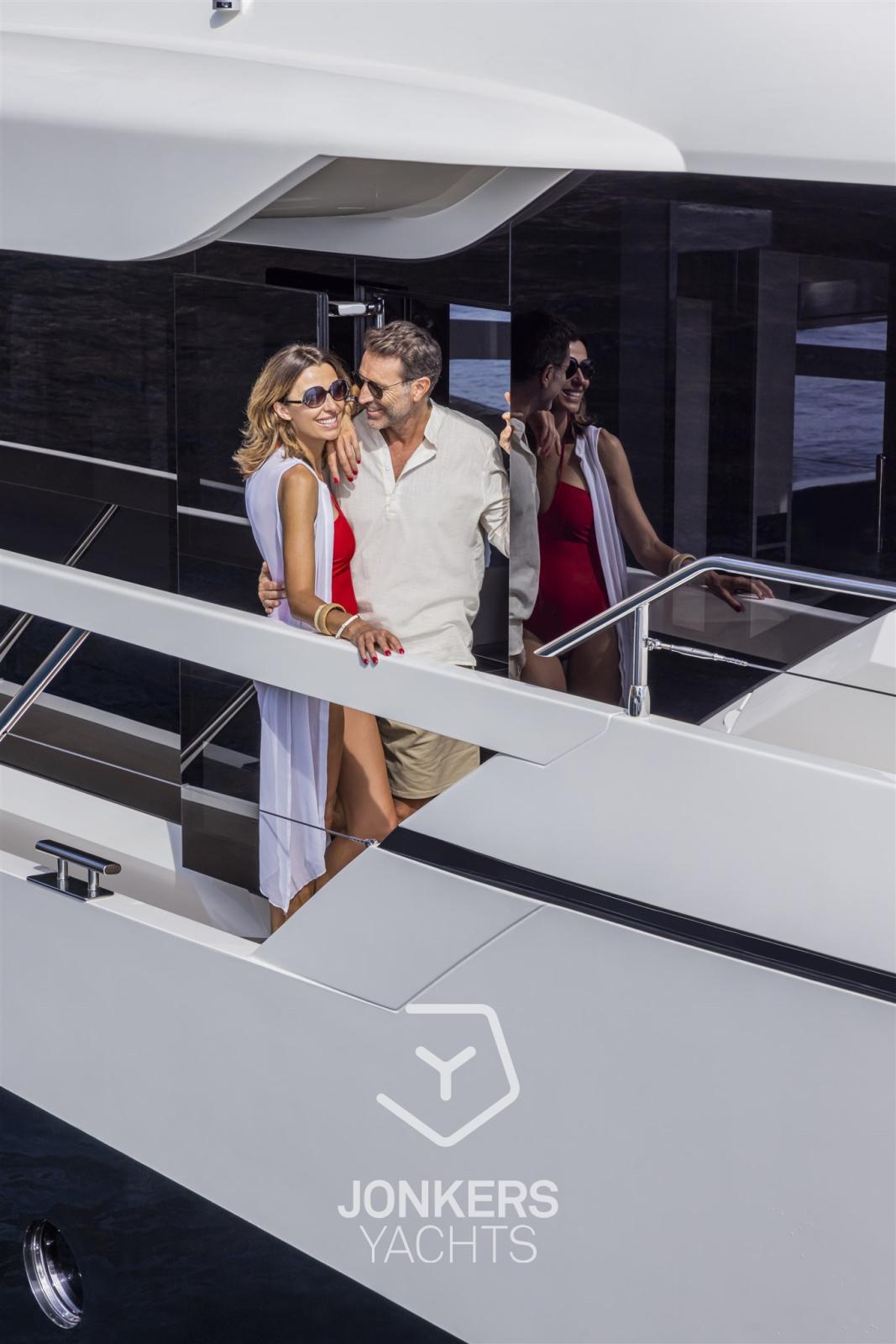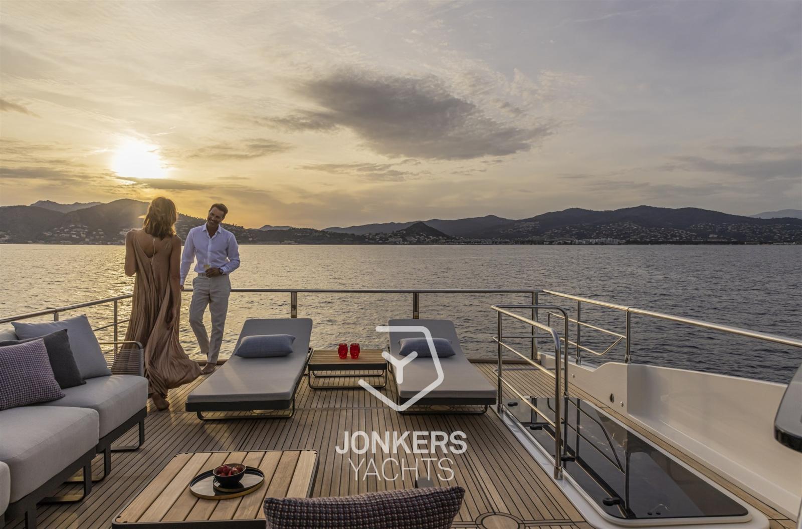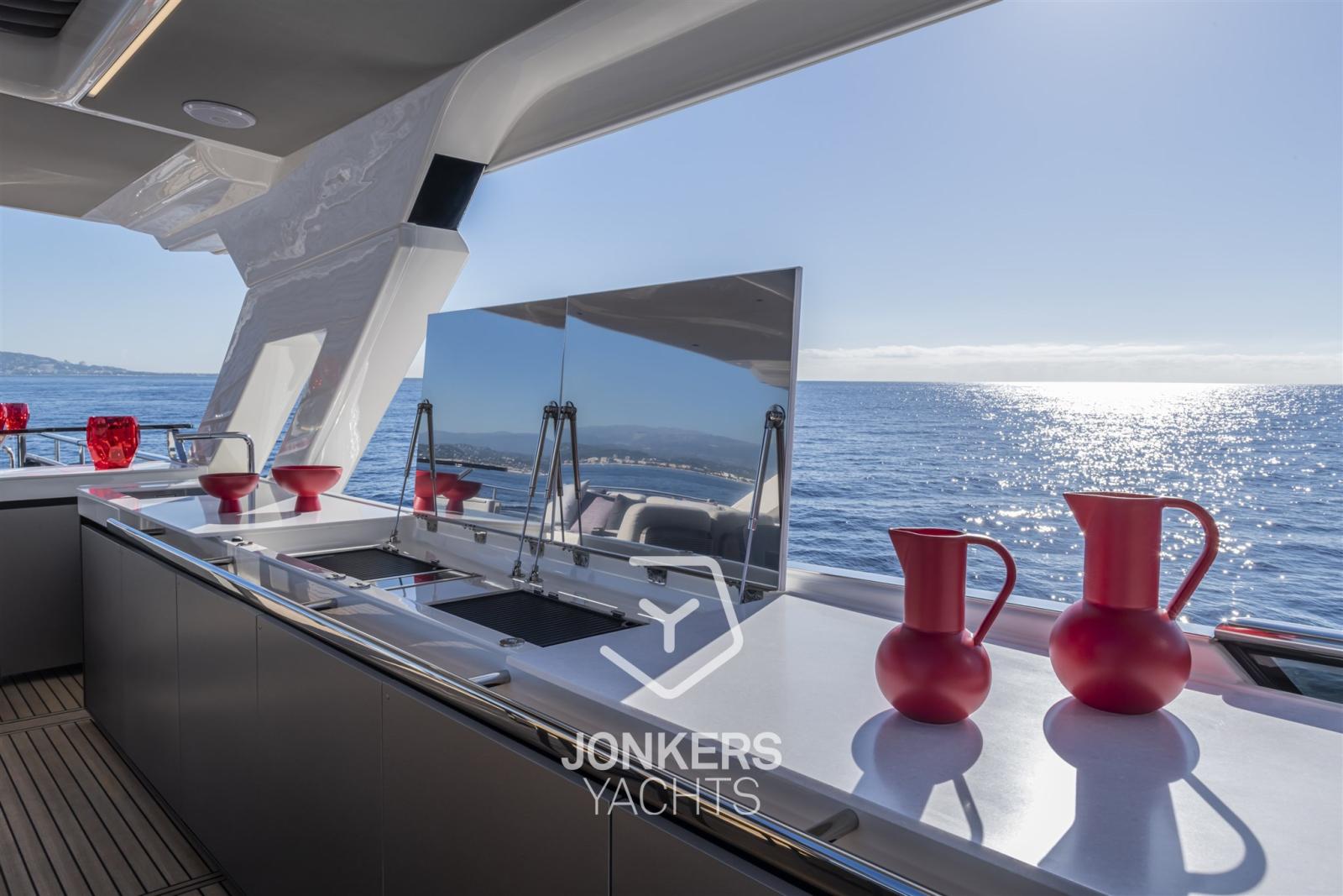 Le aree esterne, che rispecchiano perfettamente gli interni, sono ottimizzate per garantire la massima versatilità e facilità di movimento a bordo. Con due scale per salire rapidamente al flybridge, da poppa e da prua, l'equipaggio può spostarsi dove serve, garantendo la privacy dell'armatore e senza interferire con gli ospiti. Una terza e una quarta postazione di ormeggio sono disponibili per arricchire le due consolle di guida per una manovrabilità senza pari. Grazie agli arredi modulari e all'assenza di elementi strutturali fissi, le aree del flybridge e del pozzetto possono adattarsi facilmente alle diverse esigenze, garantendo un'esperienza di bordo davvero unica e immersiva.