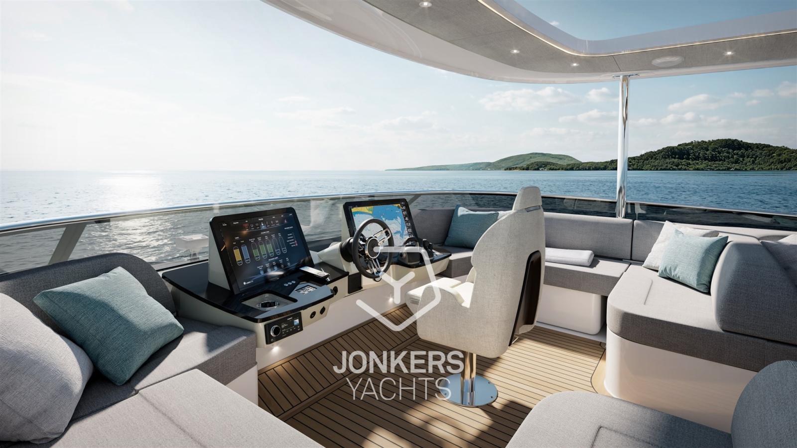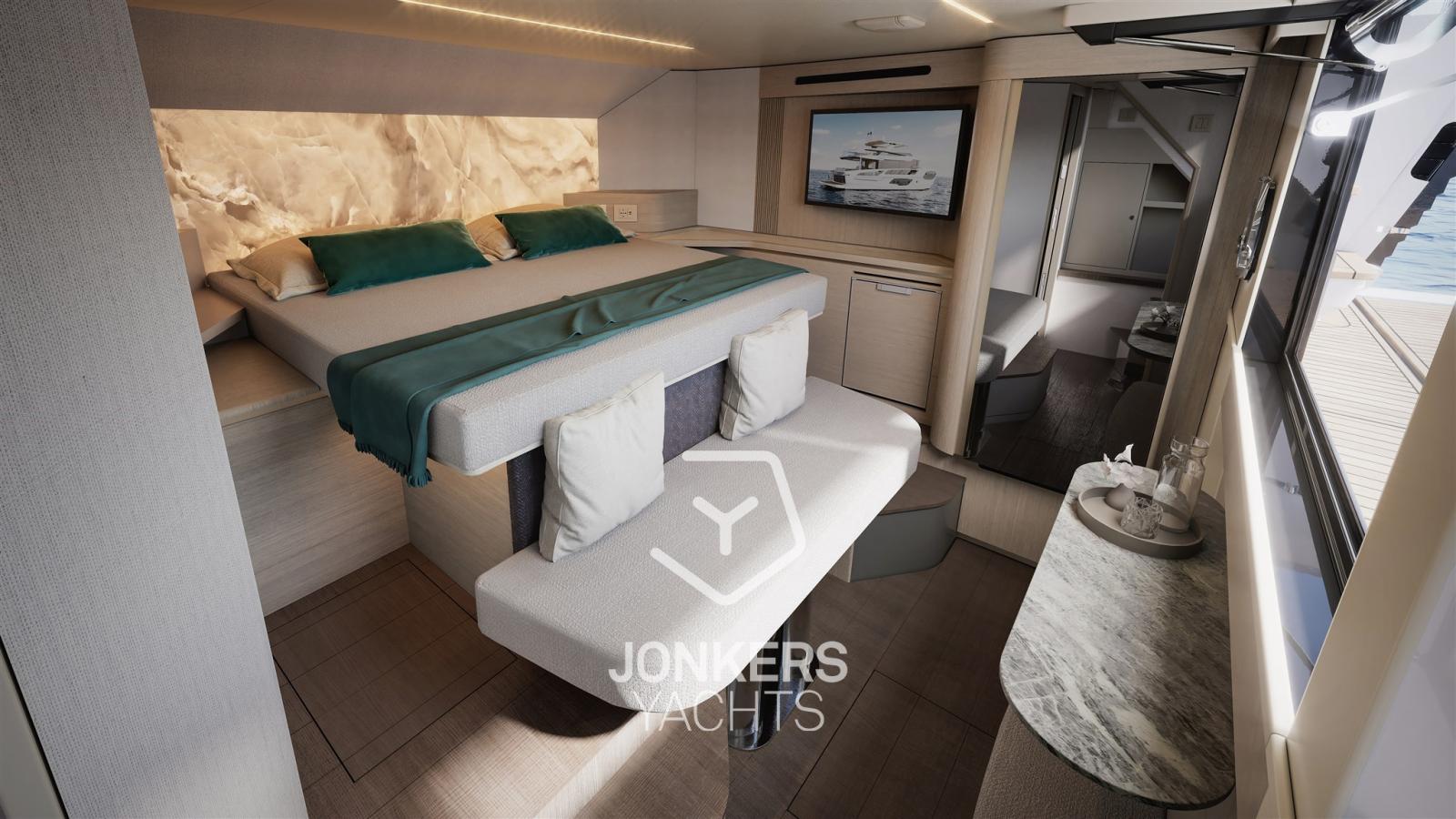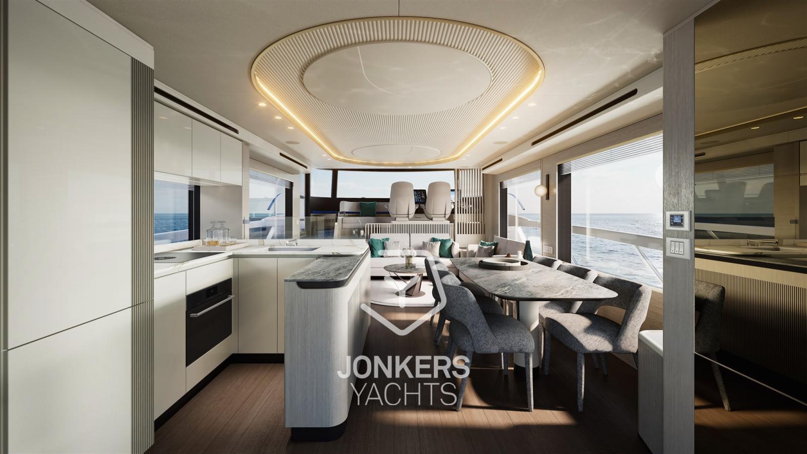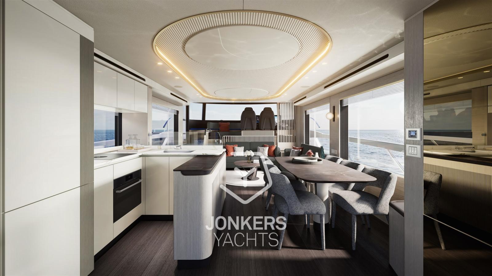 Il salone è dotato di un innovativo tavolo da pranzo con regolazione elettrica dell'altezza e sei sedie autoportanti per la massima flessibilità, mentre una bassa parete divisoria in vetro separa sottilmente la cucina, preservando un senso di apertura. Una TV a schermo piatto a scomparsa può essere alzata o abbassata per ottimizzare la vista attraverso le finestre panoramiche. La plancia di comando, con il suo nuovo e distintivo design delle sedute, coniuga perfettamente comfort e stile, offrendo uno spazio elegante e funzionale per la navigazione.