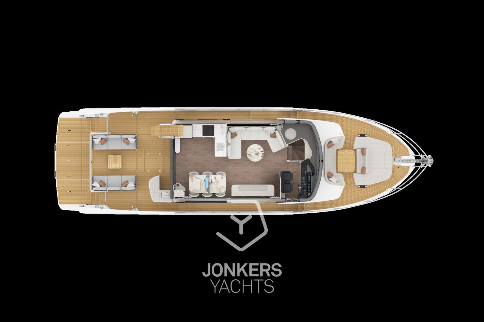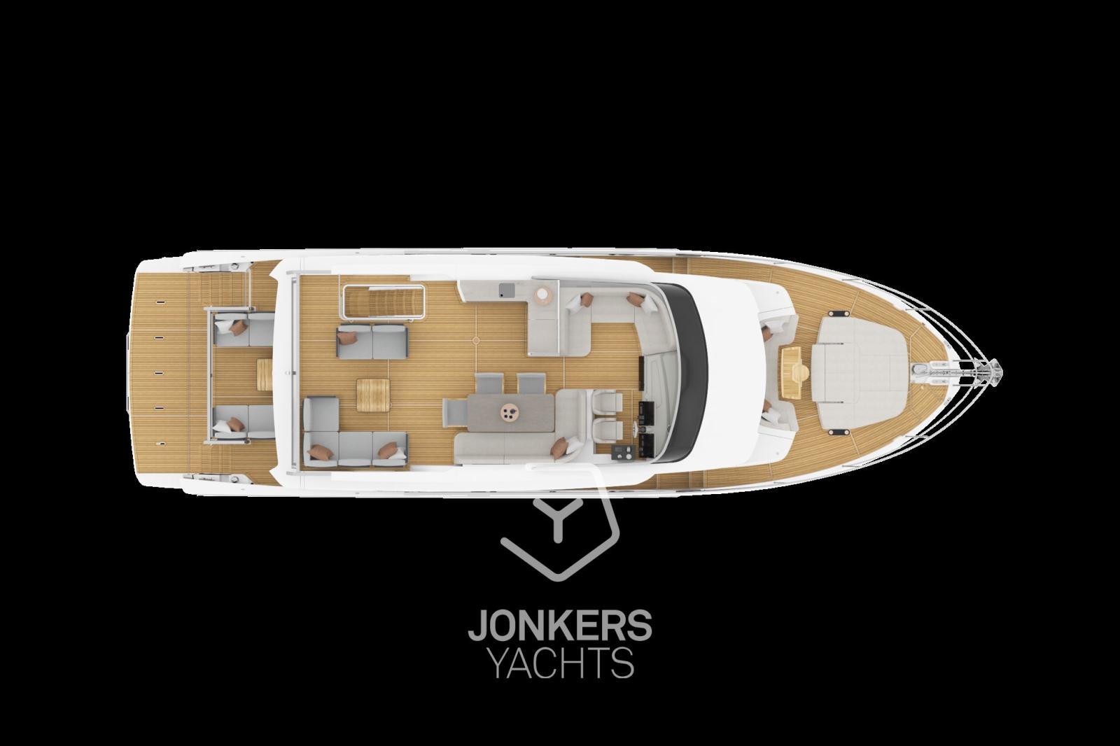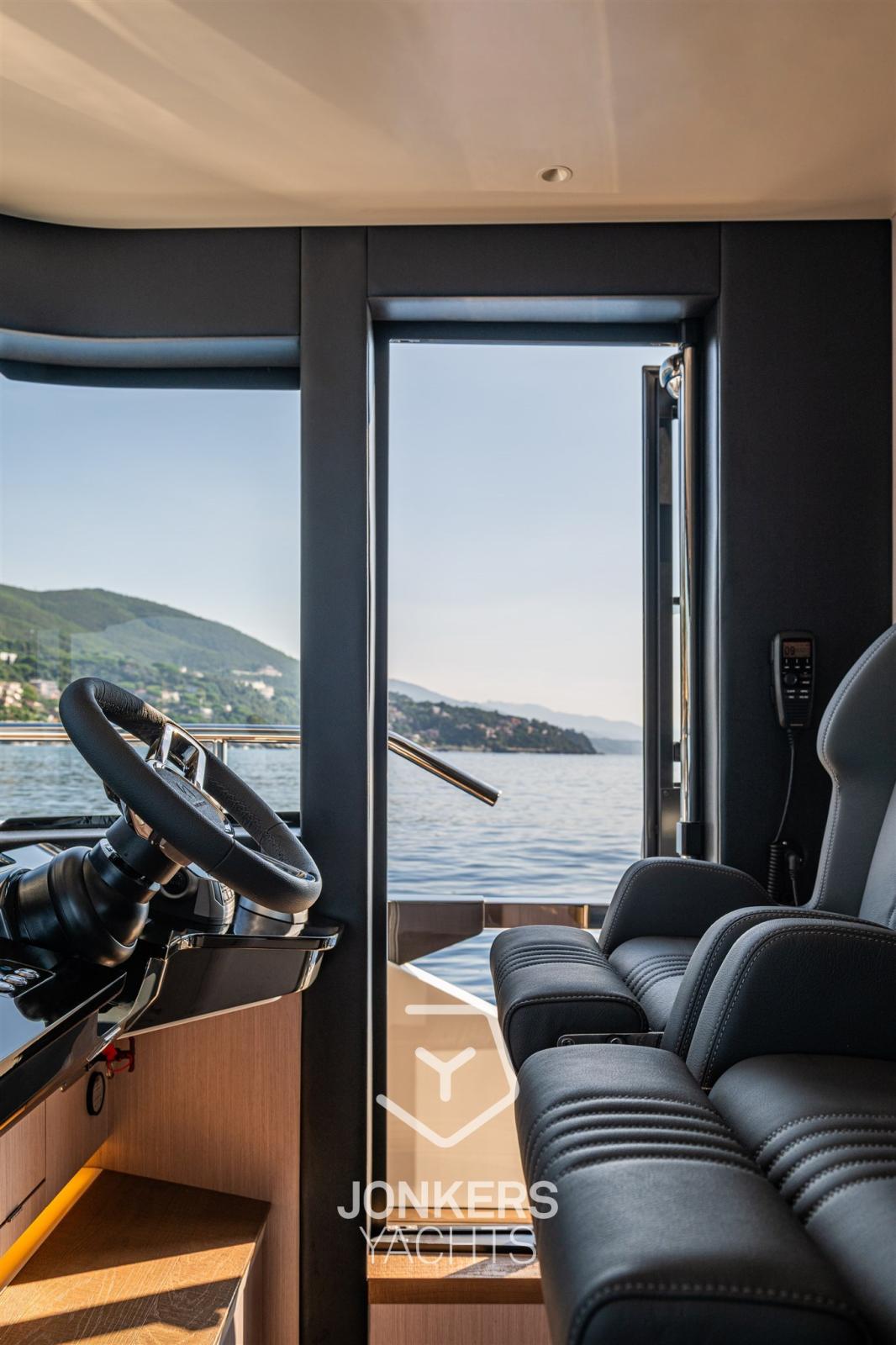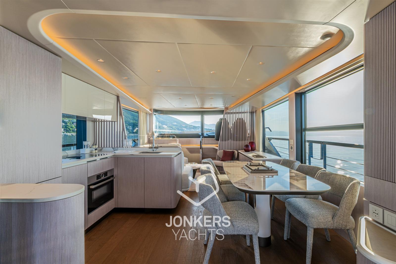 La versatilità degli spazi esterni, con arredi modulari che si adattano ad ogni occasione, permette all'ambiente di trasformarsi senza sforzo, sia per un tranquillo momento di relax che per un'elegante serata sotto le stelle. Le finiture di pregio, come la plancetta di poppa vetrata e le eleganti strisce LED integrate, aggiungono un raffinato tocco moderno, rendendo ogni angolo esterno un luogo ideale per la convivialità e il relax.