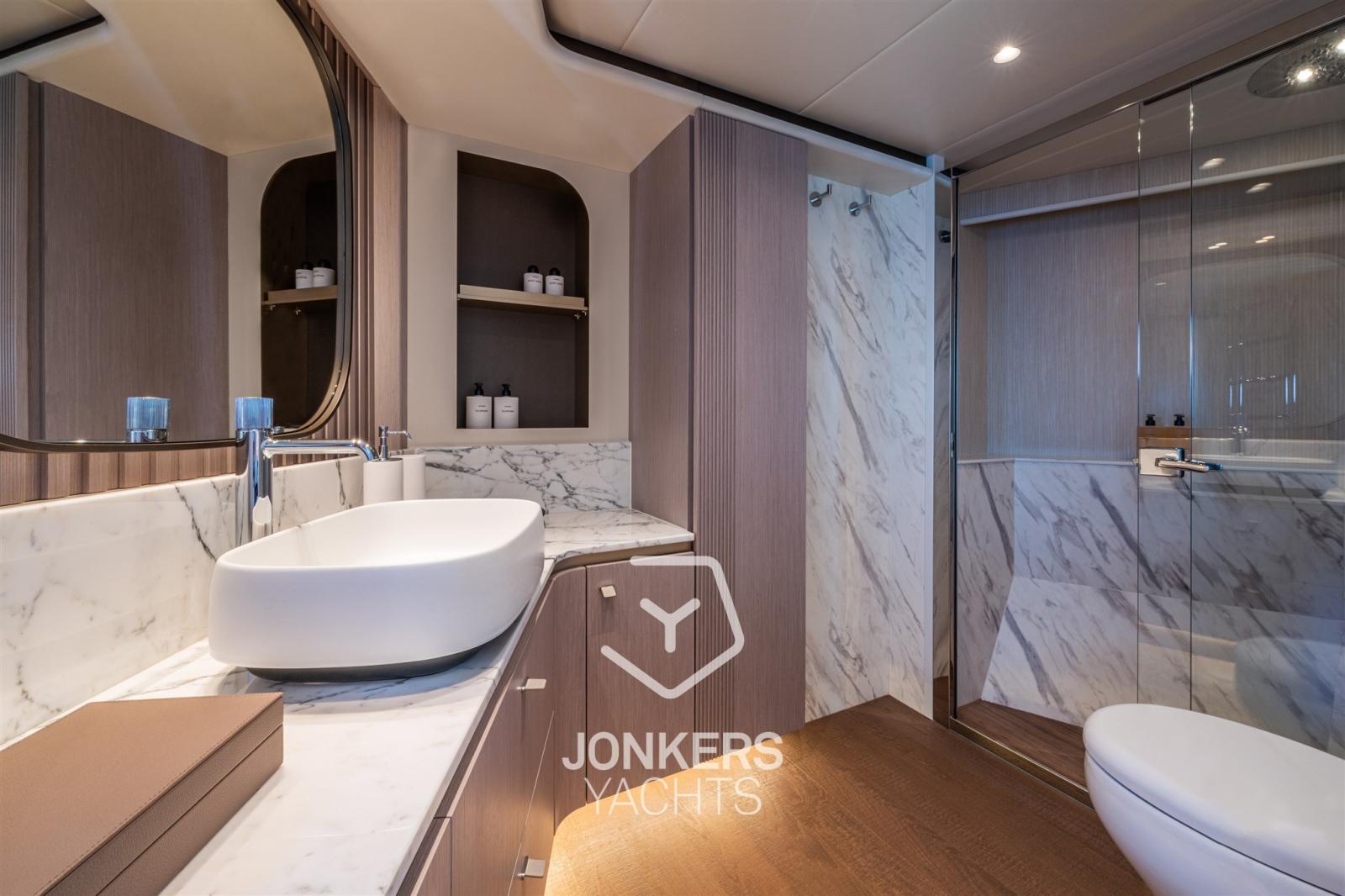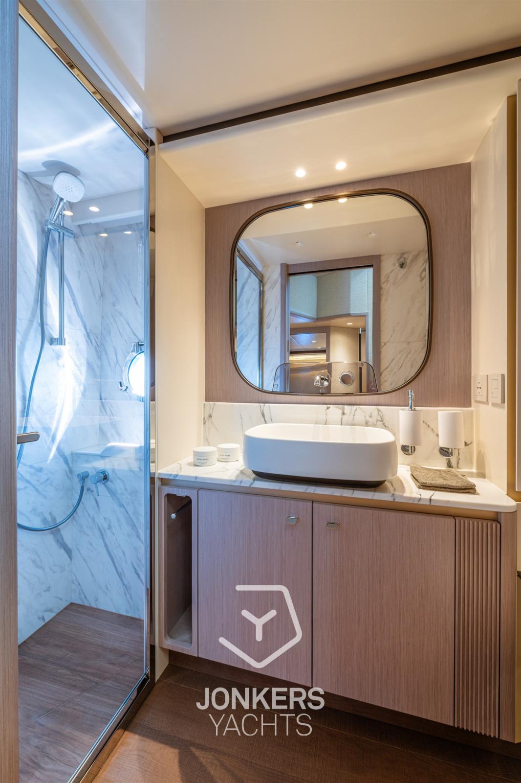 La zona giorno è un inno del comfort: un tavolo regolabile elettricamente e soffici divani, che ricordano il calore e la familiarità di casa, trasformano ogni occasione a bordo in un'esperienza rilassante e memorabile. Ma è nelle cabine che la Navetta 62 svela davvero il suo carattere lussuoso. Ogni cabina è un'oasi di completa tranquillità, progettata per offrire la massima privacy e comfort. La cabina armatoriale, situata a prua, incarna la raffinatezza con un letto king-size, un ampio spazio di stivaggio e finiture squisite. Le tende plissettate a tutta altezza esaltano ulteriormente l'eleganza della stanza. Sia la cabina VIP che quella ospiti offrono spazi generosi, con letti confortevoli e arredi meticolosamente curati. Ogni cabina è concepita per creare un'atmosfera serena e pacifica, assicurando che ogni notte trascorsa a bordo sia un'esperienza di lusso senza compromessi.