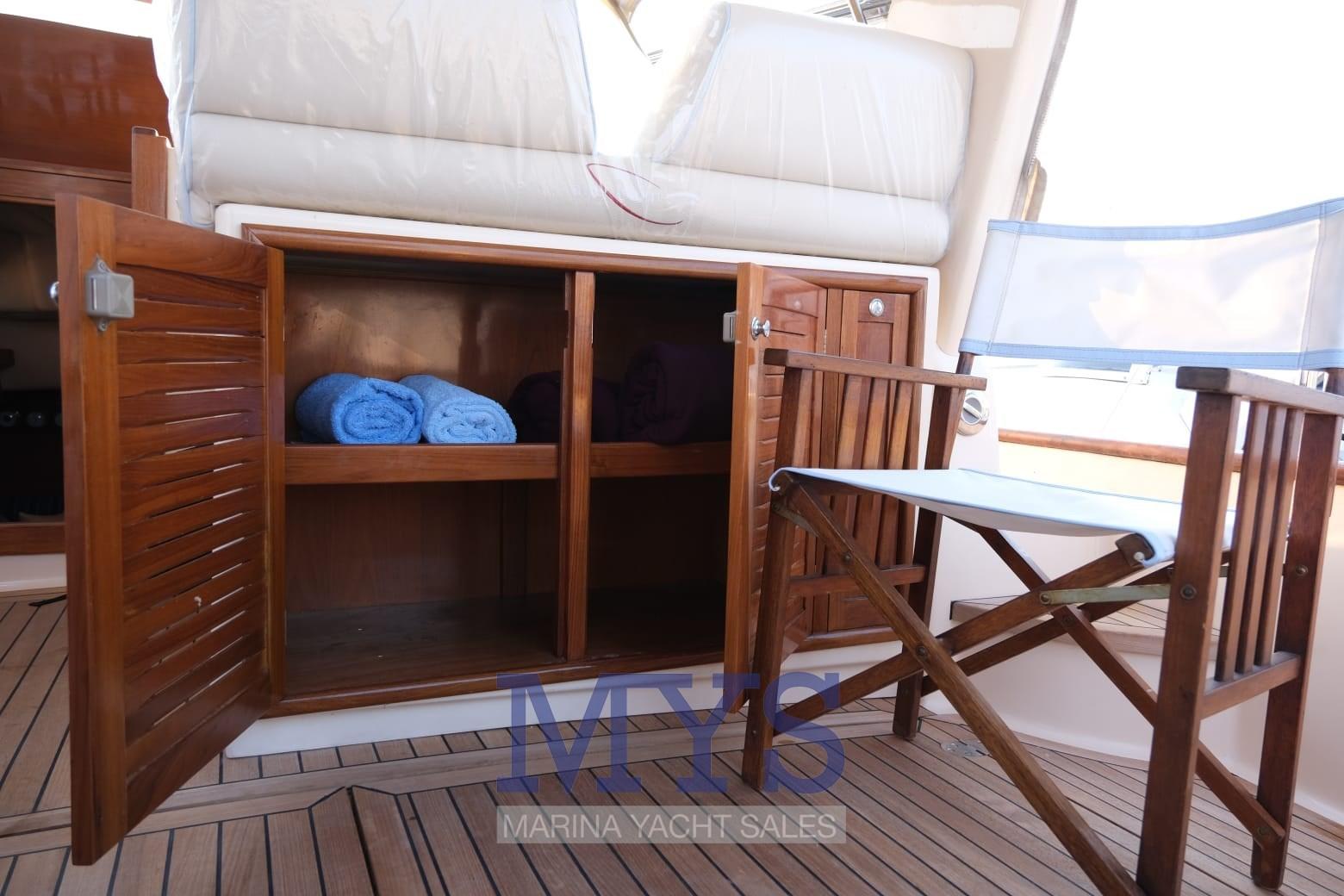 Allarme motore, Autoclave, Cavo corrente di banchina, Colorazione speciale, Doccia esterna, Flap idraulici, Luci di cortesia, Passerella, Piattaforma, Pompa di sentina automatica, Pozzetto Teak, Presa 220V banchina, Salpa Ancore Elettrico, Scaletta da bagno, Tromba.
