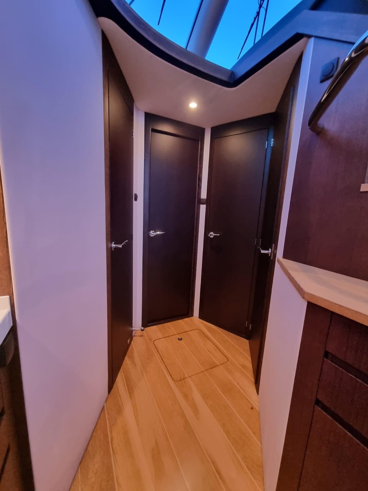 Ancora (with chain), Batterie (starter, service, generator, bow thruster), Doccia esterna (cold/hot water), Hard top, Passerella, Piattaforma (in teak), Pozzetto Teak, Presa 220V banchina, Scaletta da bagno.