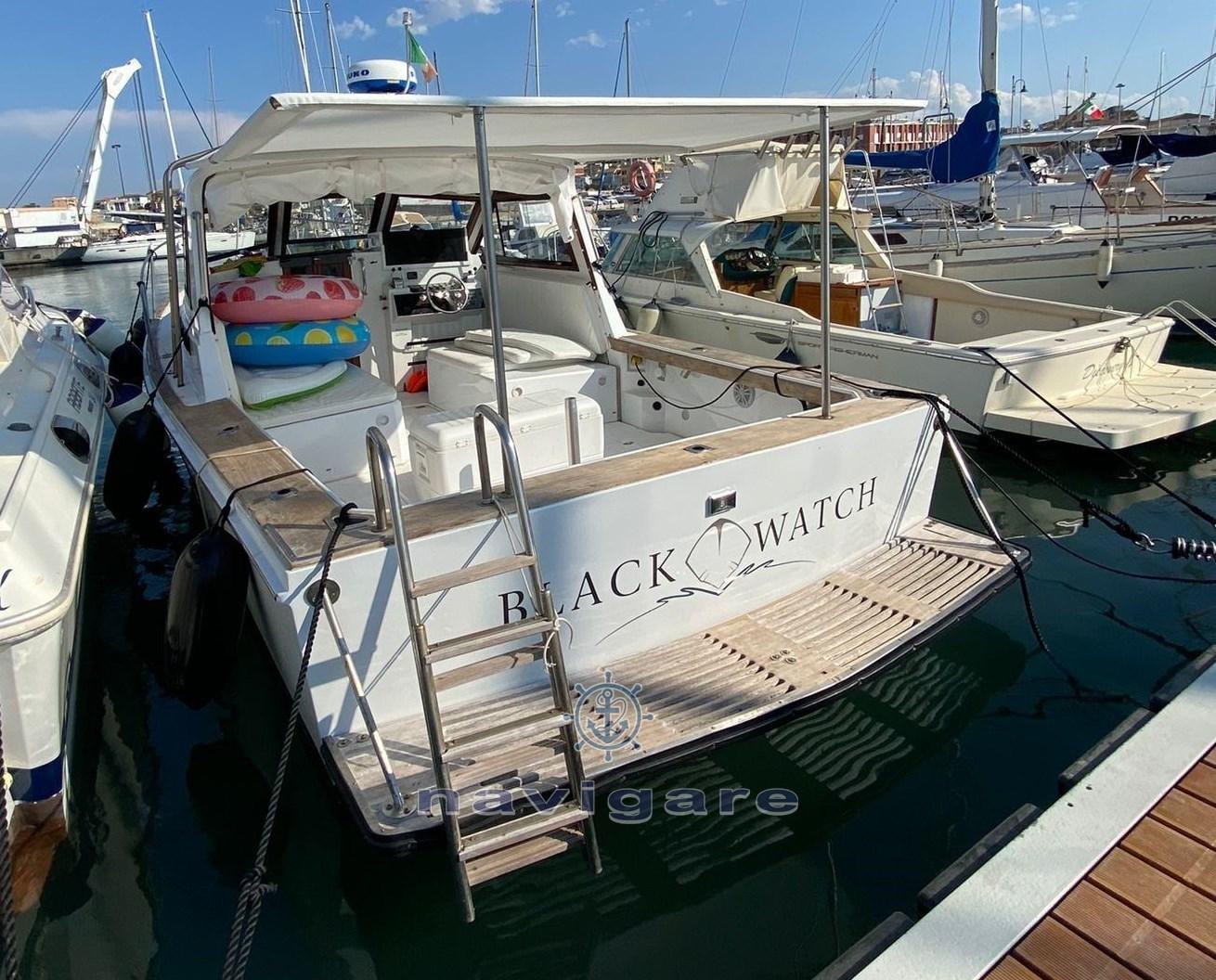 Black Watch 30 ( NATANTE ), lunghezza scafo 10,00 mt., con la spiaggina 10,50 mt., larghezza 3,60 mt., motori e invertitori rifatti a nuovo...serbatoio acqua dolce 400 lt., serbatoio carburante 1.000 lt. in acciaio inox costruito nuovo e sostituito. La barca è stata tutta ristrutturata e riverniciata completamente.