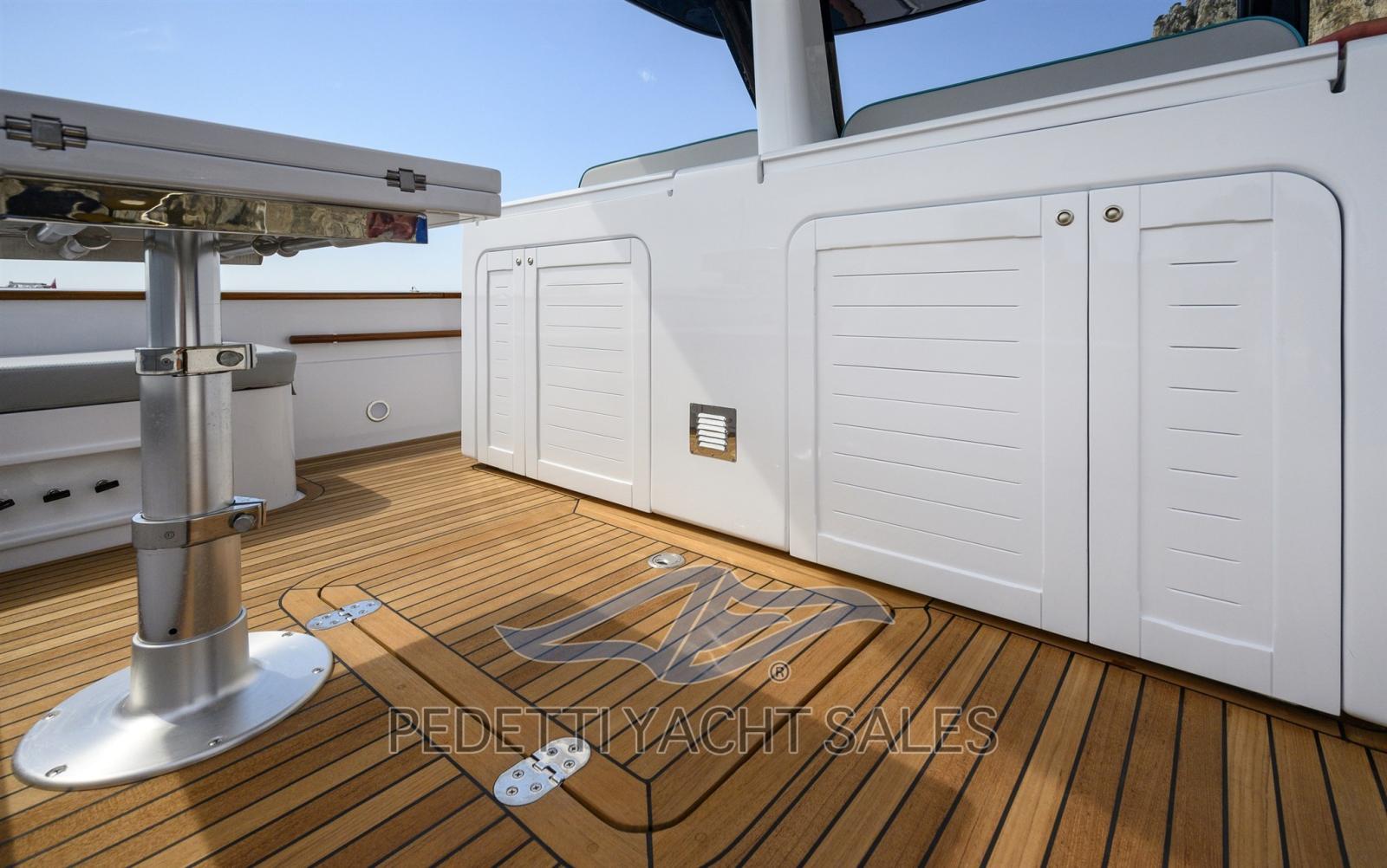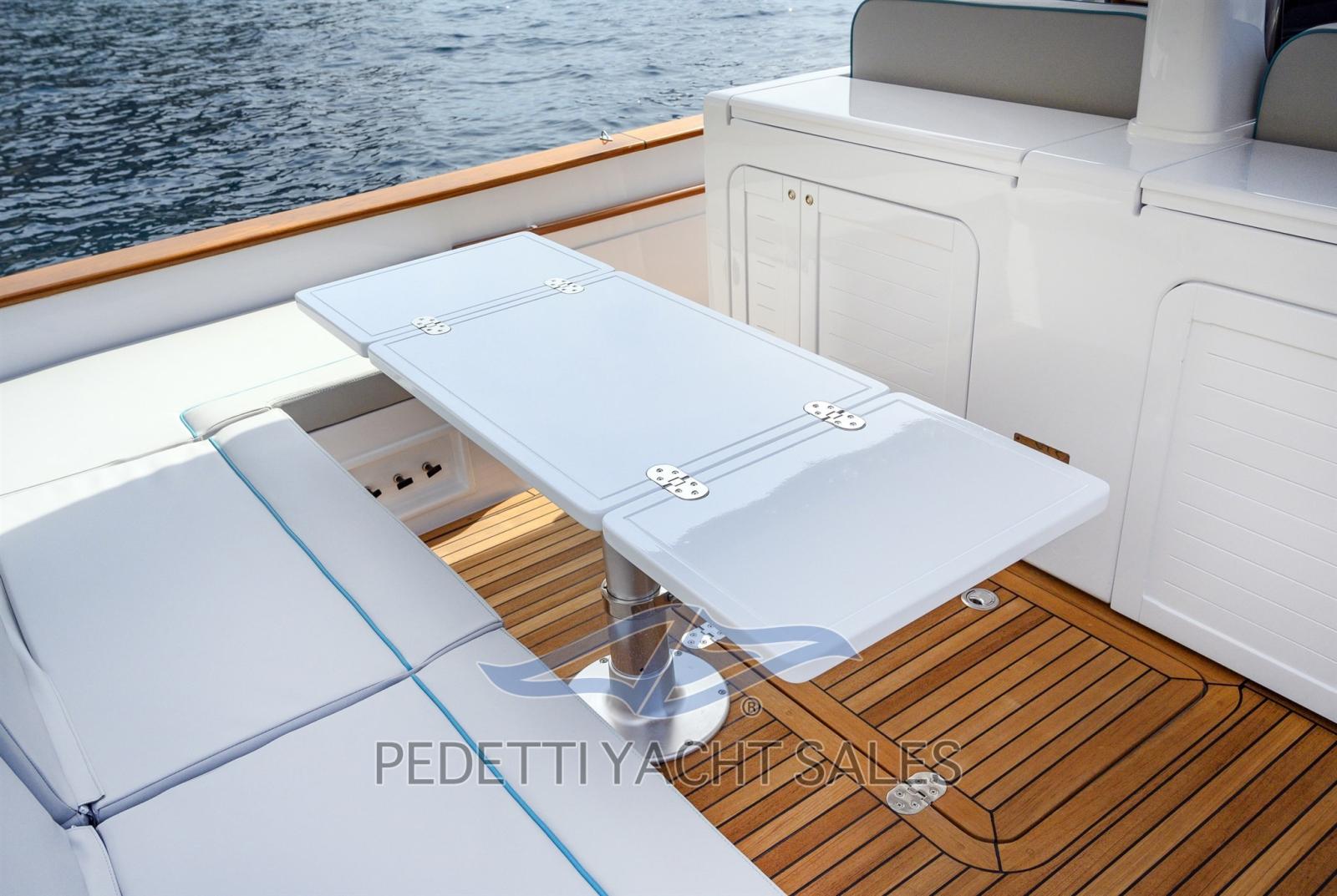 Allarme fumo/gas, Allarme motore, Allarme sentina, Autoclave, 4 Batterie (2x225 Ah 2x180 Ah), Camminamenti laterali in teak, Cavo corrente di banchina, Doccia esterna (A poppa calda e fredda), Flap elettrici, Impianto antincendio (A polvere in sala macchine), Indicatori Flaps, Lavandino nel Pozzetto, Luci di cortesia, 8 Parabordi, Piattaforma, 2 Pompa di sentina automatica, Pompa di sentina manuale, Ponte in teak, Pozzetto Teak, Presa 220V banchina, Salpa Ancore Elettrico (1000 W), Scaletta da bagno, Tavolo pozzetto, Tromba, T-Top.