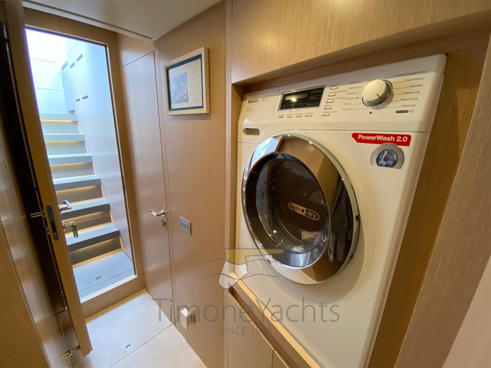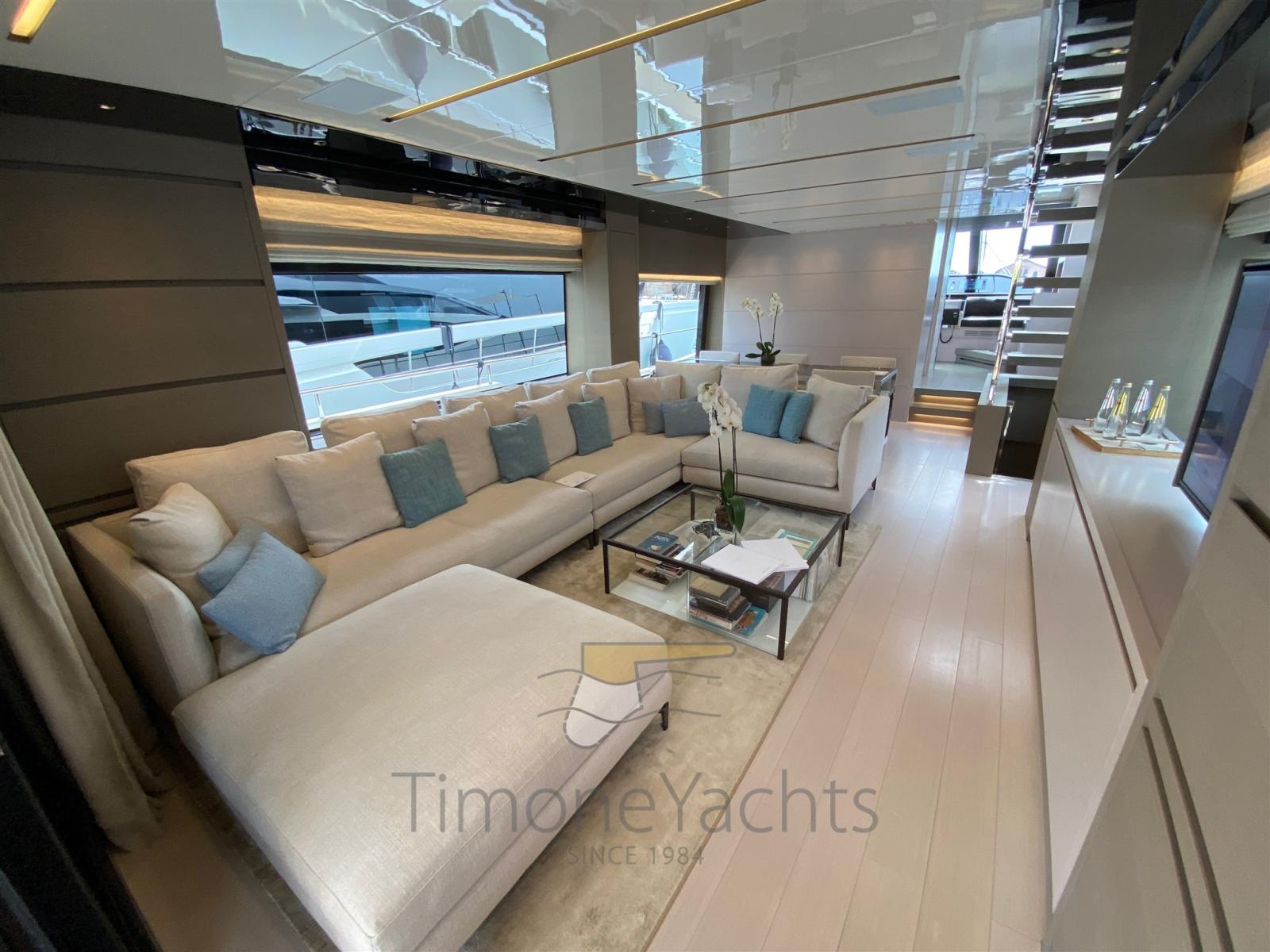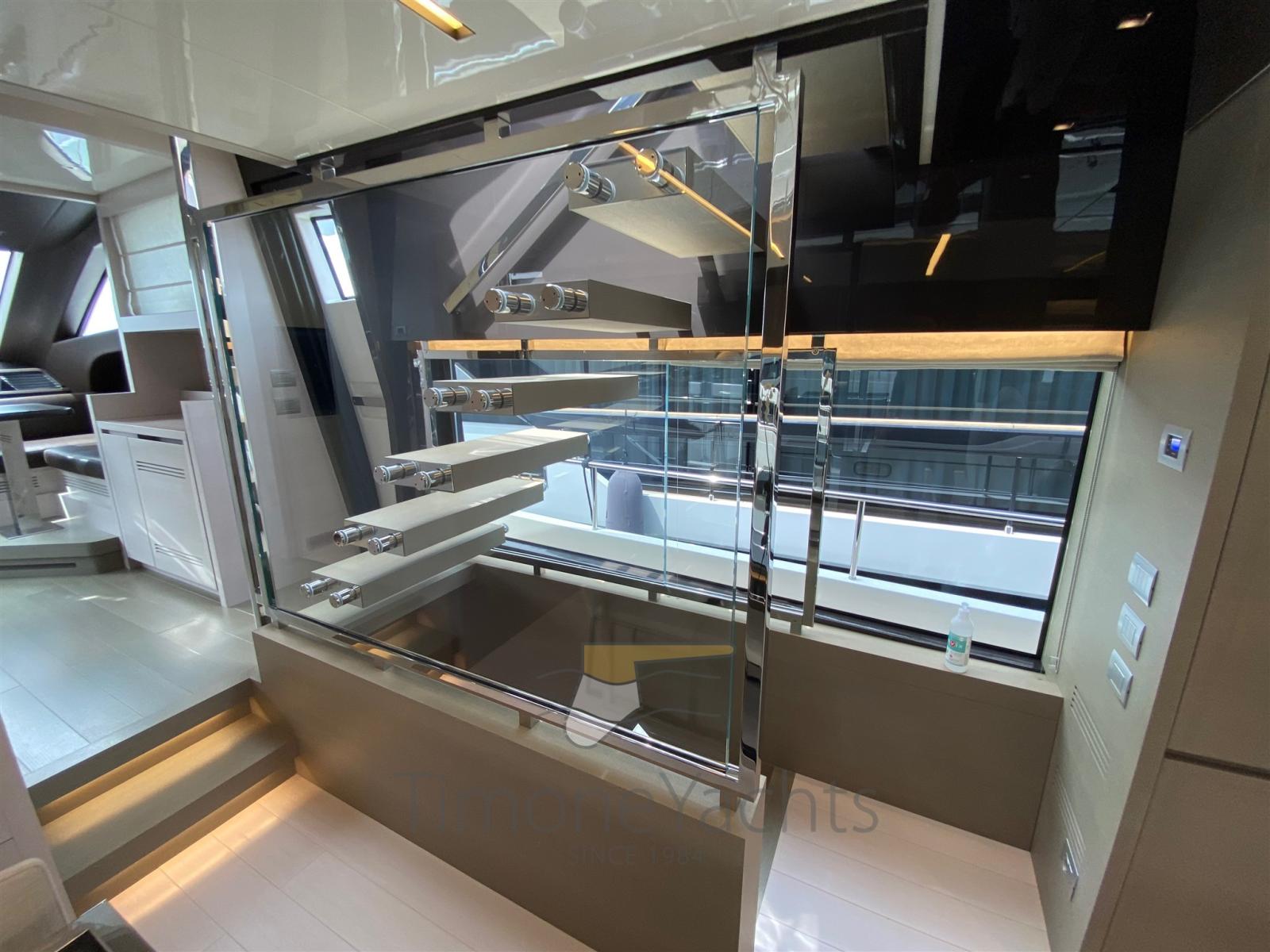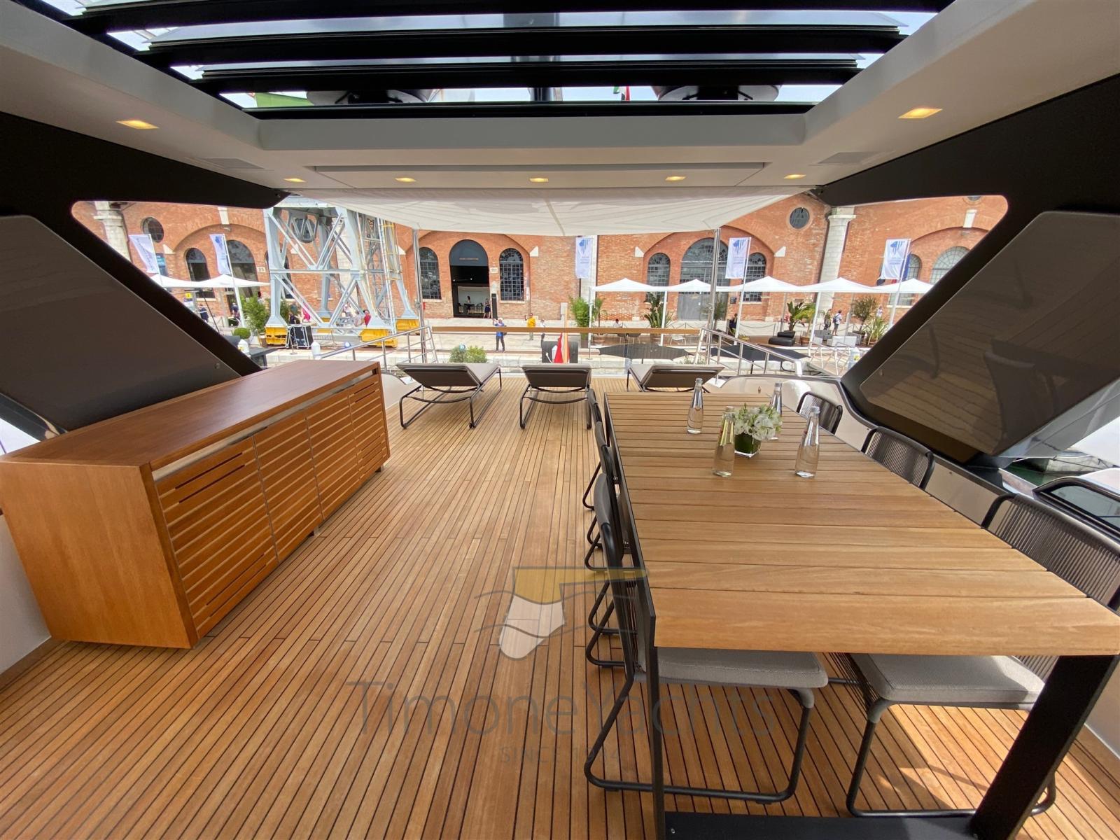 Camminamenti laterali in teak, Doccia esterna, Fari fissi a poppa, Faro orientabile, Flap idraulici, Garage per tender, Hard top, Impianto antincendio, Indicatori Flaps, Lavaggio catena, Luci di cortesia, Luci subacquee, Passerella, Porta laterale, Pozzetto Teak, Presa 220V banchina, Presa acqua banchina, Selle per Tender, Stabilizzatori, Tender, Tromba, 2 Winch tonneggio di poppa, Winch tonneggio di prua.
