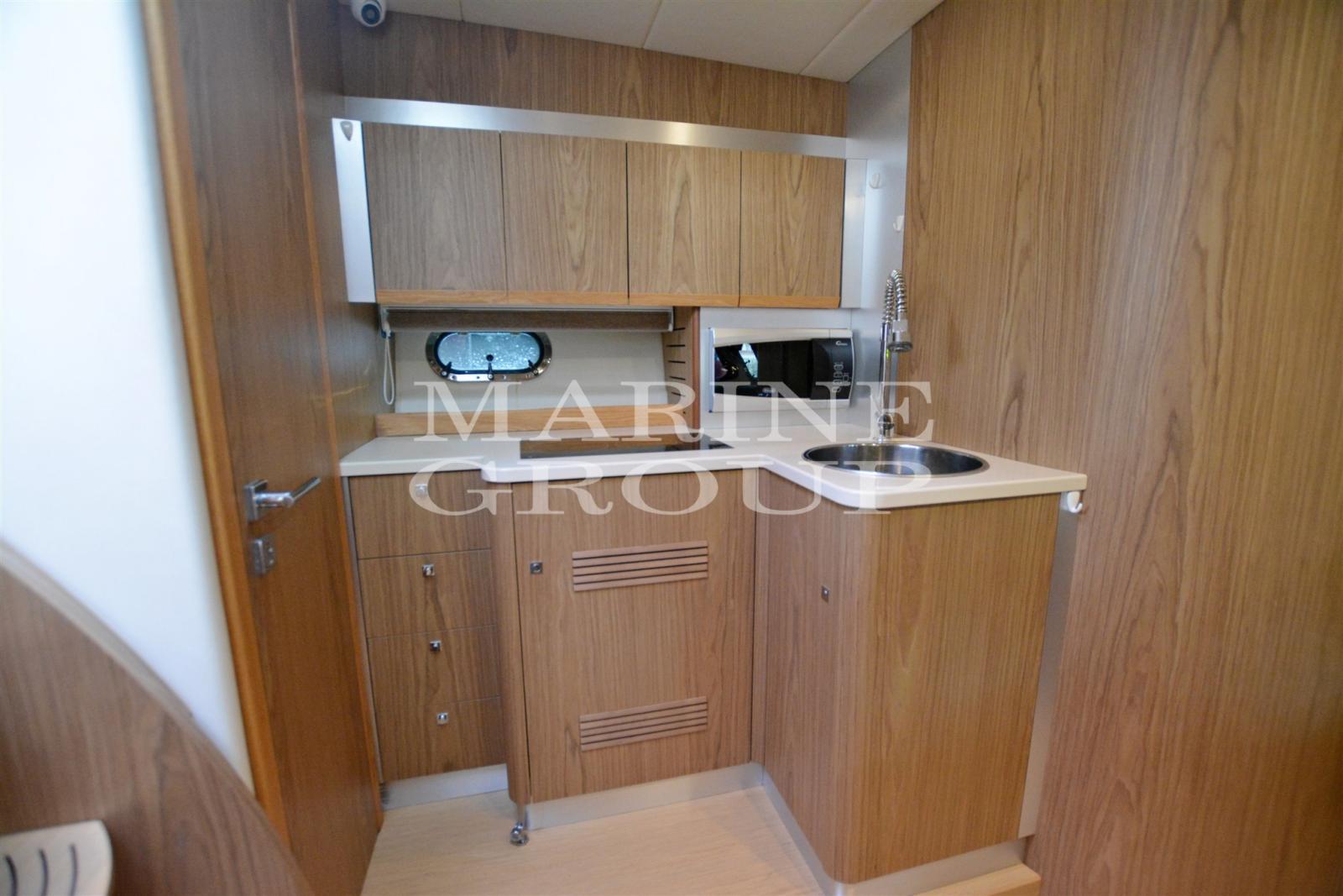 Parquet pozzetto coperto, salone e cabine; Ampia dinette trasformabile con sofa a "C"; Cucina attrezzata con lavello, frigo, forno microonde e piastra elettrica; Cabina armatoriale a prua con bagno e box doccia separato; Cabina ospiti a centro barca lato sx con letto matrimoniale; Cabina ospiti a centro barca lato dx con letti singoli trasformabile in matrimoniale; secondo bagno con wc e doccia.