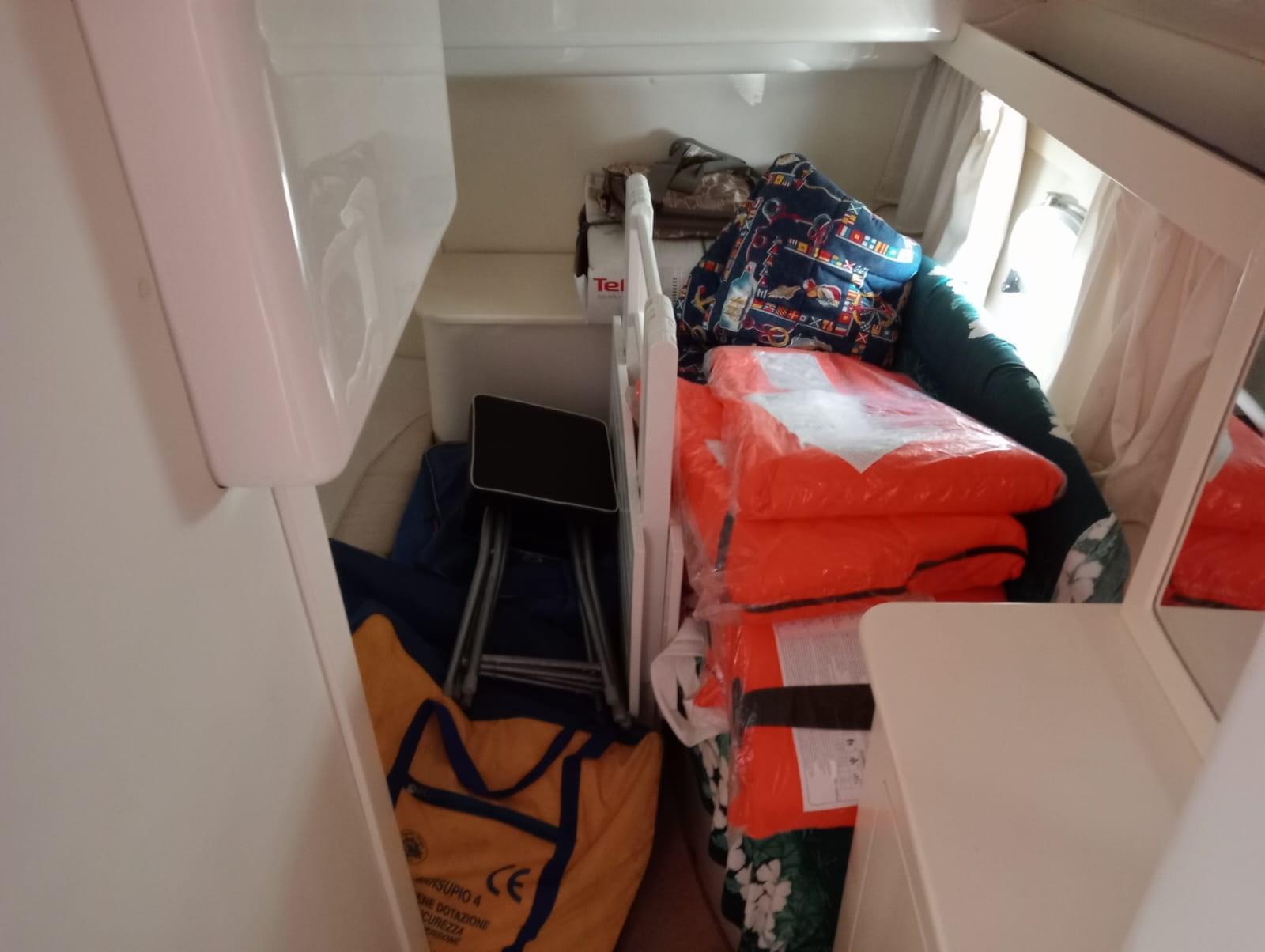 Barometro, Cassetta di pronto soccorso, Dotazioni di sicurezza entro 6 miglia, Giubbetti di salvataggio, Salvagente anulare con cima munita di boetta luminosa, Zattera di salvataggio (da revisionare).