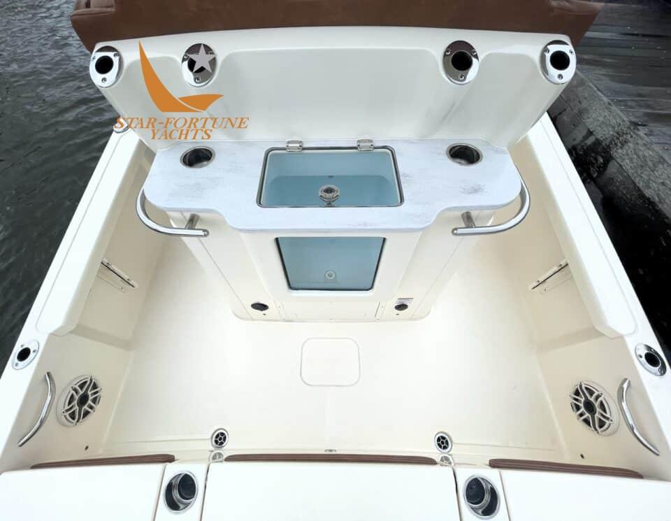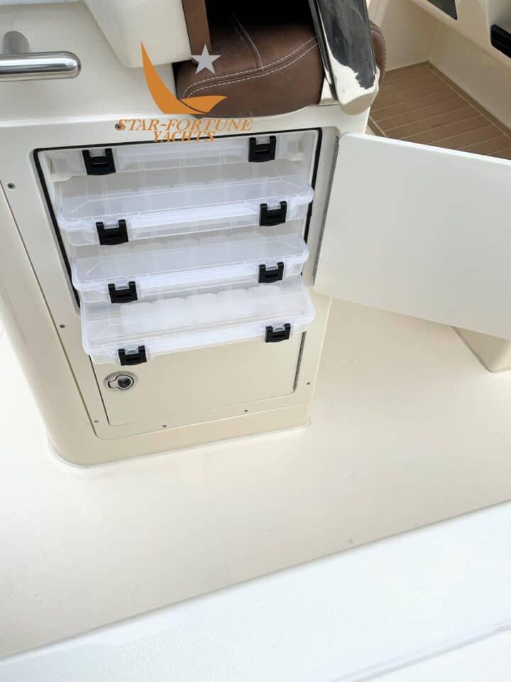 È possibile passare dal poggiapiedi standard con cella frigorifera al poggiapiedi con vasca del vivo aerata in fibra di vetro con due sedili di guida con cuscini ribaltabili, cestino, stivaggio per l'attrezzatura, portacanne e piano di lavoro in Corian; oltre a luci subacquee aggiuntive, lavaggio con acqua dolce e non trattata, opzioni per stabilizzatori, Power-Pole e motore elettrico e un bagno chimico.
