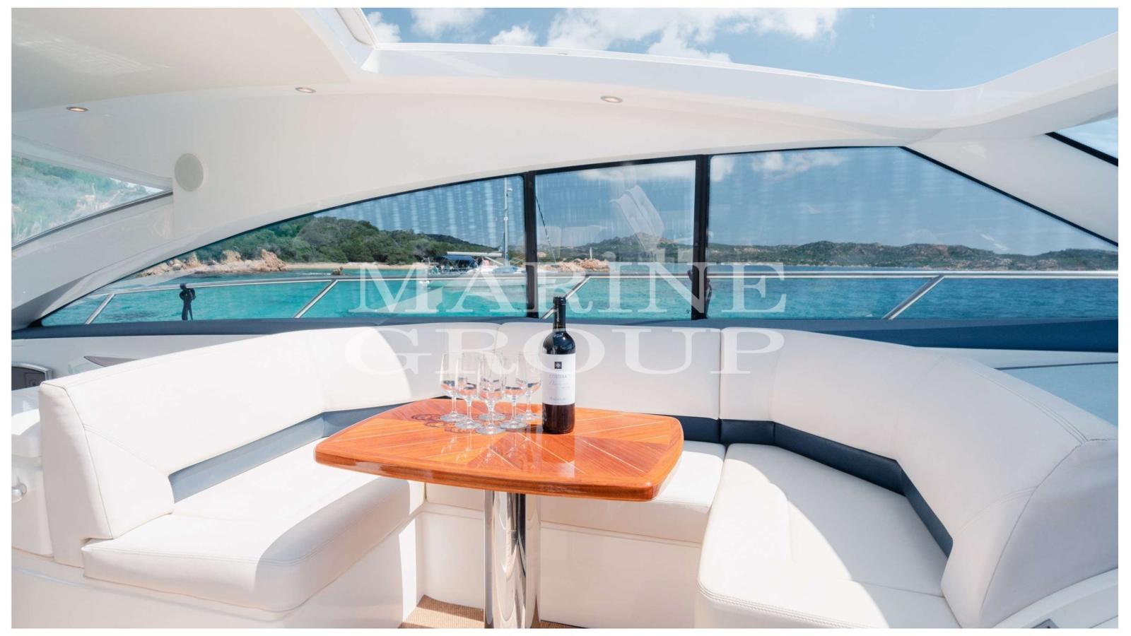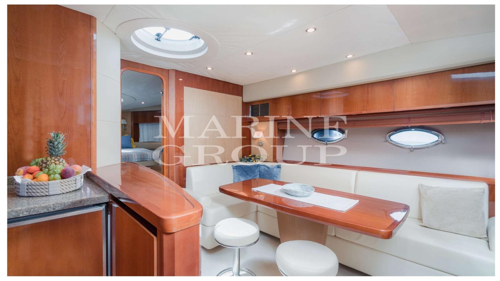 Interni in essenza di ciliegio chiaro lucido; parquet di Rovere; Ampia dinette con divano a "C" e tavolo centrale; Cucina a "L" completamente attrezzata; Cabina armatoriale a prua con bagno ensuite; Cabina di poppa con due letti singoli in piano; Seconda cabina di poppa con letti singoli a castello; Secondo servizio con box doccia.