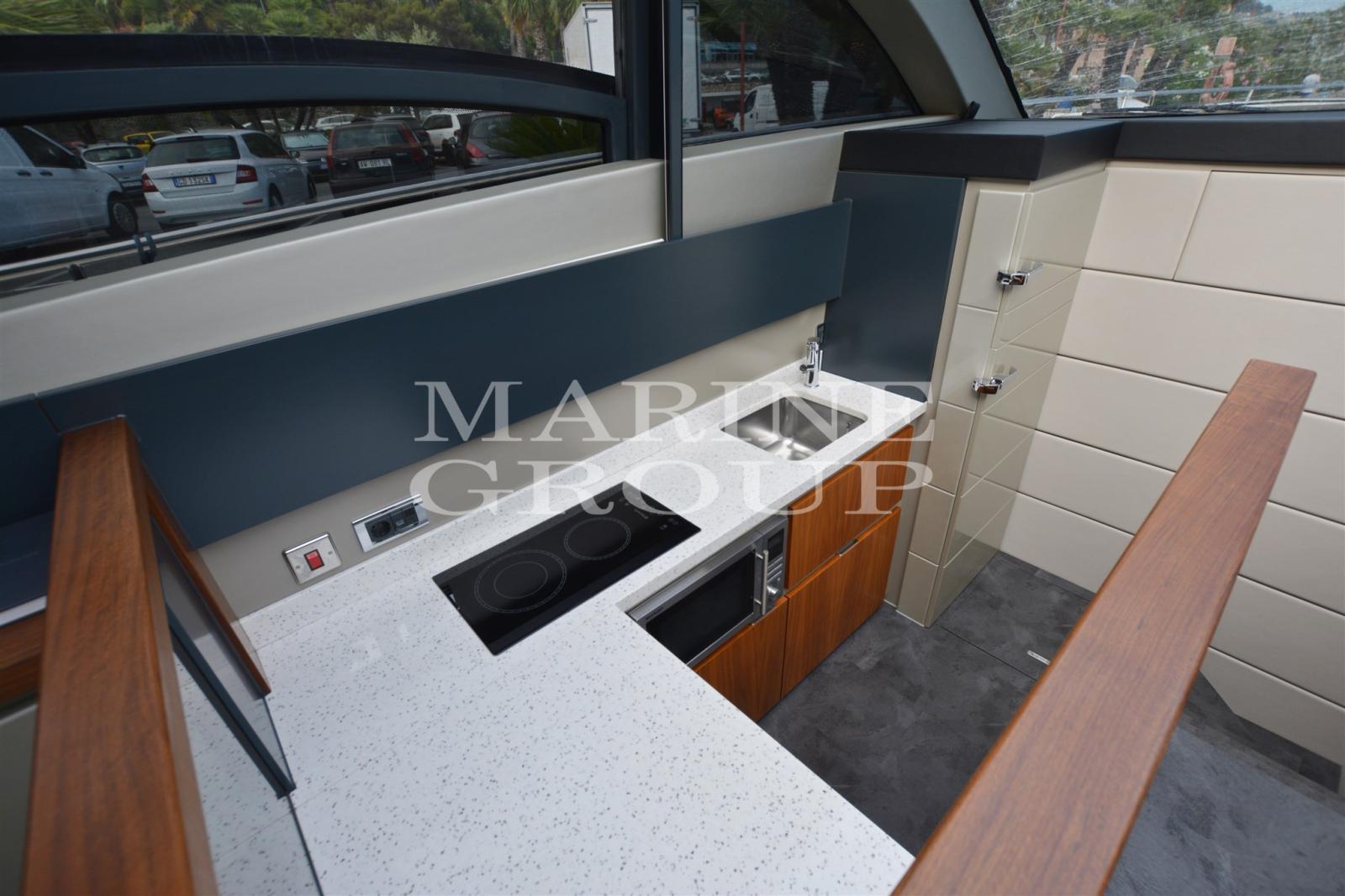 Grande salone con porte apribili e finestrature laterali a scomparsa elettricamente - Cucina equipaggiata con frigo a colonna e piastra vetroceramica - Enorme cabina armatoriale a prua con bagno ensuite - Cabina ospiti con letti doppi convertibili in matrimoniale - Cabina ospiti con letti doppi singoli - Bagno ospiti