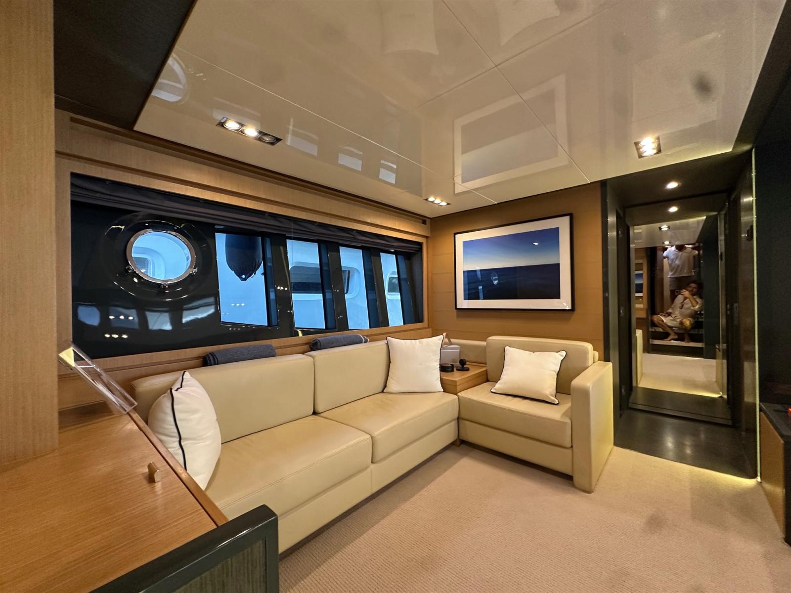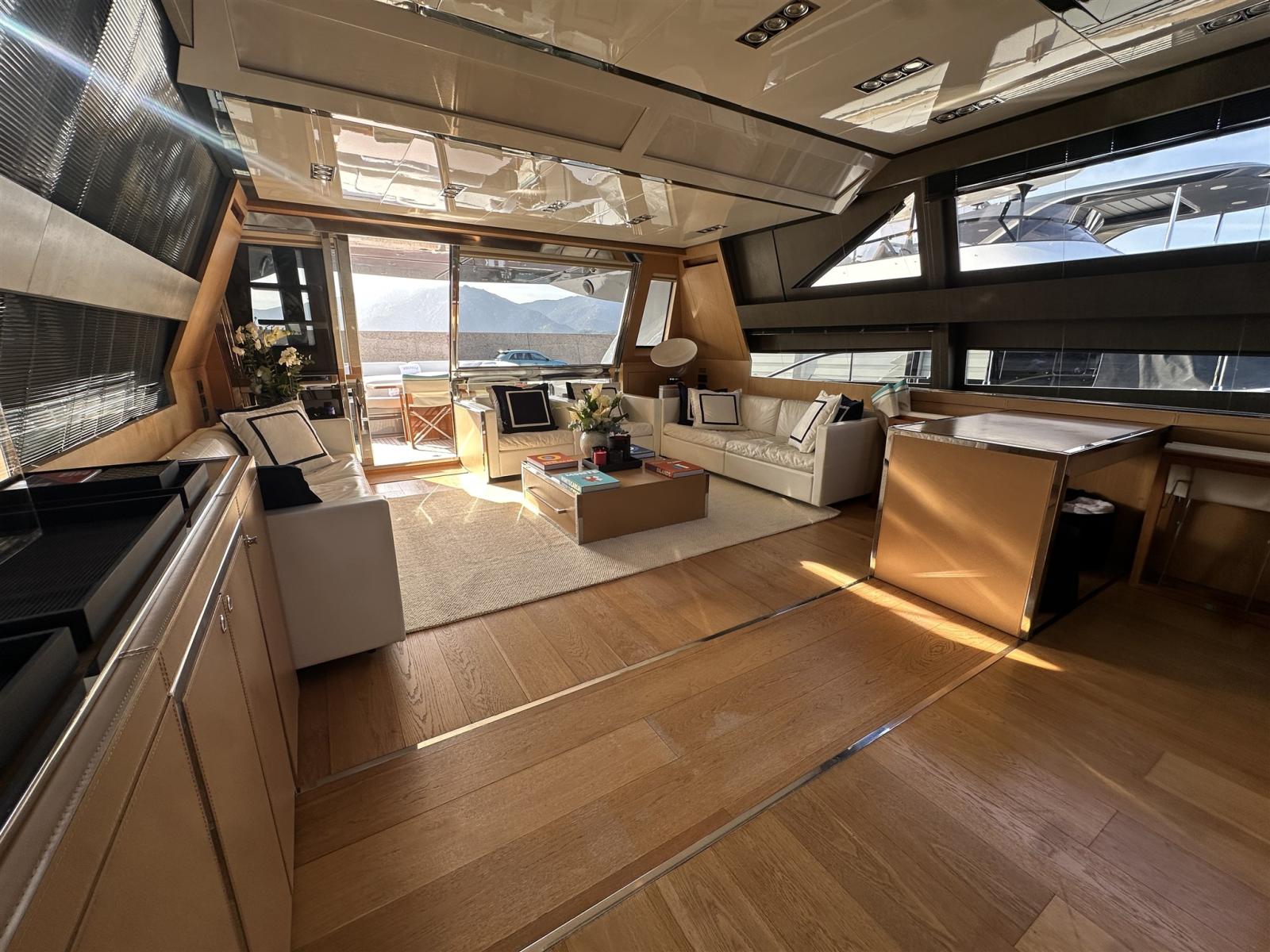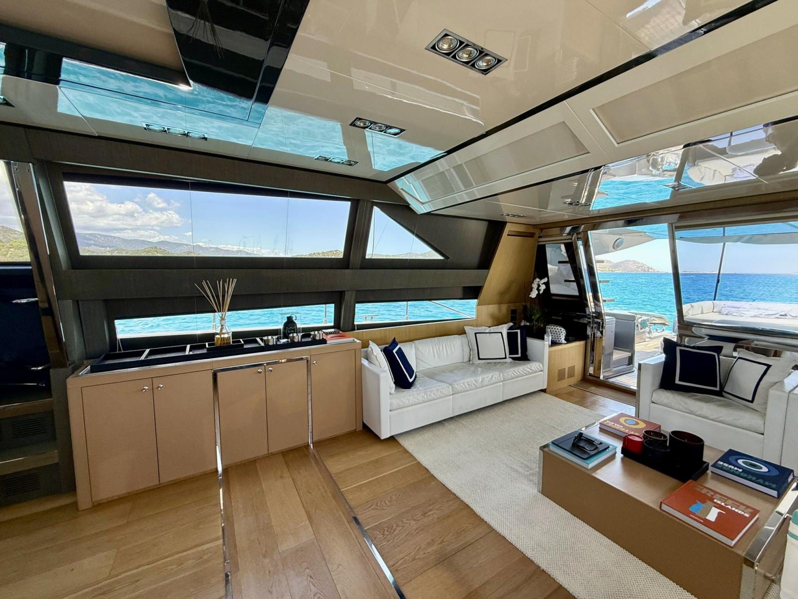 Gli ambienti interni, luminosi ed eleganti, sono arredati con legni chiari in noce canaletto, pelle color cioccolato e laccature bianche, per un'atmosfera calda e sofisticata. L’ampio open-space che unisce salone superiore e dinette è separato dalla zona di comando da un grande schermo TV, soluzione che garantisce privacy ma lascia filtrare una splendida luce naturale attraverso le ampie vetrate laterali e il parabrezza.