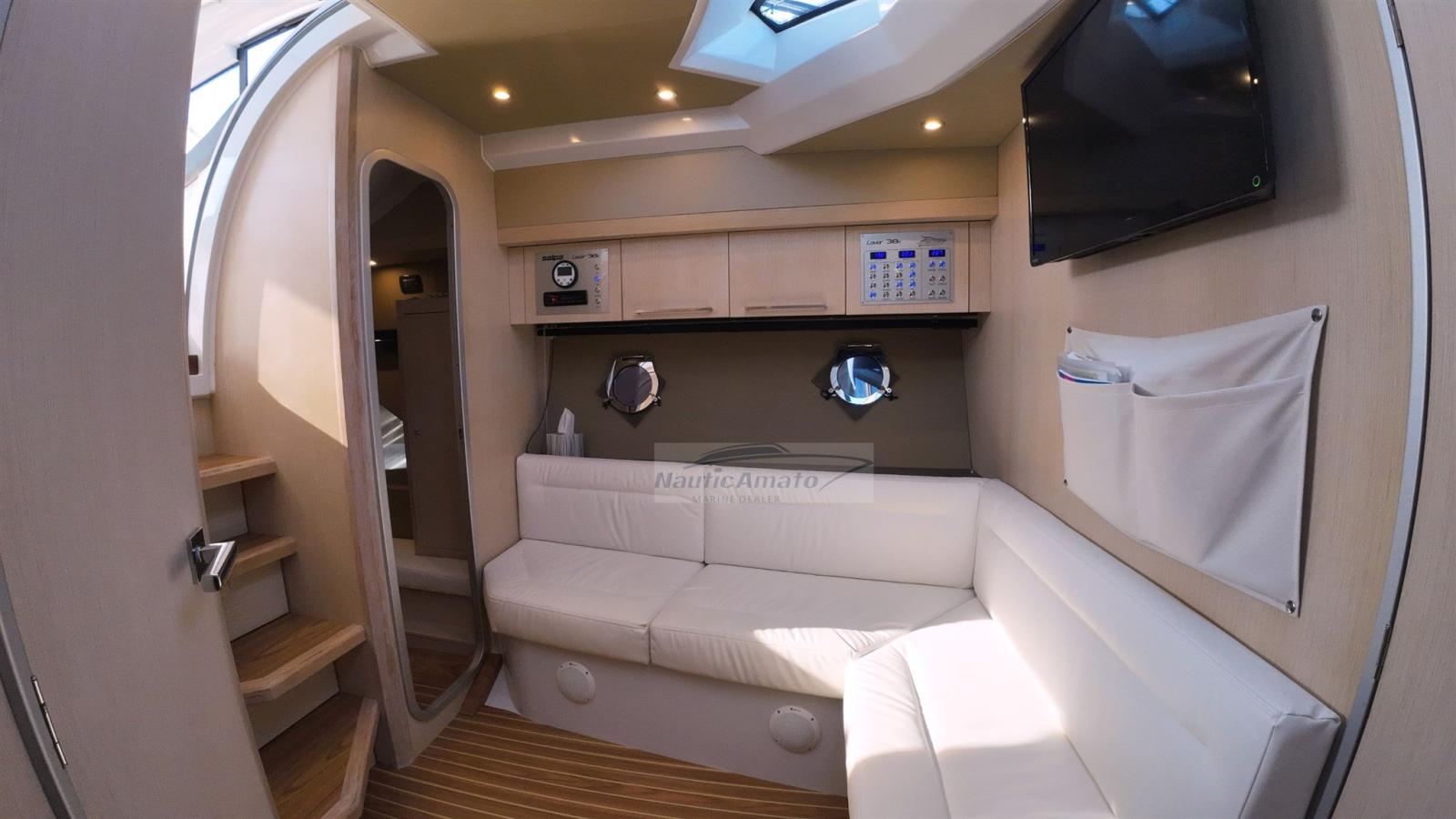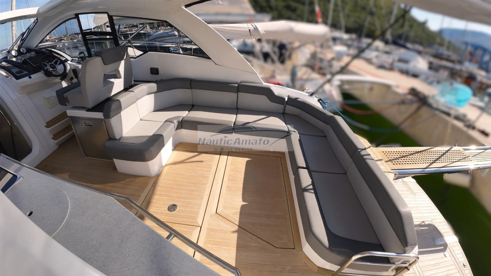 Tante le soluzioni intelligenti adottate, tra cui uno dei più grandi pozzetti esterni della categoria, pensato con un generoso divano a “C” da 8 posti integrabile con un tavolo a comando elettro-pneumatico che alla necessità e grazie ad un prolunga ed un cuscino (non presente), diventa un grande prendisole di poppa che va ad aggiungersi a quello già molto generoso di prua, pensato anche con gli schienali reclinabili!