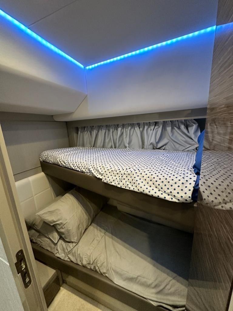 Aria condizionata (TROPICALE), Boiler, Clima reversibile, Impianto acque nere, Prese interne 12v, Prese interne 220v, Serbatoio Acque Nere, Telecamera (SALA MACCHINE E POPPA), WC marino elettrico.