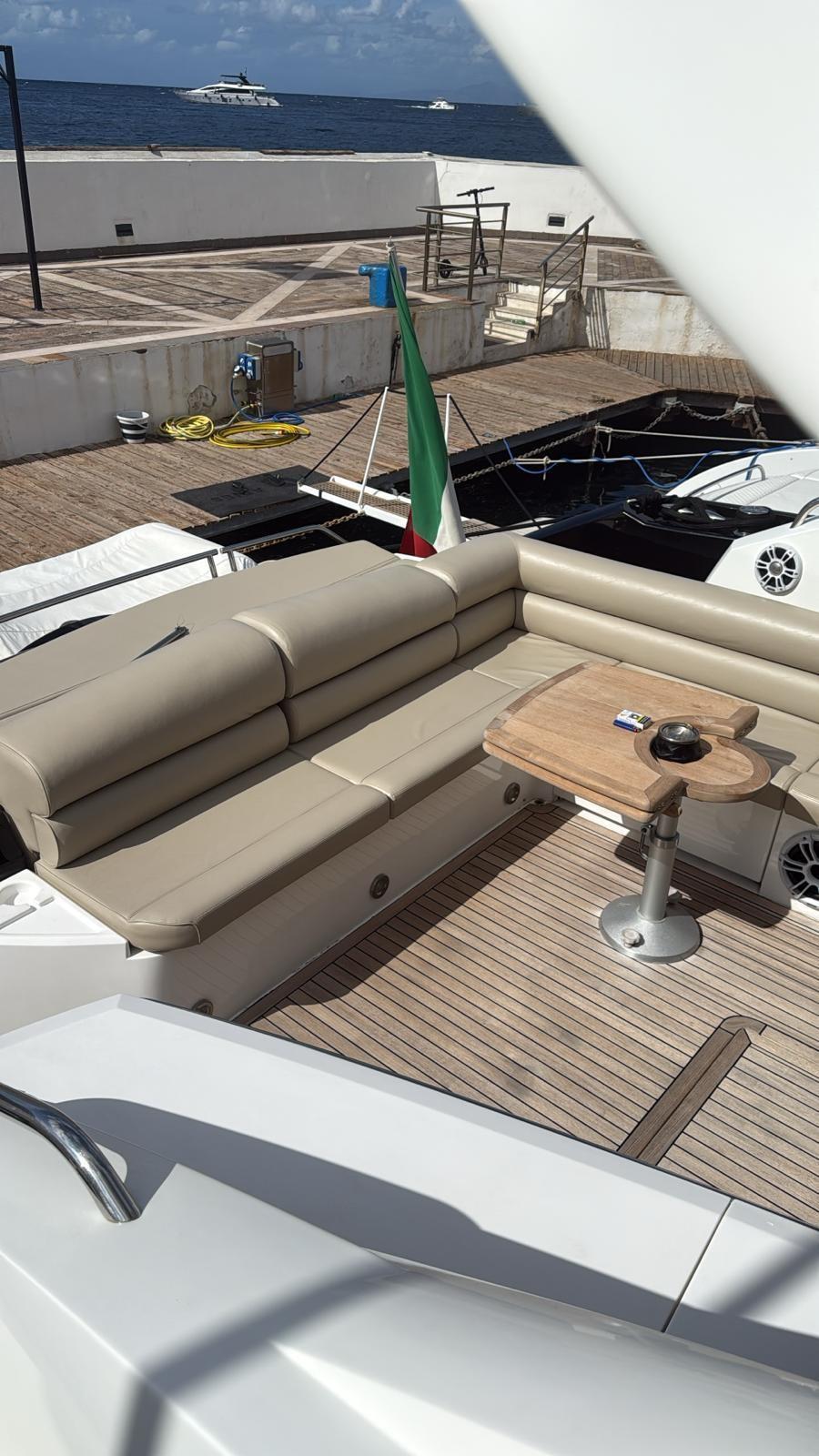 Allarme motore, Allarme sentina, Alternatore, Autoclave, Doccia esterna, Flap idraulici, Hard top, Impianto antincendio, Indicatori Flaps, Luci di cortesia, Luci subacquee, Parabordi, Passerella, Piattaforma, Pompa di sentina automatica, Pompa di sentina manuale, Ponte in teak, Porta ingresso, Pozzetto Teak, Presa 220V banchina, Presa acqua banchina, Salpa Ancore Elettrico, Selle per Tender, Tavolo pozzetto, Tromba, Winch tonneggio di poppa, Winch tonneggio di prua.