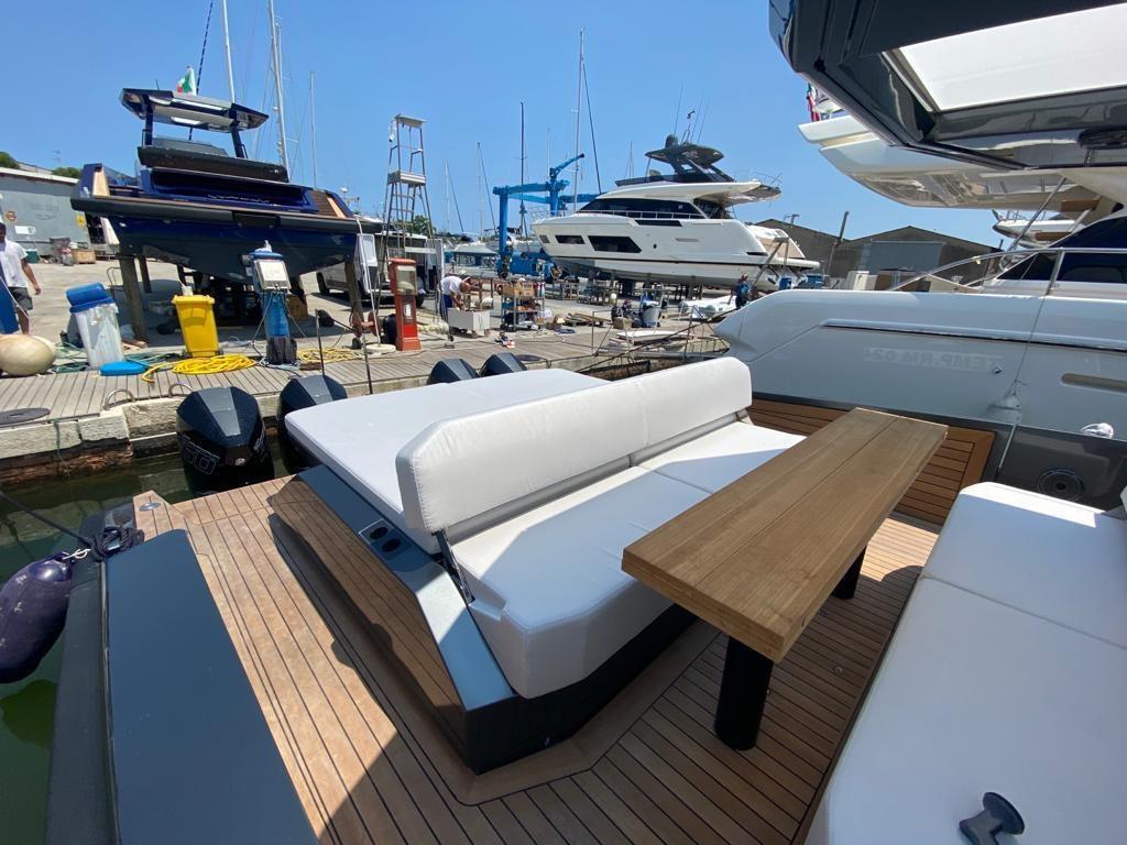 Allarme motore, Allarme sentina, Autoclave, Camminamenti laterali in teak, Doccia esterna, Faro orientabile, Flap idraulici, Hard top, Impianto antincendio, Indicatori Flaps, Luci di cortesia, Luci subacquee, Passerella, Pozzetto Teak, Presa 220V banchina, Salpa Ancore Elettrico, Scaletta da bagno, Tavolo pozzetto.