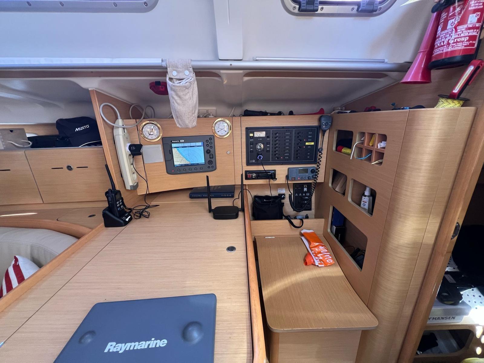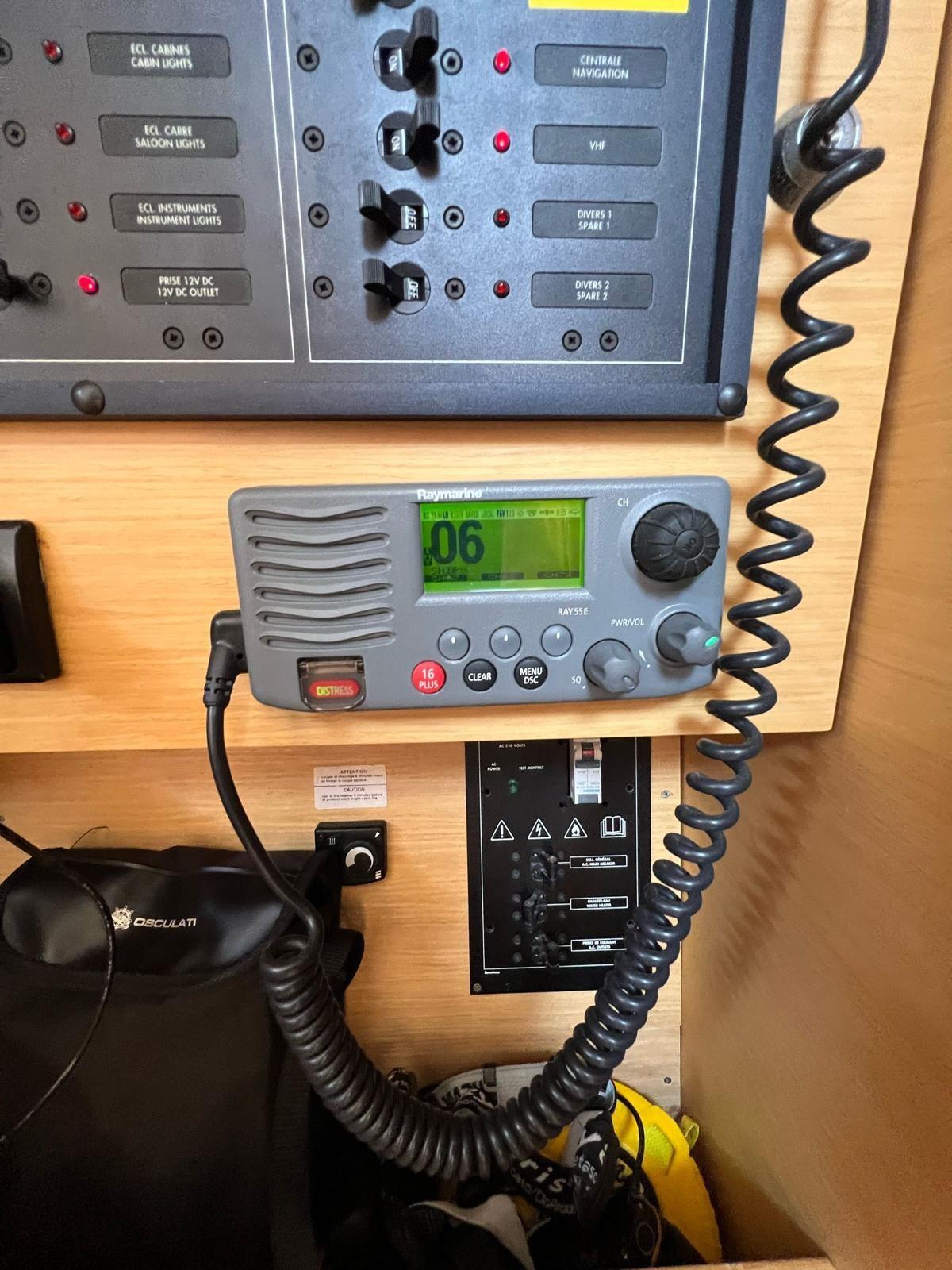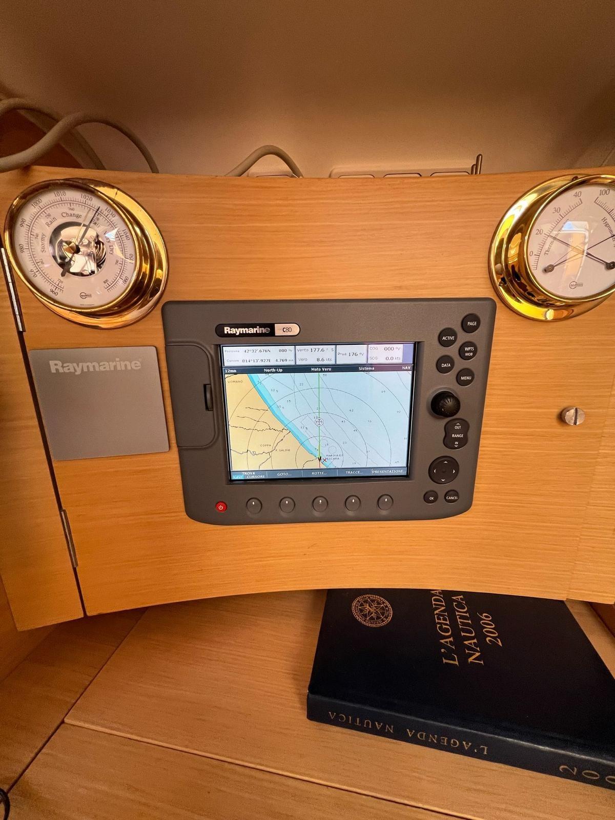Plotter (Raymarine Axiom 7" in pozzetto / Raymarine C80 interno), Radio VHF (Raymarine).