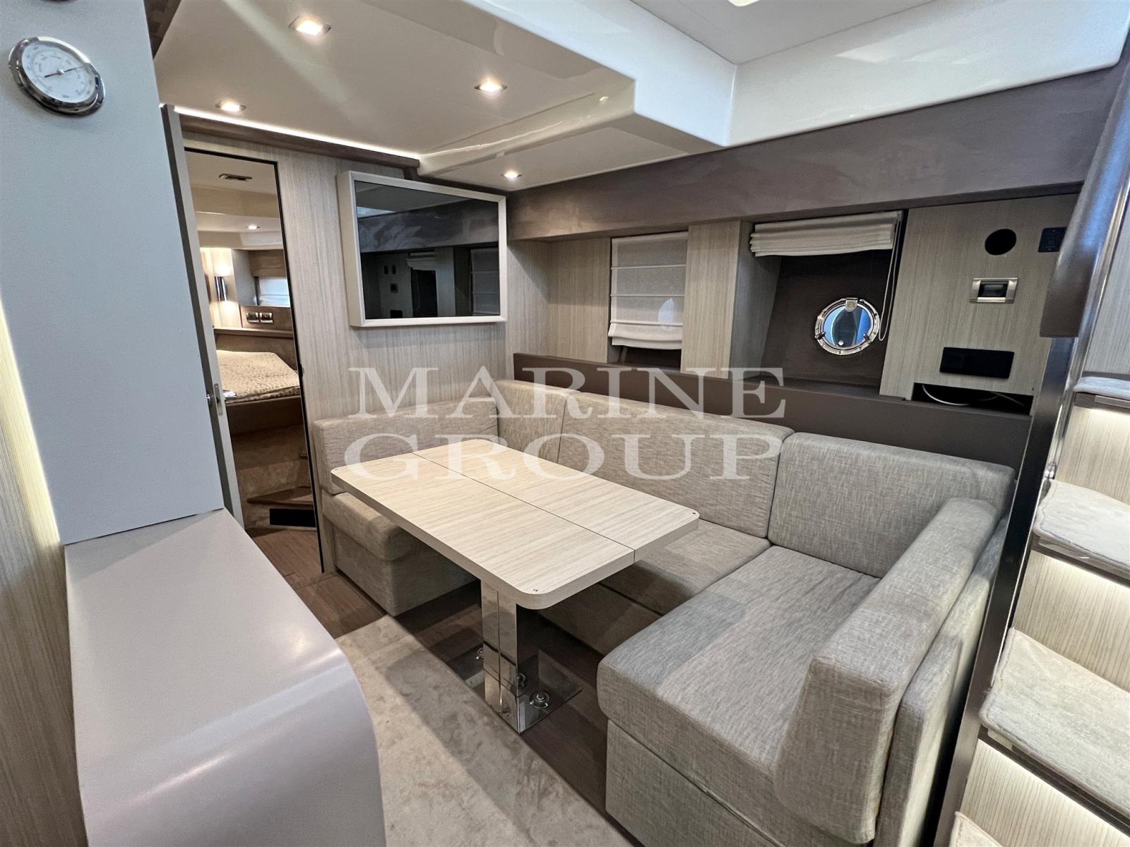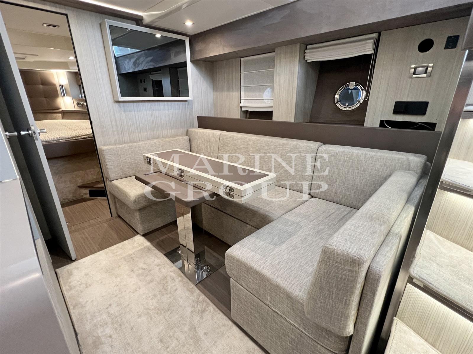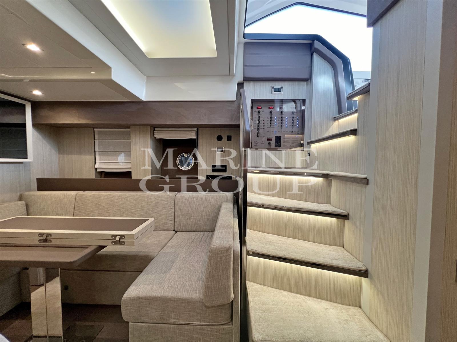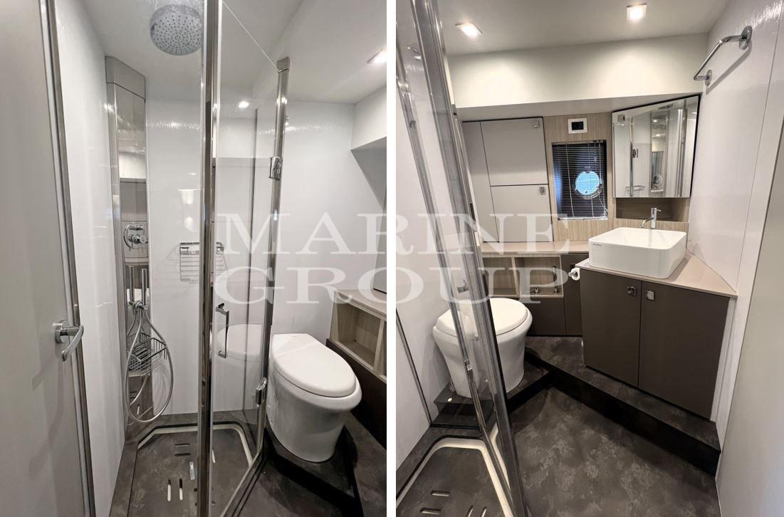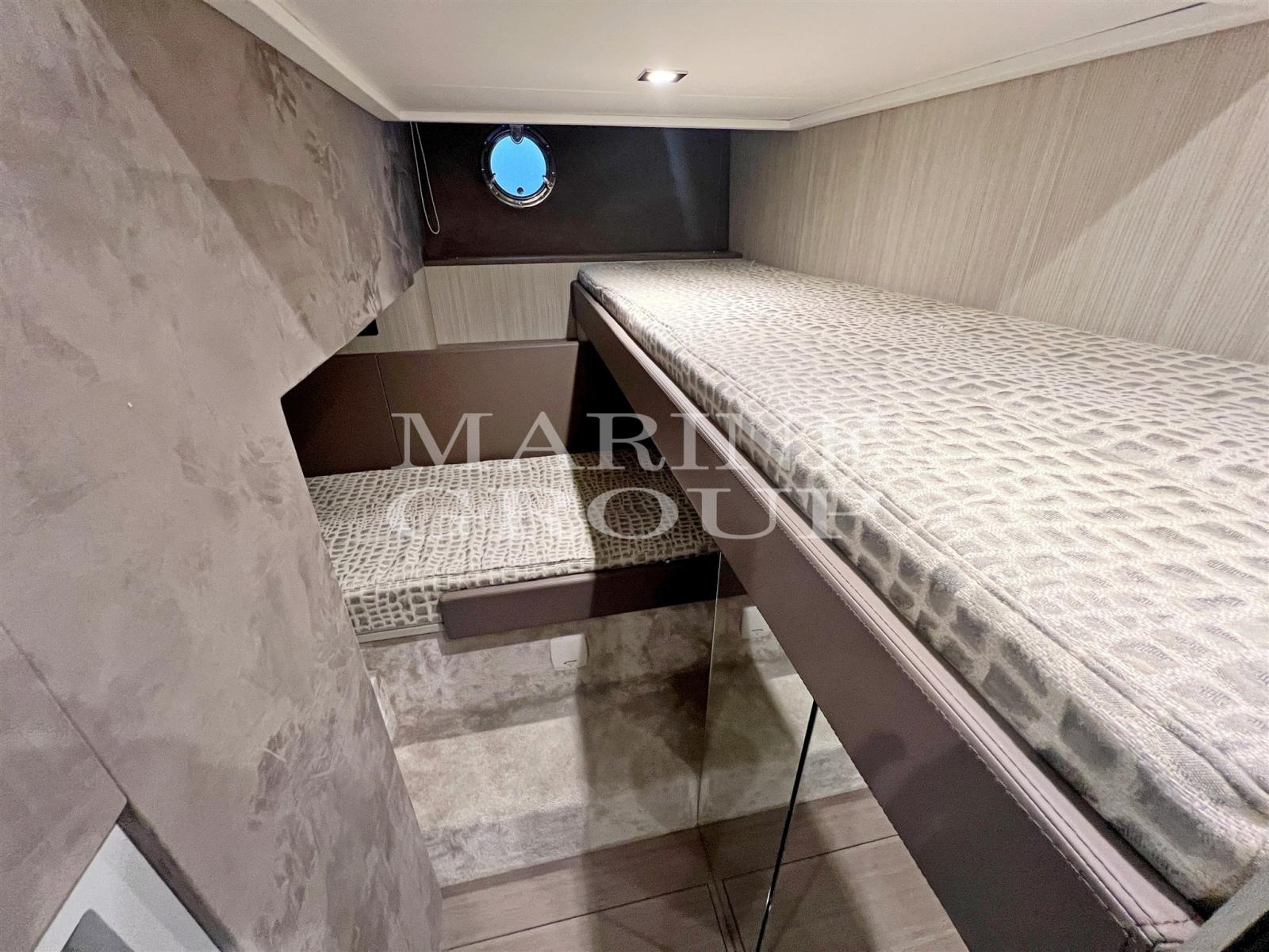 Sottocoperta tutto rinnovato con il pregevole tocco di Christian Grande; Cucina con penisola completamente attrezzata; ampia dinette a "U" contrapposta; cabina armatoriale a poppa a tutto baglio con letto matrimoniale e bagno ensuite completo di box doccia separato; cabina VIP a prua con letto matrimoniale e accesso diretto al secondo bagno completo; cabina ospiti con letti singoli sovrapposti; cabina marinaio con servizio.