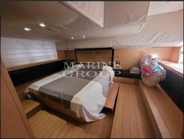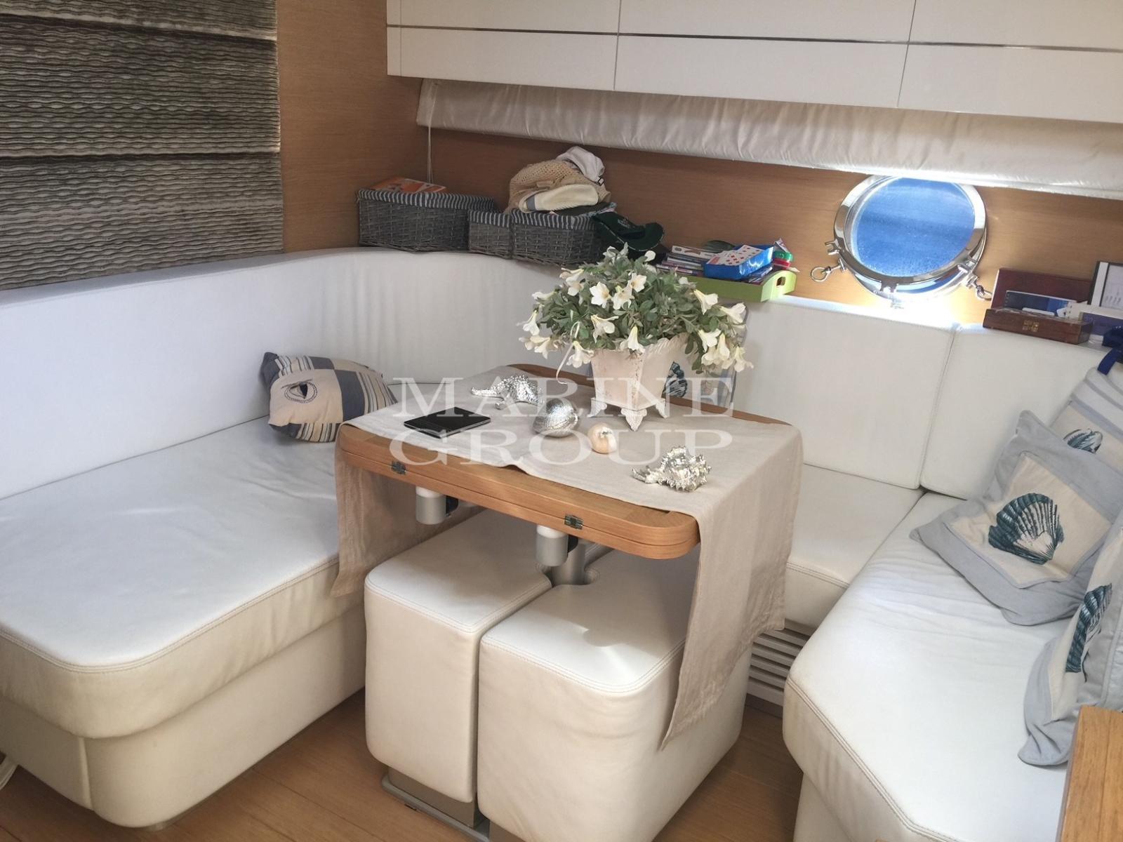 Interni in essenza di rovere; dinette con divano a C, cucina attrezzata con lavello fuochi ad induzione e frigo; cabina armatoriale a centro barca con bagno en suite con box doccia separato; cabina opsiti a prua con letto matrimoniale separabile in due letti singoli, secondo bagno completo di box doccia.