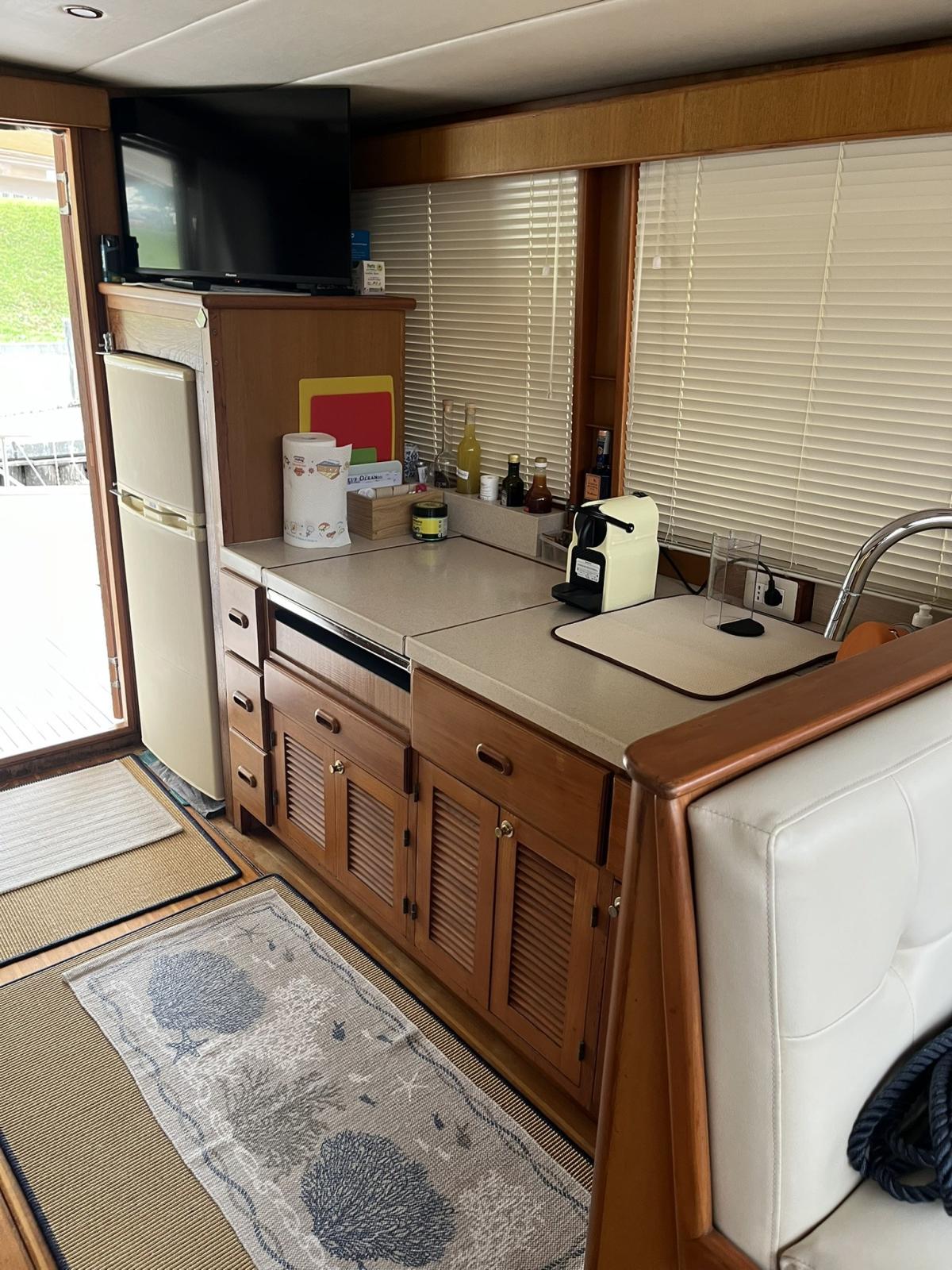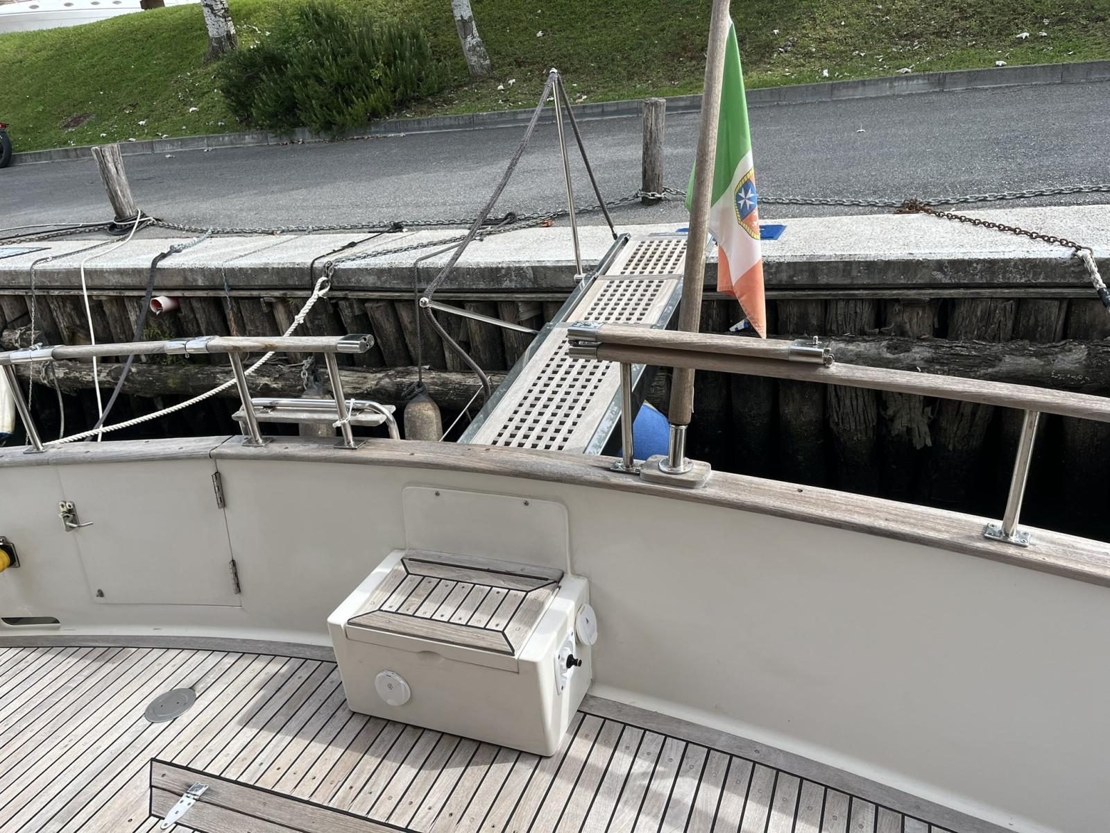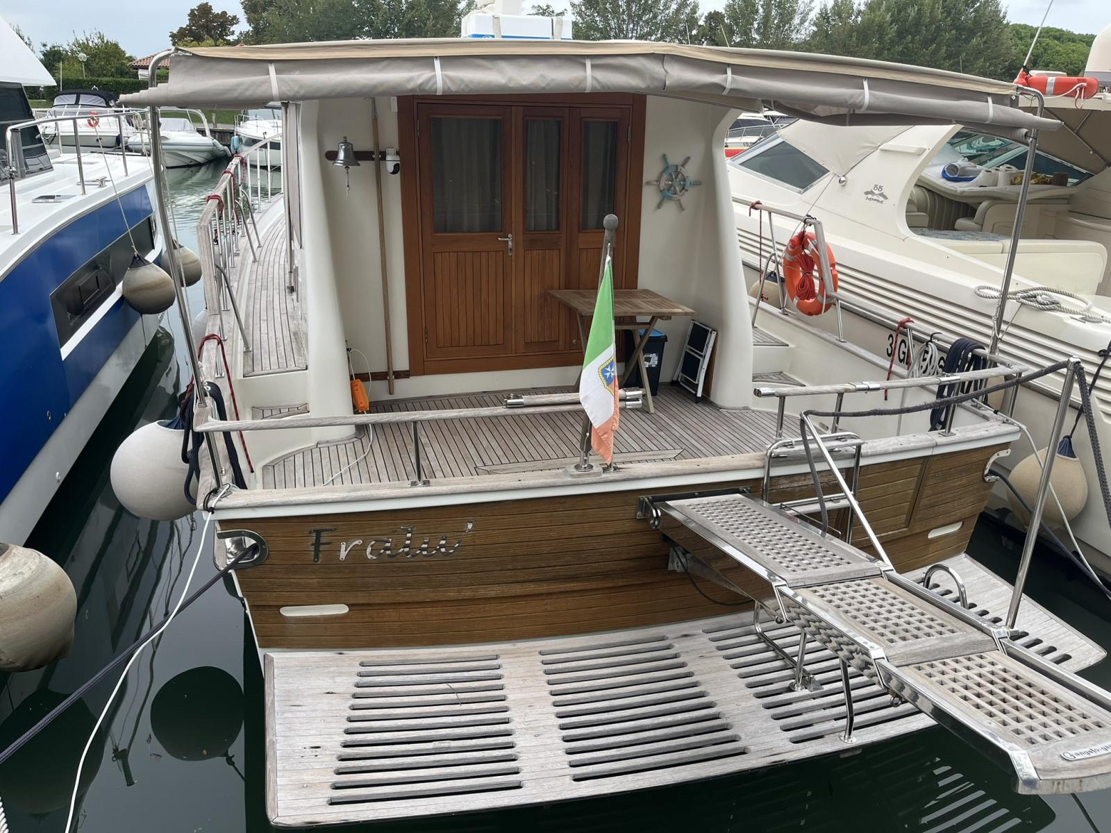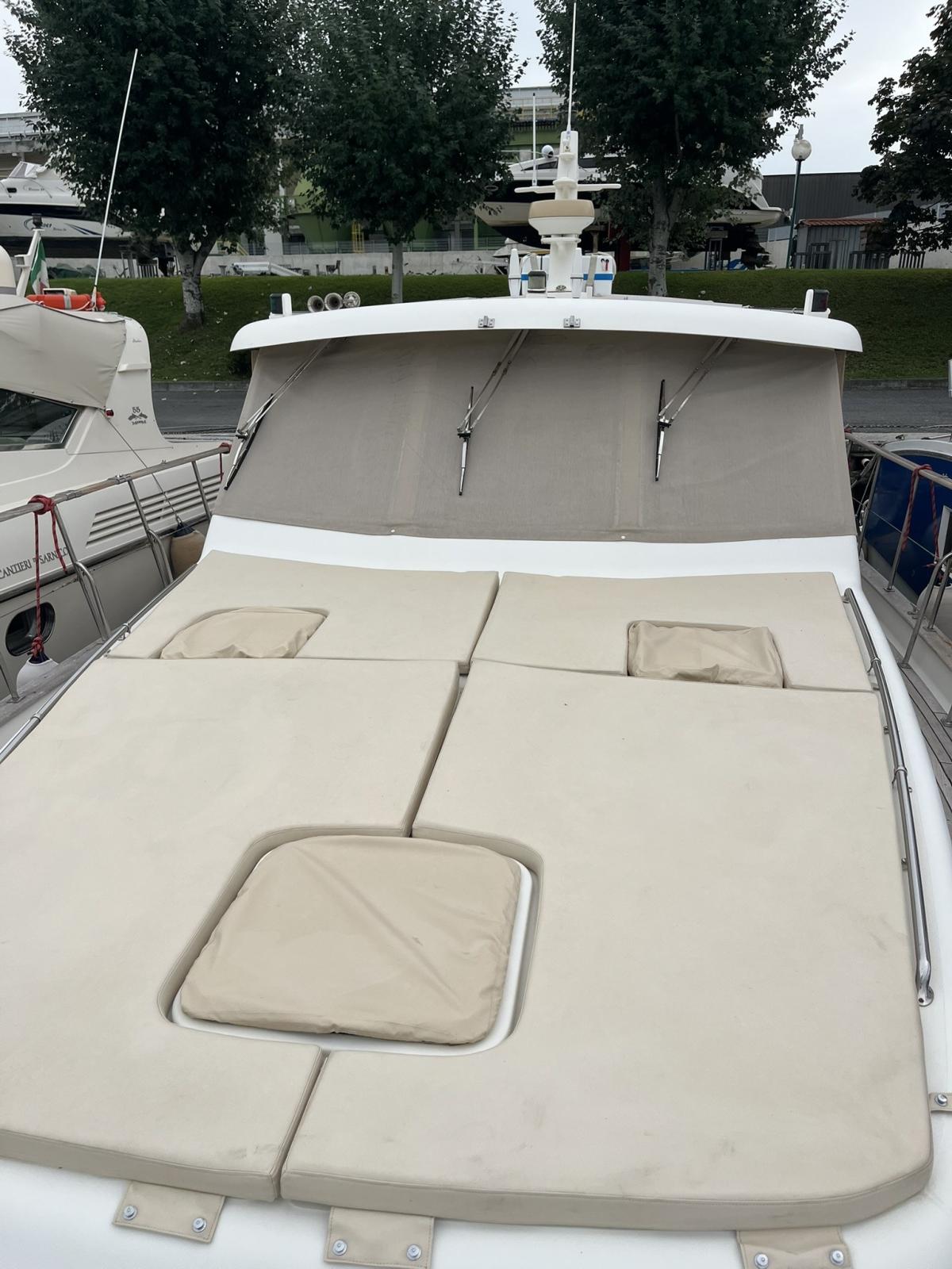 Dotazioni: Aria condizionata in dinette e nelle cabine, elica di prua, gruppo elettrogeno Mase 6kw, angolo barra, bussola, manette elettroniche, contamiglia, ecoscandaglio, GPS, Radar su secondo GPS, log, radio VHF, autoclave, wc marino Tecma elettrico, doccia esterna, elica prua, doppio comando salpaancora in plancia e a prua, passerella idraulica, flaps idraulici, impianto antincendio in sala macchine, sensori fuoco, temperatura e livello acqua sentina, piattaforma con scaletta bagno, pompe sentina automatiche, porte laterali, pozzetto e coperta in teak, presa 220 banchina, sistema combinato inverter, caricabatterie, pannelli solari e banchina victron, salpa ancore elettrico con doppio comando, winch tonneggio a poppa, prese interne 220 in ogni ambiente, stereo e altoparlanti, cucina a gas, microonde, frigo, ombreggianti laterali e posteriori in pozzetto, oscuranti vetri laterali e plancia estivi e invernali, tendalino copripozzetto, tender e motore Honda 2.3