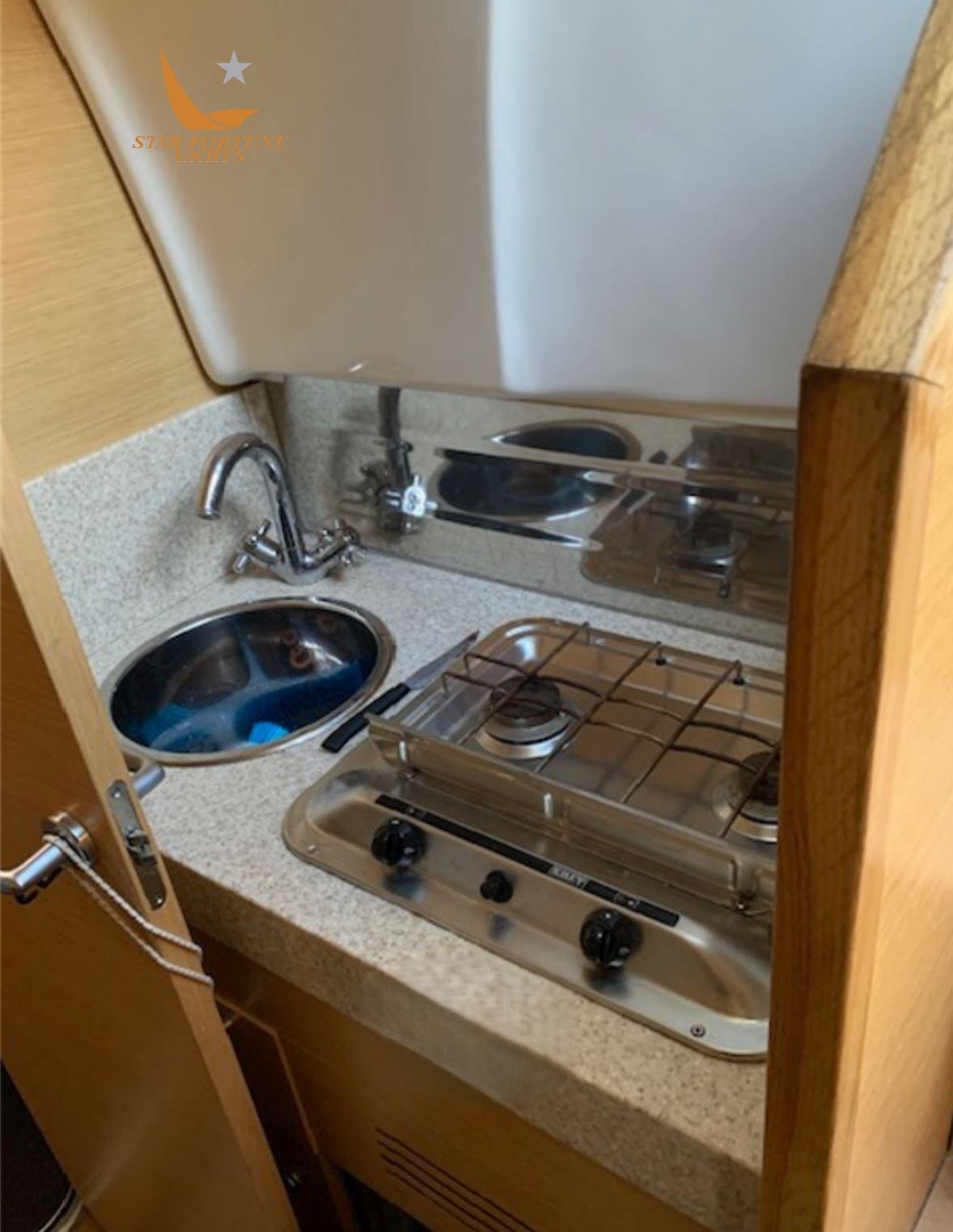 La cucina è dotato di 1 frigo, due fuochi a gas, lavello e forno a microonde. Il bagno ha lavabo, WC marino elettrico e spazio per la doccia.