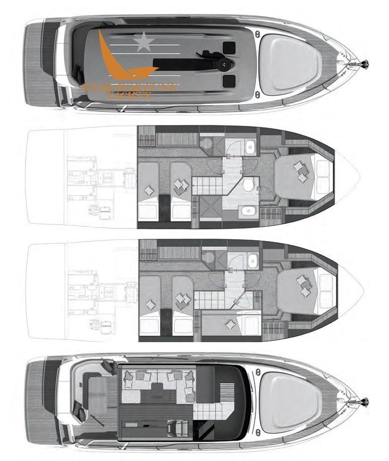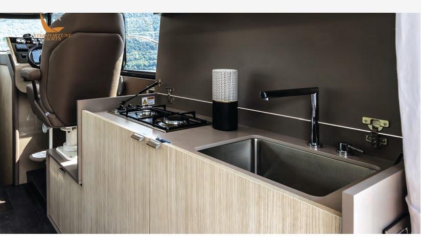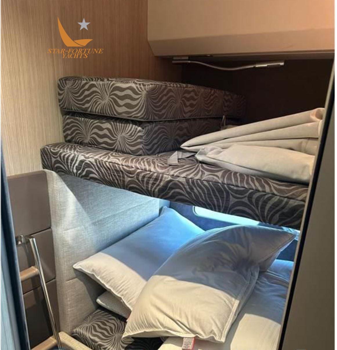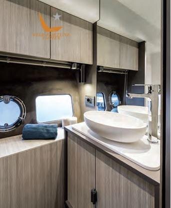 Tre cabine e 1 bagno con finiture di alta qualità, cucina attrezzata, dinette nel pozzetto, cucina esterna sulla plancetta e grandi aree prendisole.