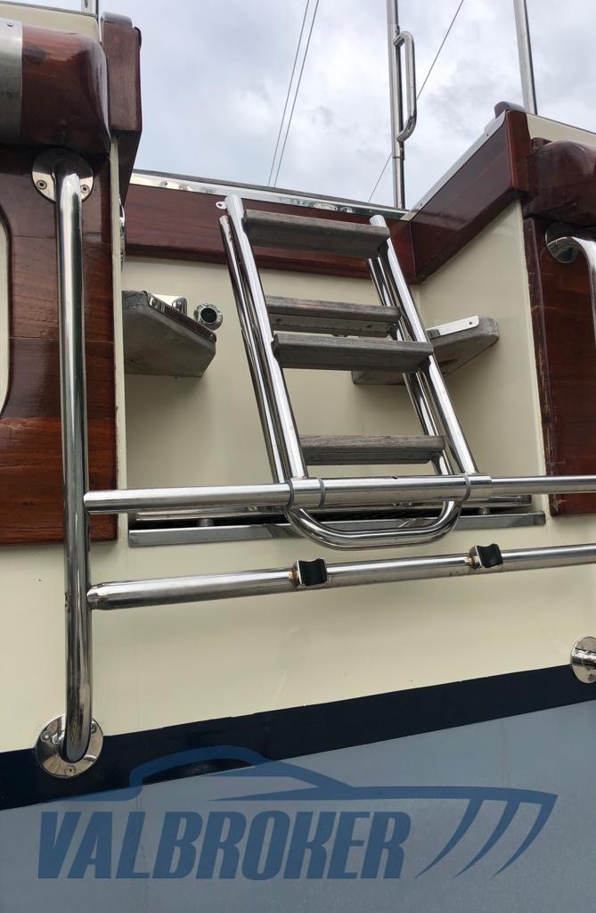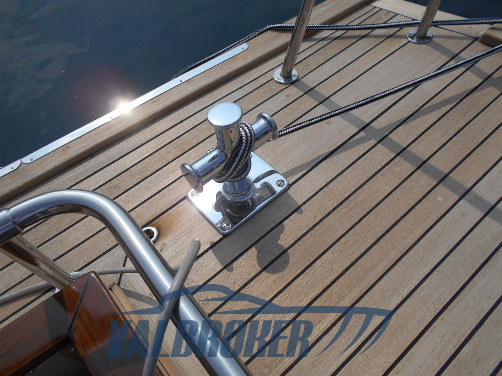 Lo scafo inglese costruito nell’Hampshire in plastica rinforzata con fibra di vetro nel 1975 di incredibile robustezza contiene all’interno tre serbatoi di gasolio che consentono una lunga autonomia di navigazione. È stato completamente ristrutturato dal 2011 al 2014: i motori Aifo sono stati revisionati e riverniciati . Lo scafo è stato riverniciato, nuovo ponte di Teak, tutti i profili in legno di mogano. L’impianto elettrico rifatto con le canaline in acciaio inox, nuova strumentazione RAYMARINE. Il locale motori insonorizzato, le nuove pompe di sentina, tutti i filtri gasolio ed acqua con tutte le nuove tubazioni, le linee d’asse rifatte. In coperta sono stati rifatti su misura in acciaio inox i tientibene mancanti sulla tuga e tutto il grande pulpito di prora, anche a poppa il nuovo passo uomo per accedere al locale timoni. Sono stati inoltre cromati tutti gli oblò ed in plancia sostituiti i vetri davanti includendo i nuovi chiarovisori per navigare anche con onda formata.