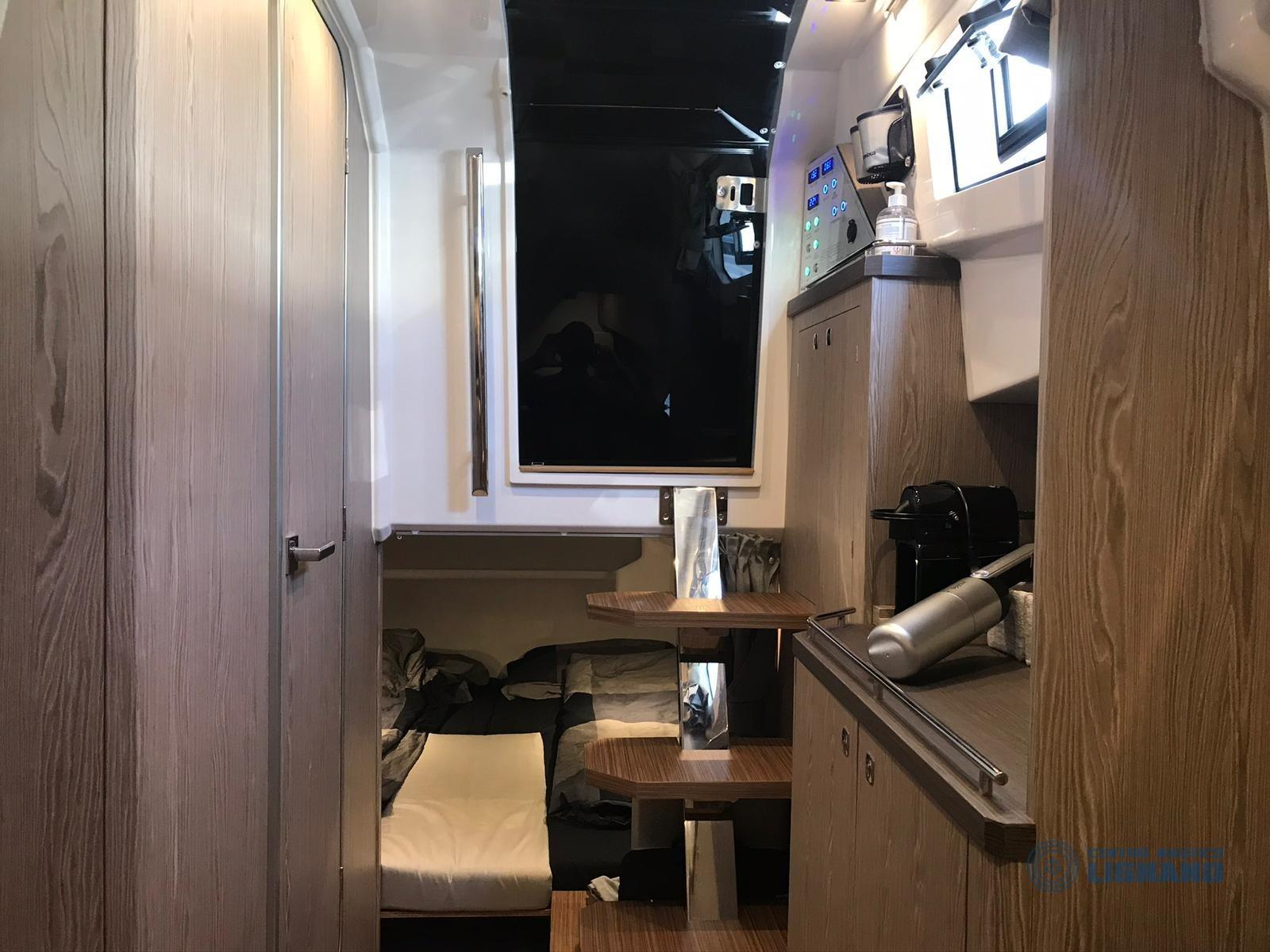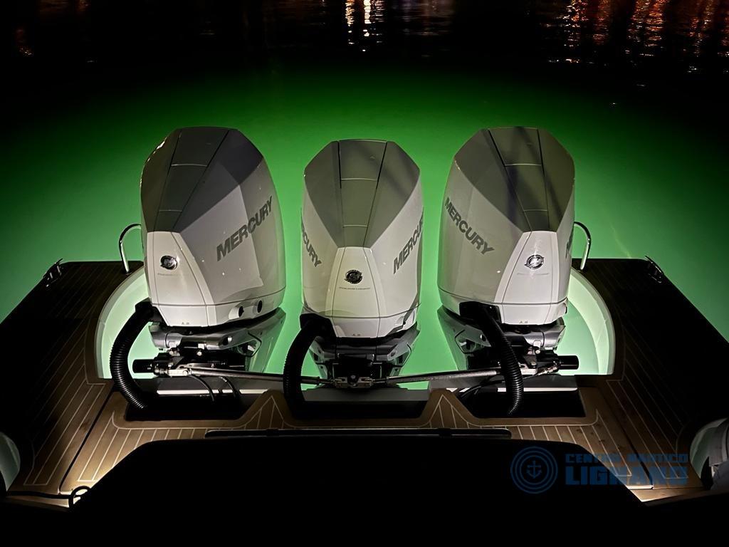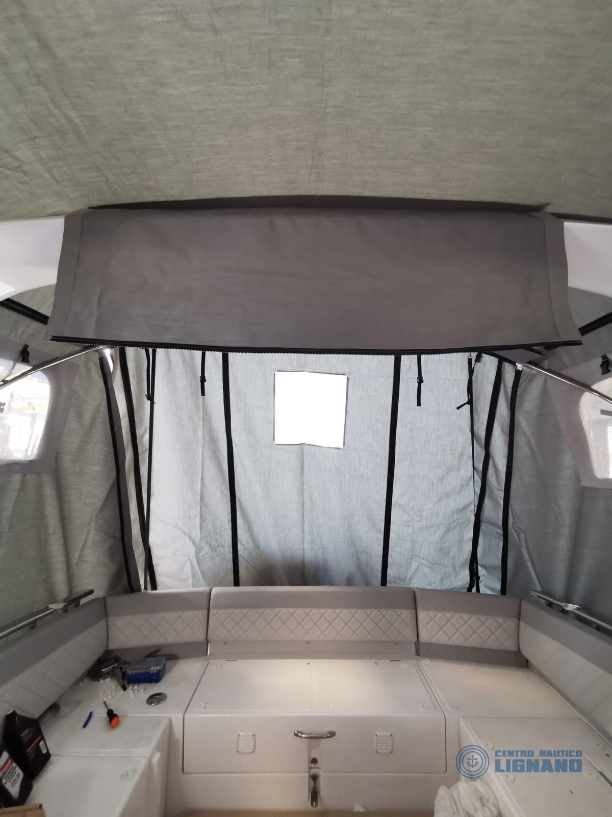 sedile copilota, inverter Master AC 12/1500, subwoofer Fusion, amplificatore Fusion, cucina esterna con lavello acqua calda/fredda, fornello con due fuochi a gas, frigorifero 90 litri, oscuranti frangisole, tenda nautica TOTALE, tendalino supplementare antipioggia.