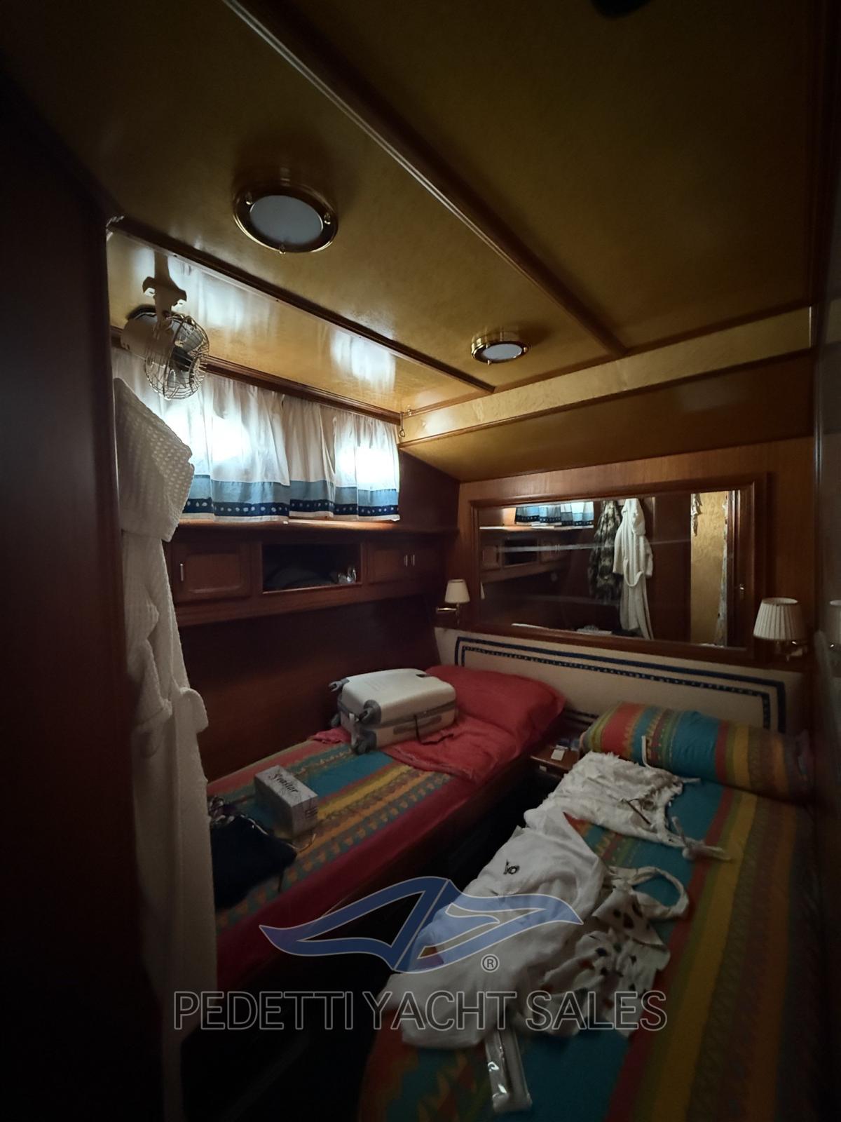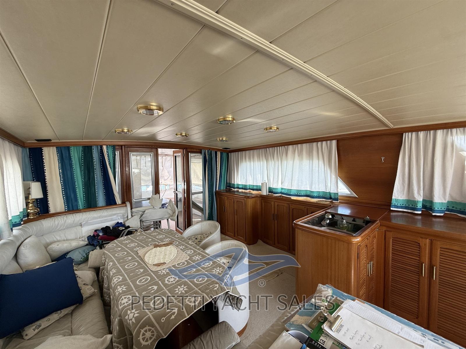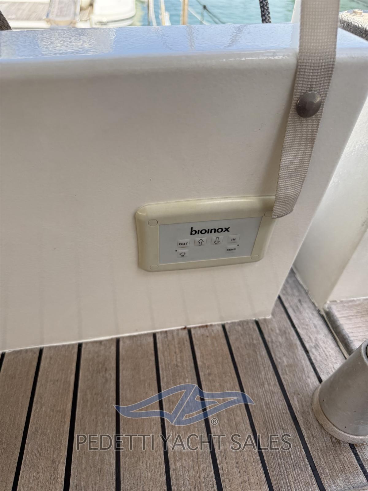 Allarme fumo/gas, Allarme motore, Allarme sentina, Bocche di Lupa, Camminamenti laterali in teak, Cavo corrente di banchina, Corrimano, Doccia esterna, Doppia timoneria, Flap idraulici, Gruette per tender, Impianto antincendio, Indicatori Flaps, Luci di cortesia, Parabordi, Passerella, Pompa di sentina automatica, Pompa di sentina manuale, Ponte in teak, Porta ingresso, Pozzetto Teak, Presa 220V banchina, Presa acqua banchina, Ripetitore strumentazione, Salpa Ancore Elettrico, Scala reale, Scaletta da bagno, Tavolo pozzetto, Tavolo Salone Abbattibile, Tromba, Tuga in teak, Winch tonneggio di poppa, Winch tonneggio di prua.