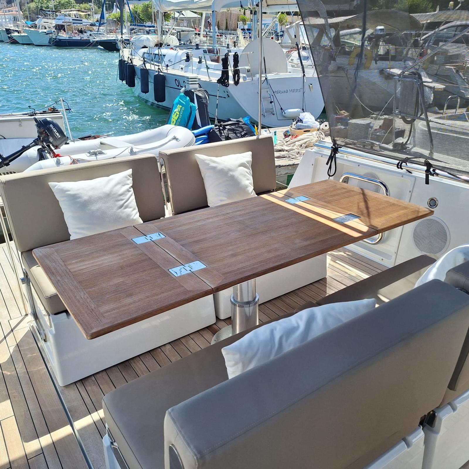 Allarme motore, Allarme sentina, Ancora (SS 10 kg with 50 m SS chain), Apertura Vano Motore Elettrica, Autoclave, 5 Batterie (2x 90Ah (engine) + 3x 160Ah AGM (service)), 6 Bitte Abbattibili, Bocche di Lupa, Camminamenti laterali in teak, Cavo corrente di banchina, Doccia esterna, Impianto antincendio (Sutomatic Firebuoy system), Lavandino nel Pozzetto, Luci di cortesia, Motore fuoribordo per tender, 6 Parabordi, Piattaforma (fixed extended swimming platform), Pompa di Scarico del Serbatoio Acque Reflue, 2 Pompa di sentina automatica, Porta ingresso (Sliding), Pozzetto Teak, Salpa Ancore Elettrico, 2 Scaletta da bagno (Foldable and XL swiveling), Selle per Tender, Tavolo pozzetto (with teak foldable wings + electric pedestal convertible into XL sunpad), Tender, 2 Tientibene con cancelletti, Tromba, T-Top (painted tubular steal and fiberglass).