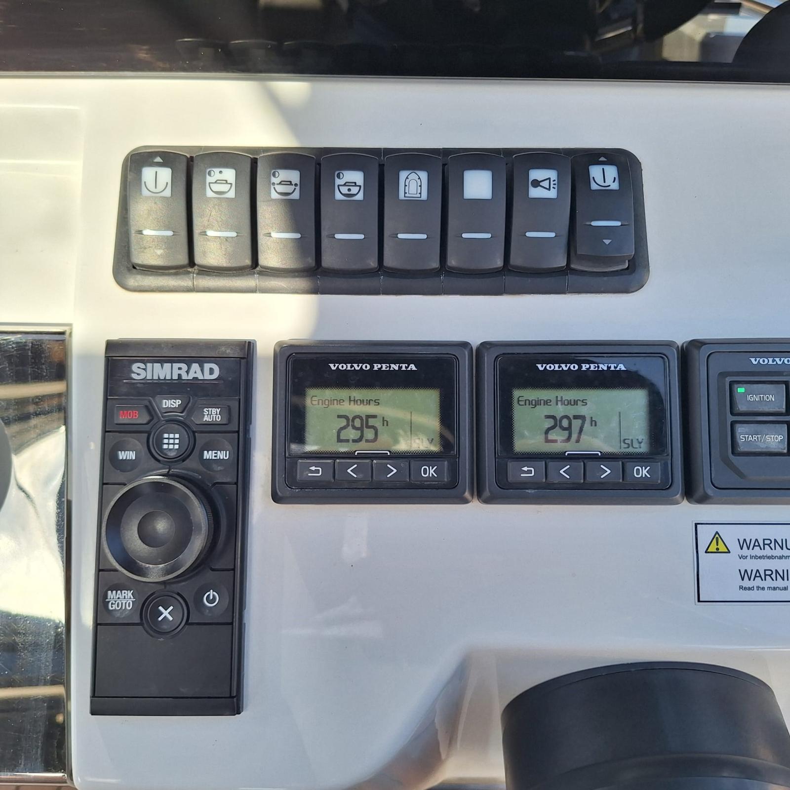 Angolo barra, Comando motori elettronico (Volvo EVC), Contametri catena (Quick), 2 Display (2,5" Volvo engine), DSC vhf (SIMRAD 100RS), Joystick, 2 Plotter (SIMRAD 12" glass bridge), Sedile Copilota.