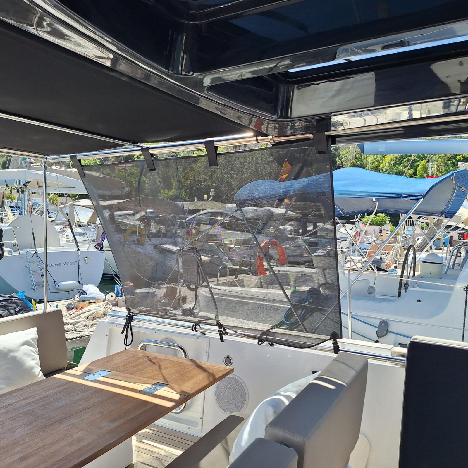 Bimini (fwd black mesh with 2 poles), 5 Copripozzetto (main deck full set), Cuscineria completa (Hitch Starfish full set), 11 Cuscineria di poppa (including fill in cushions for convertible table), 9 Cuscineria di prua (incl. fill in cushion for convertible table), Telo copriconsolle, 8 Telo coprisedile (Full set), Tenda Elettrica (integrated under TTOP telescopic shure shade).