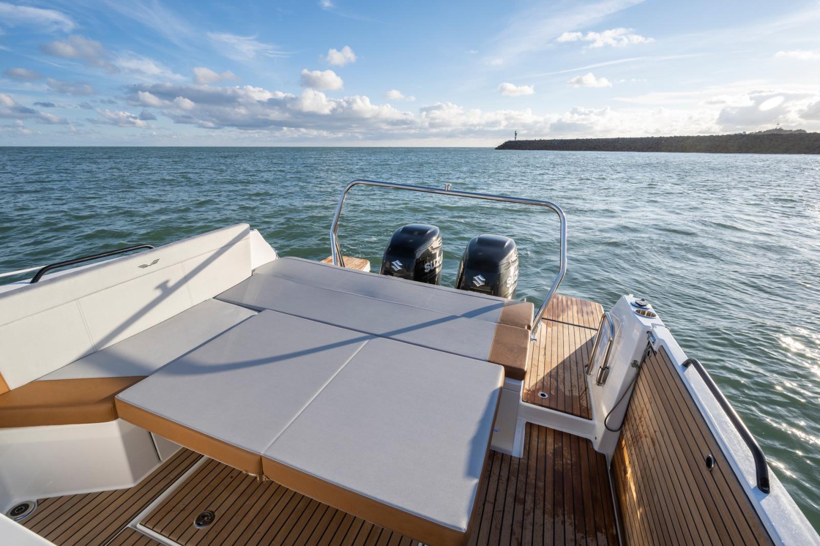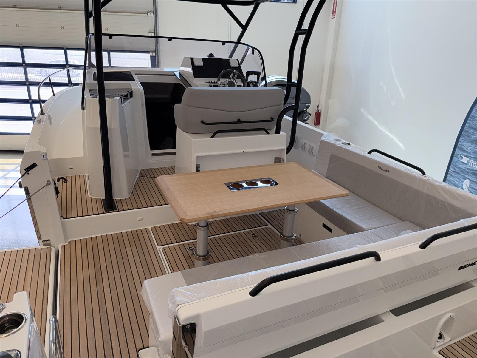 2 Allarme motore, Autoclave, Camminamenti laterali in teak, Colorazione speciale, Doccia esterna, Gancio Traino per Sci Nautico, Lavandino nel Pozzetto, Luci subacquee, 2 Piattaforma, Pompa di sentina manuale, Pozzetto Teak, Presa 220V banchina, Salpa Ancore Elettrico, Scaletta da bagno, Tavolo pozzetto, Tromba, T-Top.