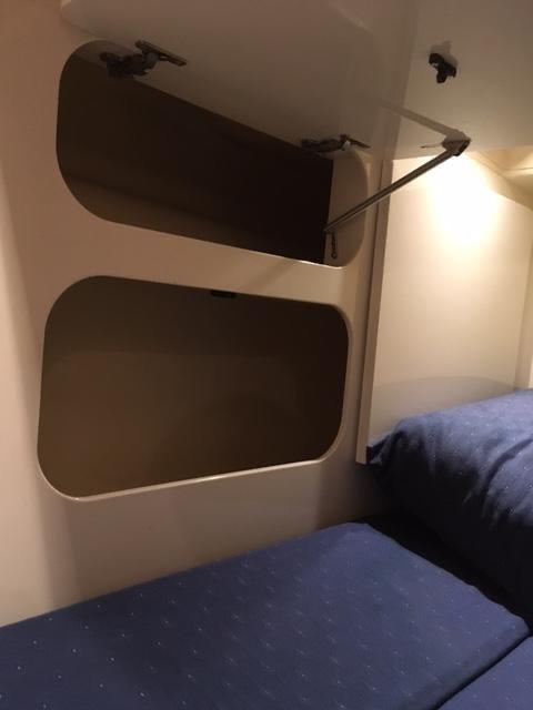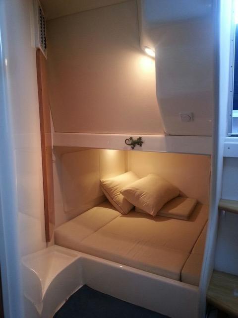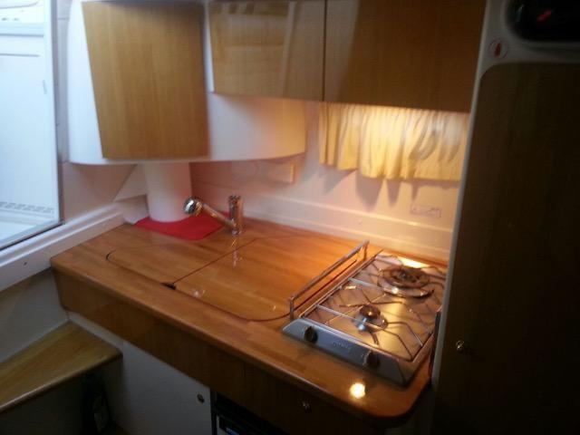 Sotto coperta l’imbarcazione offre due cabine separate, per un totale di 4 posti letto. La cucina e' attrezzata con piano cottura, lavello e frigorifero. È presente un bagno indipendente con WC elettrico, serbatoio acque nere e boiler per l’acqua calda. Gli interni sono luminosi e razionali, studiati per garantire comfort in ogni crociera.