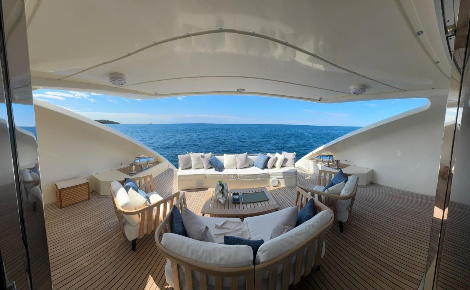 Autoclave, Camminamenti laterali in teak, Doccia esterna, Garage per tender, Gruette (Mor Saverio 072H), Luci subacquee, Parabordi, Passerella, Pompa di sentina automatica, Ponte in teak, Pozzetto Teak, Salpa Ancore Elettrico (2 x Lofrans Vertical ercole), Scaletta da bagno, Stabilizzatori (4 x Humphree Stabilizers), Tavolo pozzetto, Tromba.