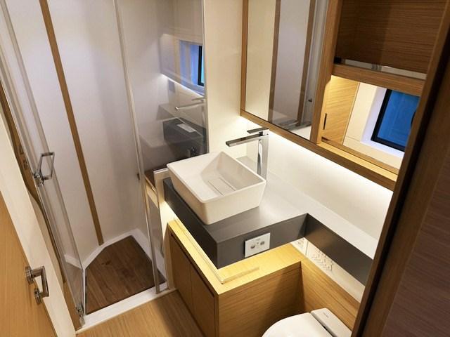 Aria condizionata (Tropical 60.000 btu), Boiler, Dissalatore (Osmosea 100 lt/h), Inverter (Climma), WC marino elettrico.