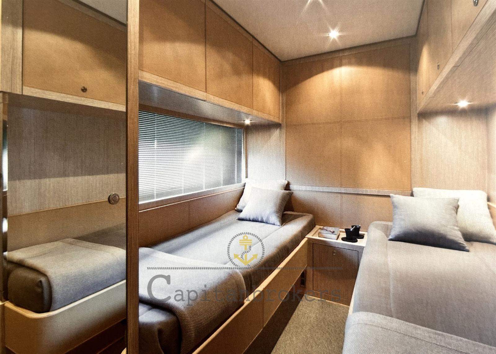 Aria condizionata (in locali separati), Boiler (elettrico), Clima reversibile, Dissalatore (idromar), Prese interne 12v, Prese interne 220v, Telecamera (in pozzetto), WC marino elettrico.
