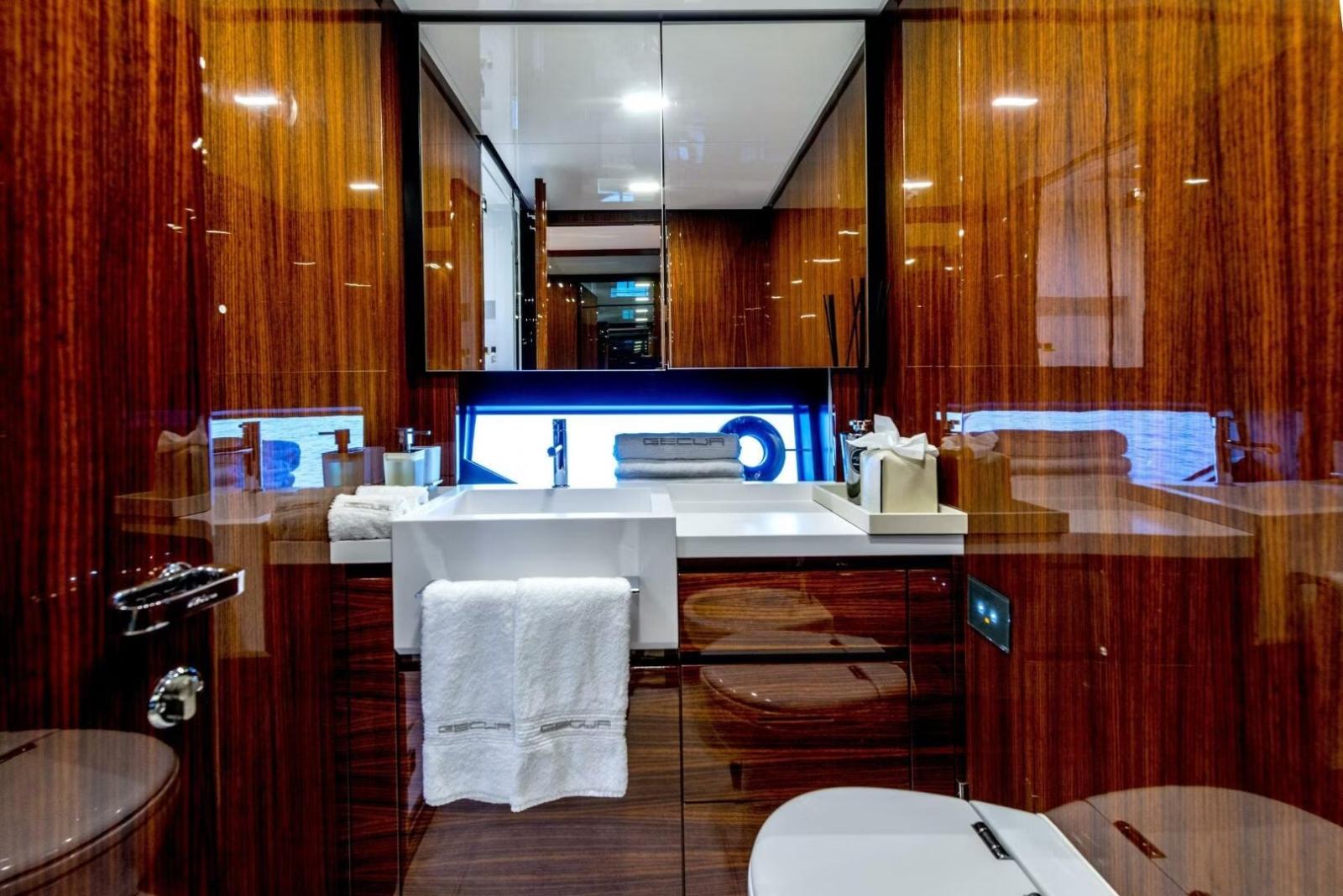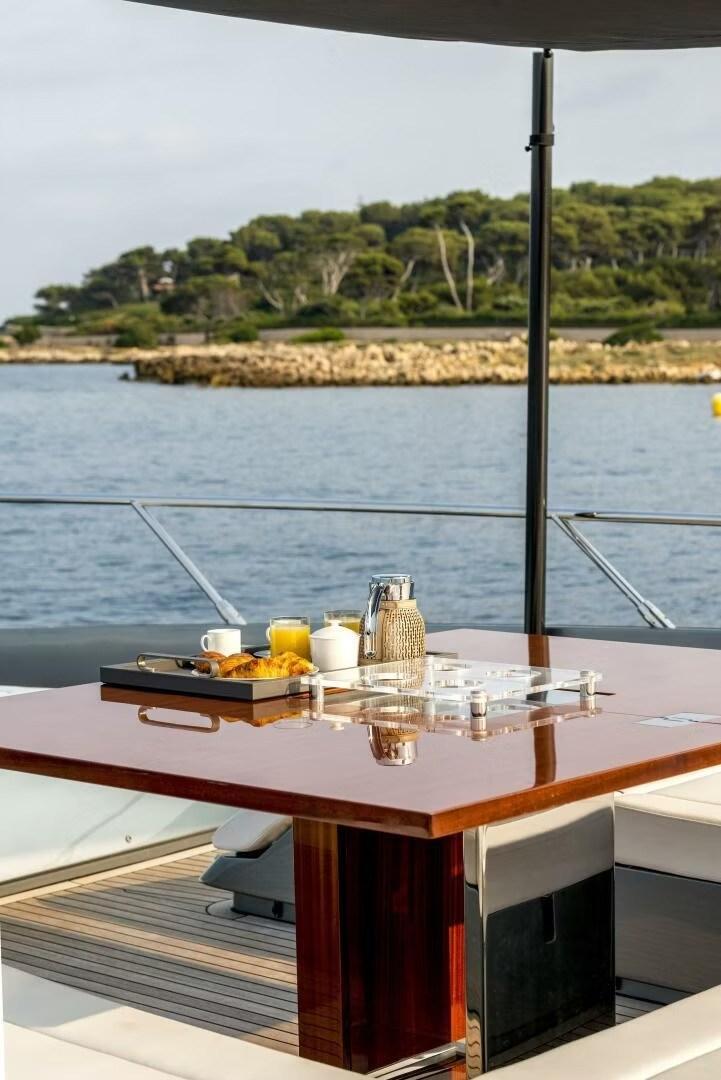 Bitte Abbattibili, Doccia esterna (con miscelatore di acqua calda e fredda a poppa), Garage per tender, Luci di cortesia, Luci subacquee (Lumishore), Stabilizzatori (giroscopio), Tavolo pozzetto (con sistema HI-LO), Tender (Williams 395 (39 ore)), Tientibene con cancelletti, Tromba.