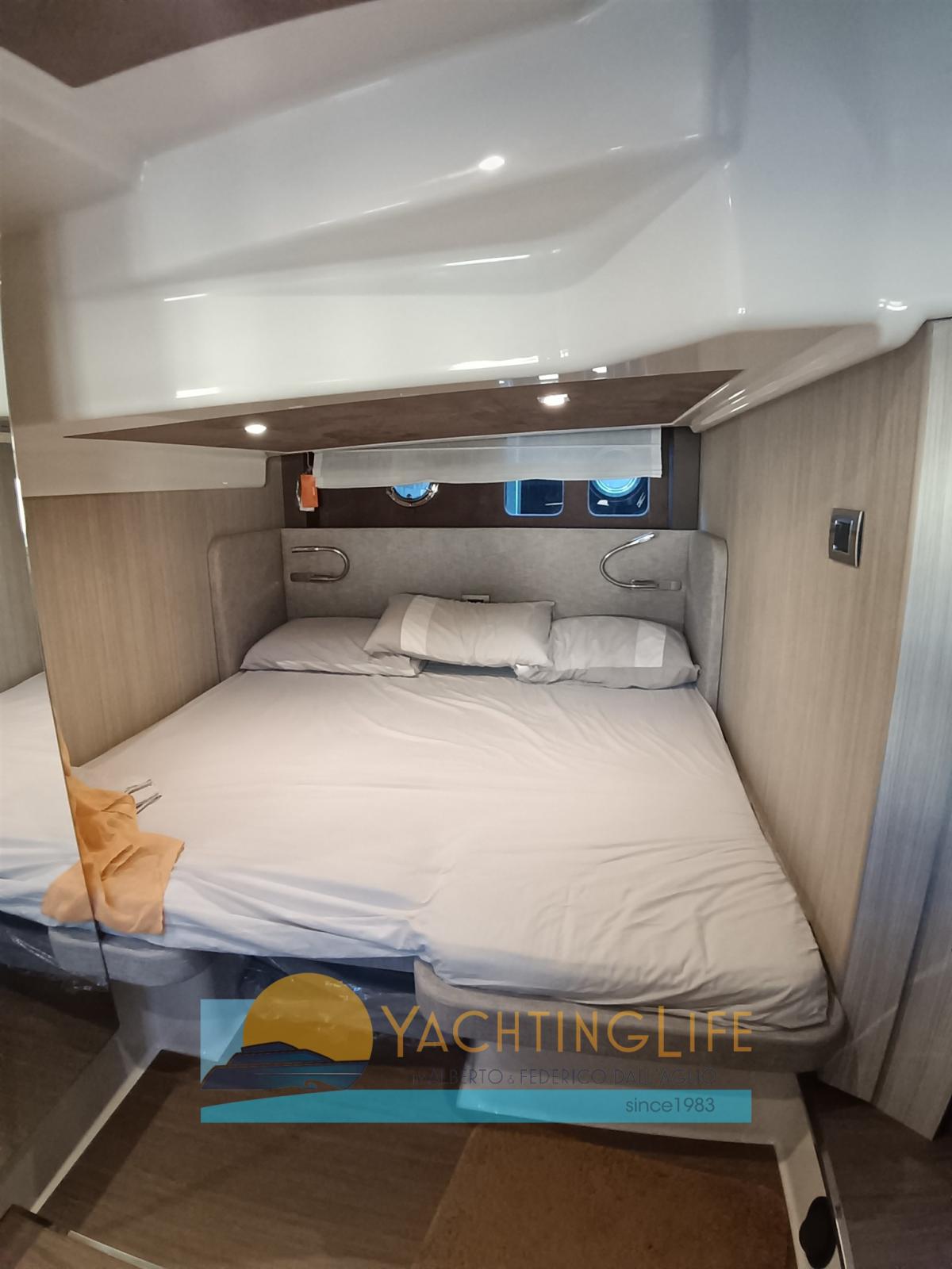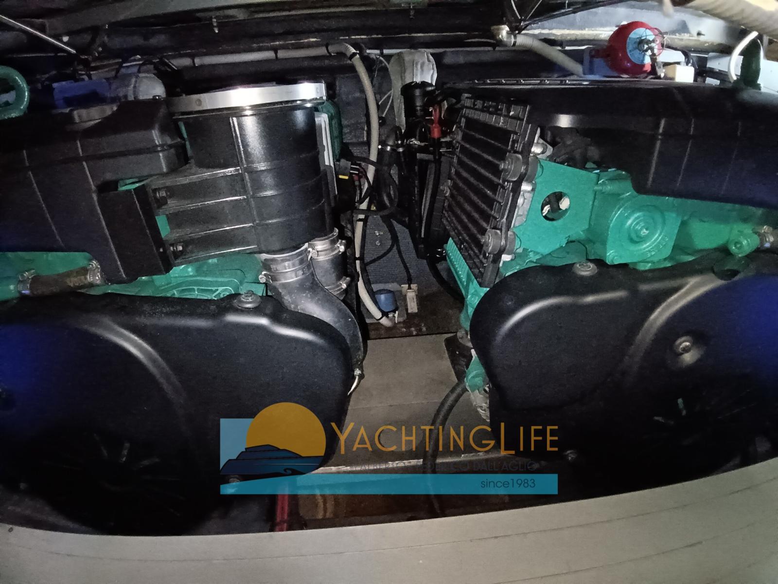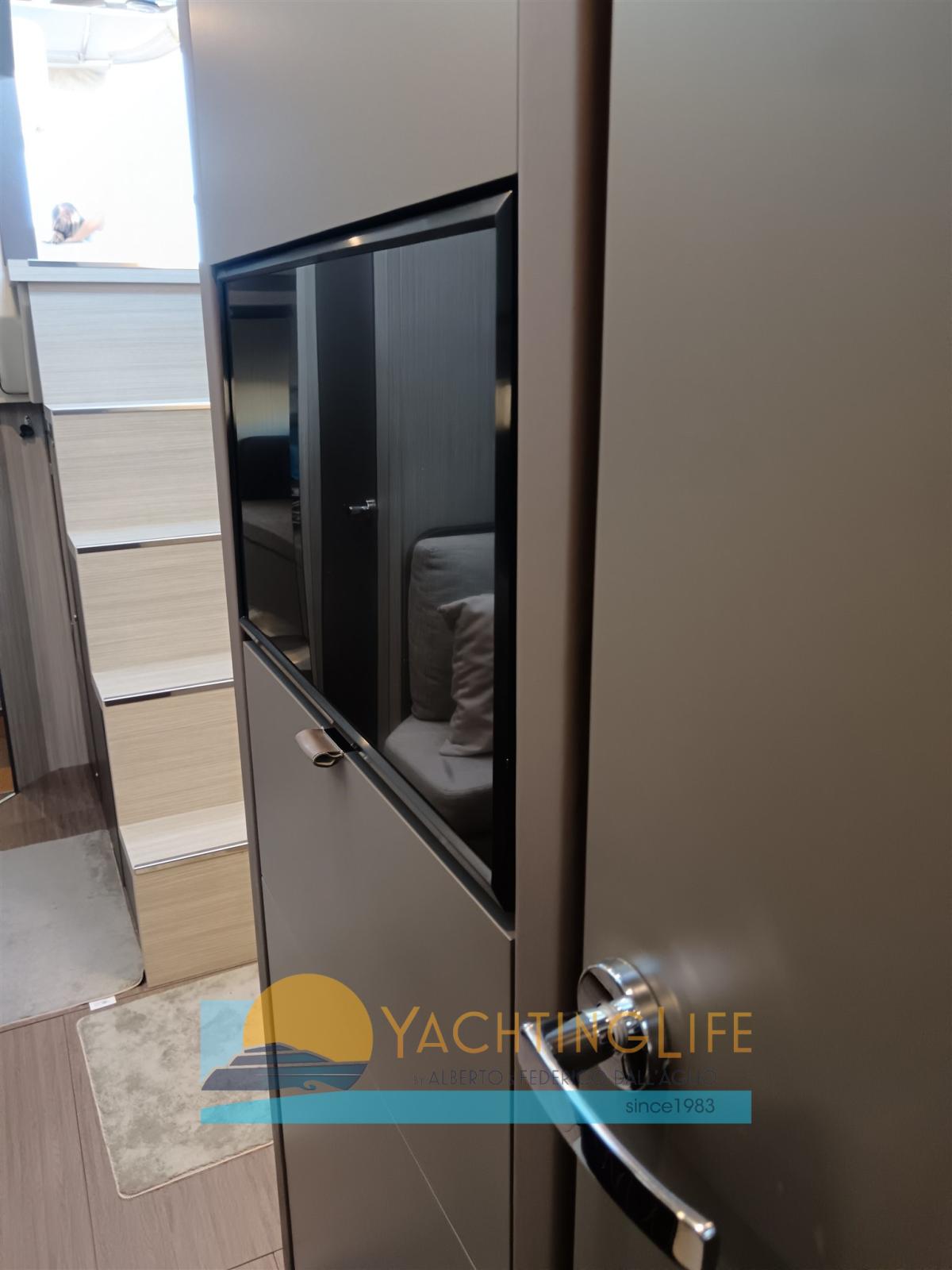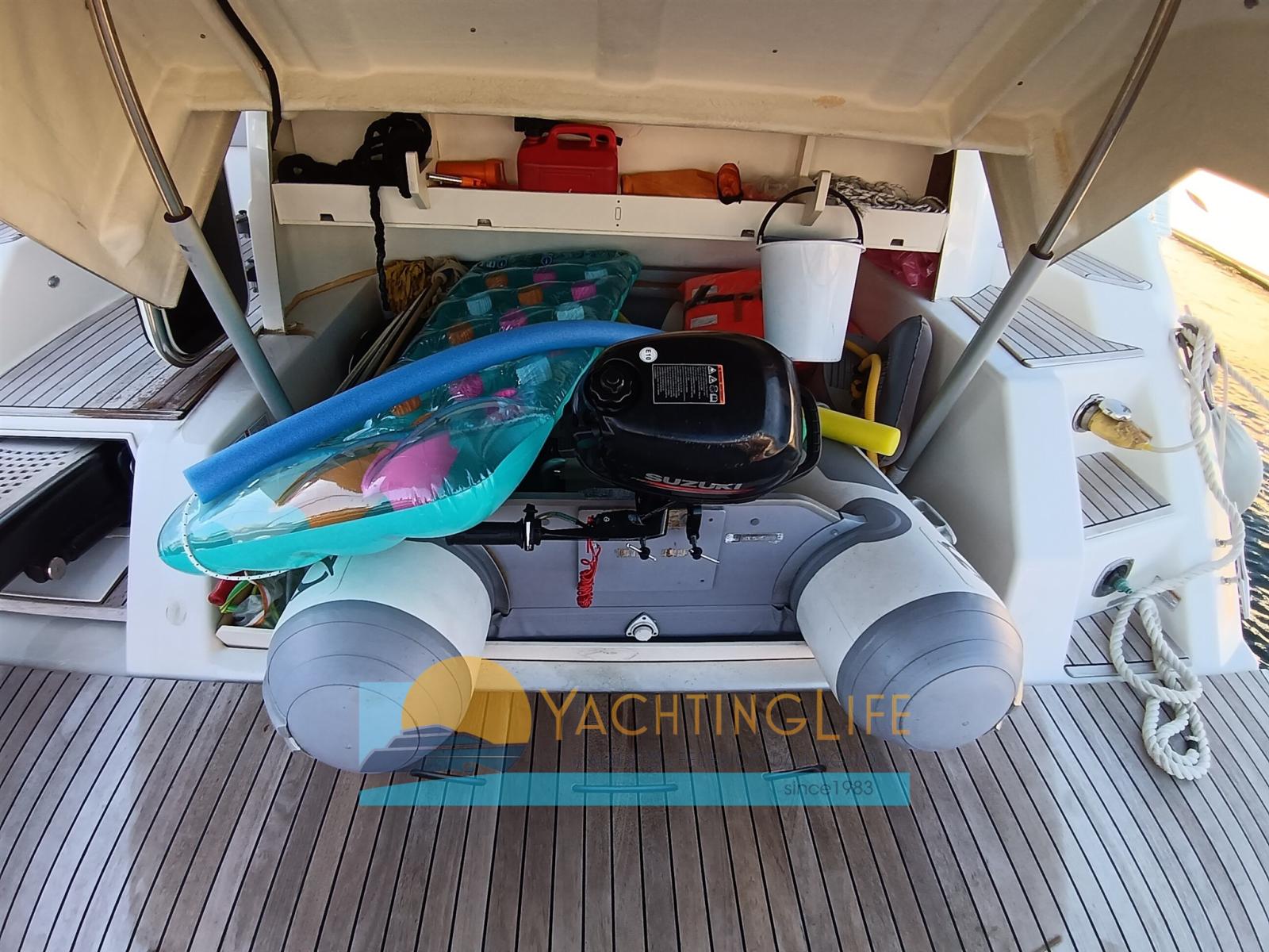 Allarme motore, Allarme sentina, Autoclave, Doccia esterna, Flap elettrici, Garage per tender, Hard top, Impianto antincendio, Indicatori Flaps, Lavandino nel Pozzetto, Luci di cortesia, Luci subacquee, Passerella (idraulica), Piattaforma (idraulica), Pompa di sentina automatica, Pozzetto Teak, Presa 220V banchina, Salpa Ancore Elettrico, Scaletta da bagno, Tavolo pozzetto, Tender (e motore), Tromba.