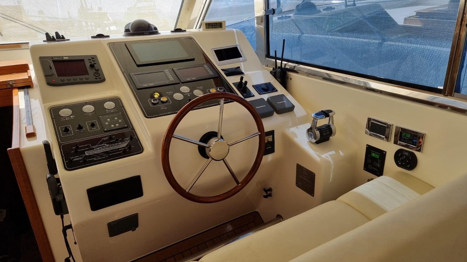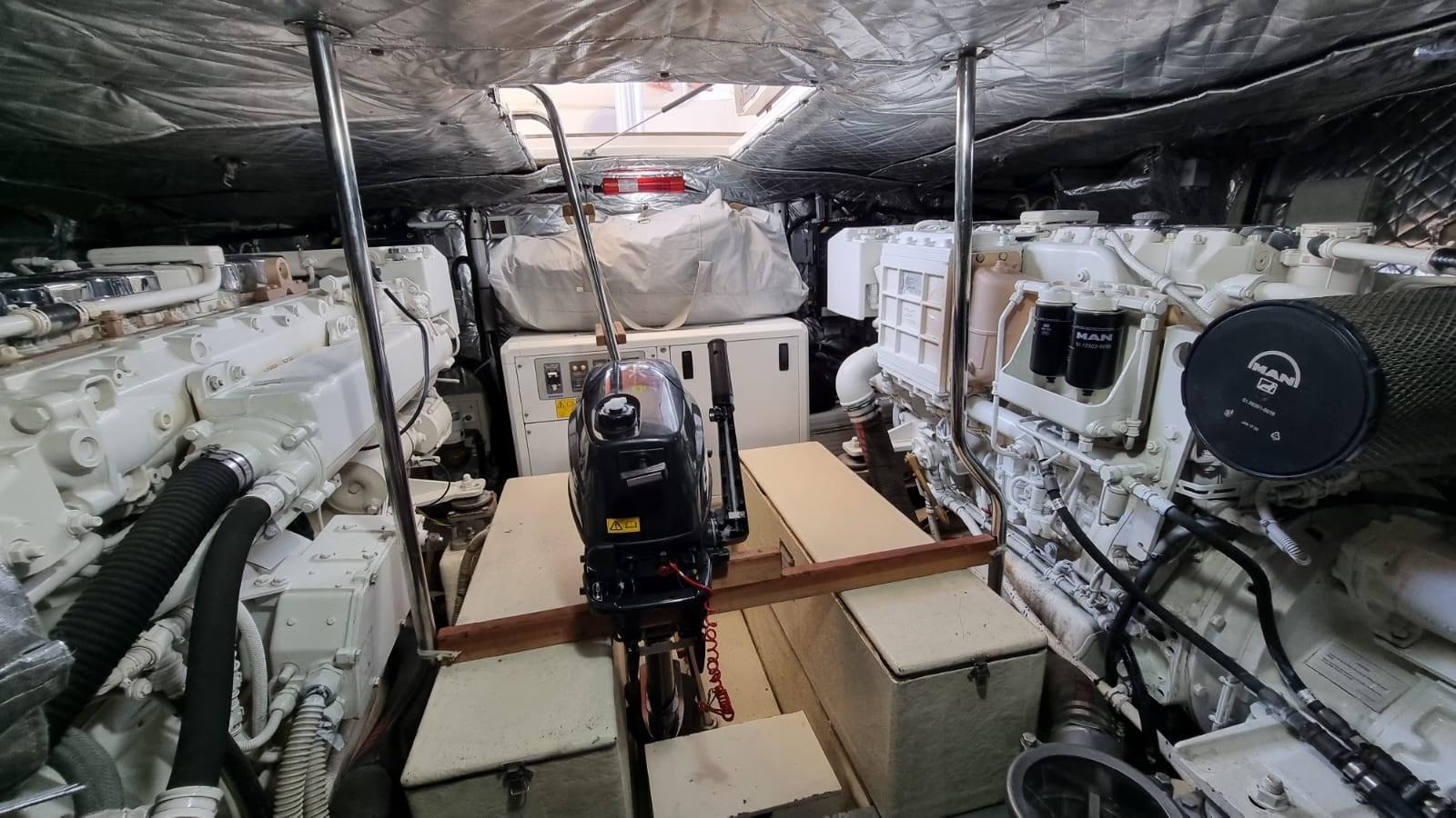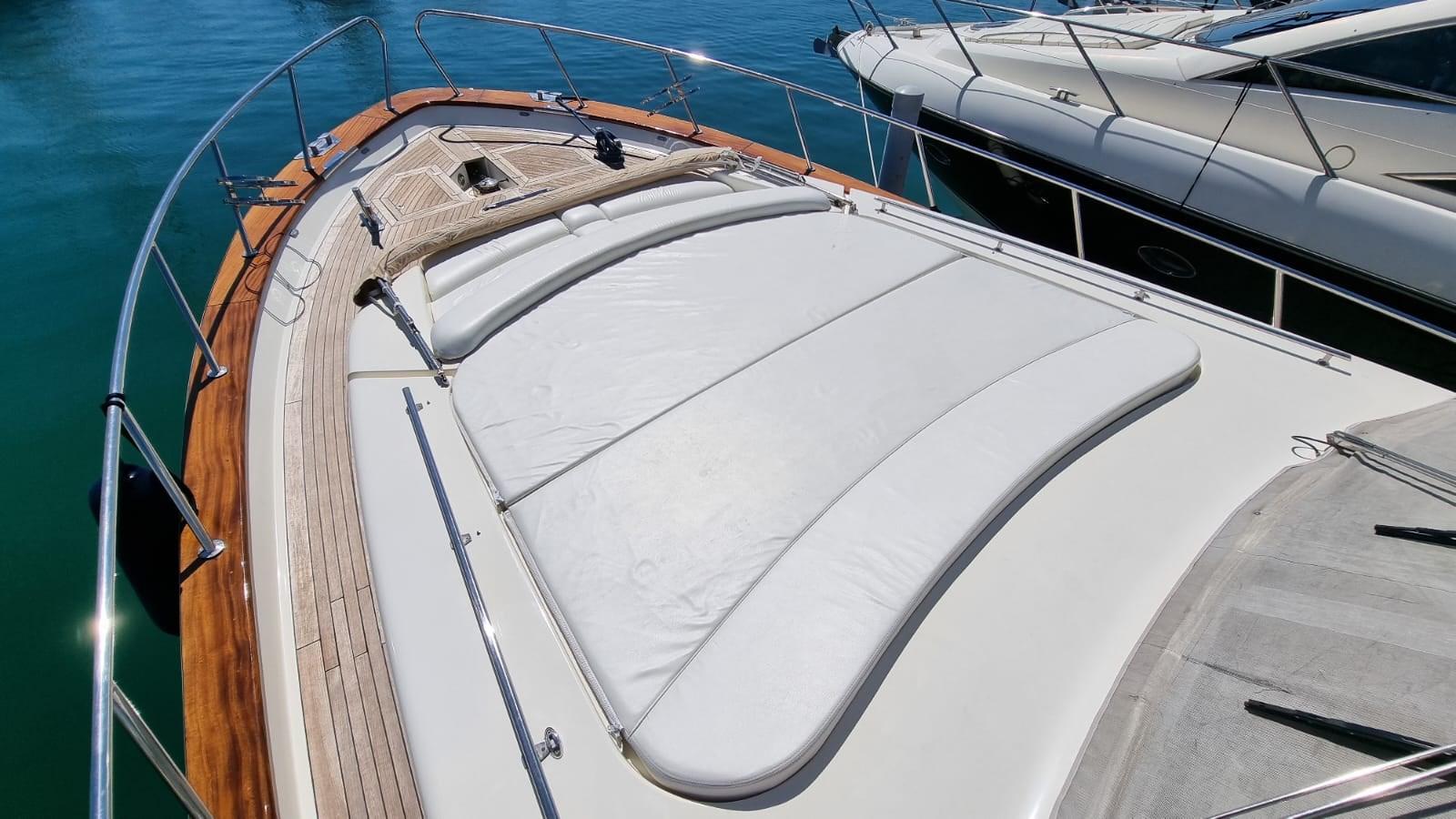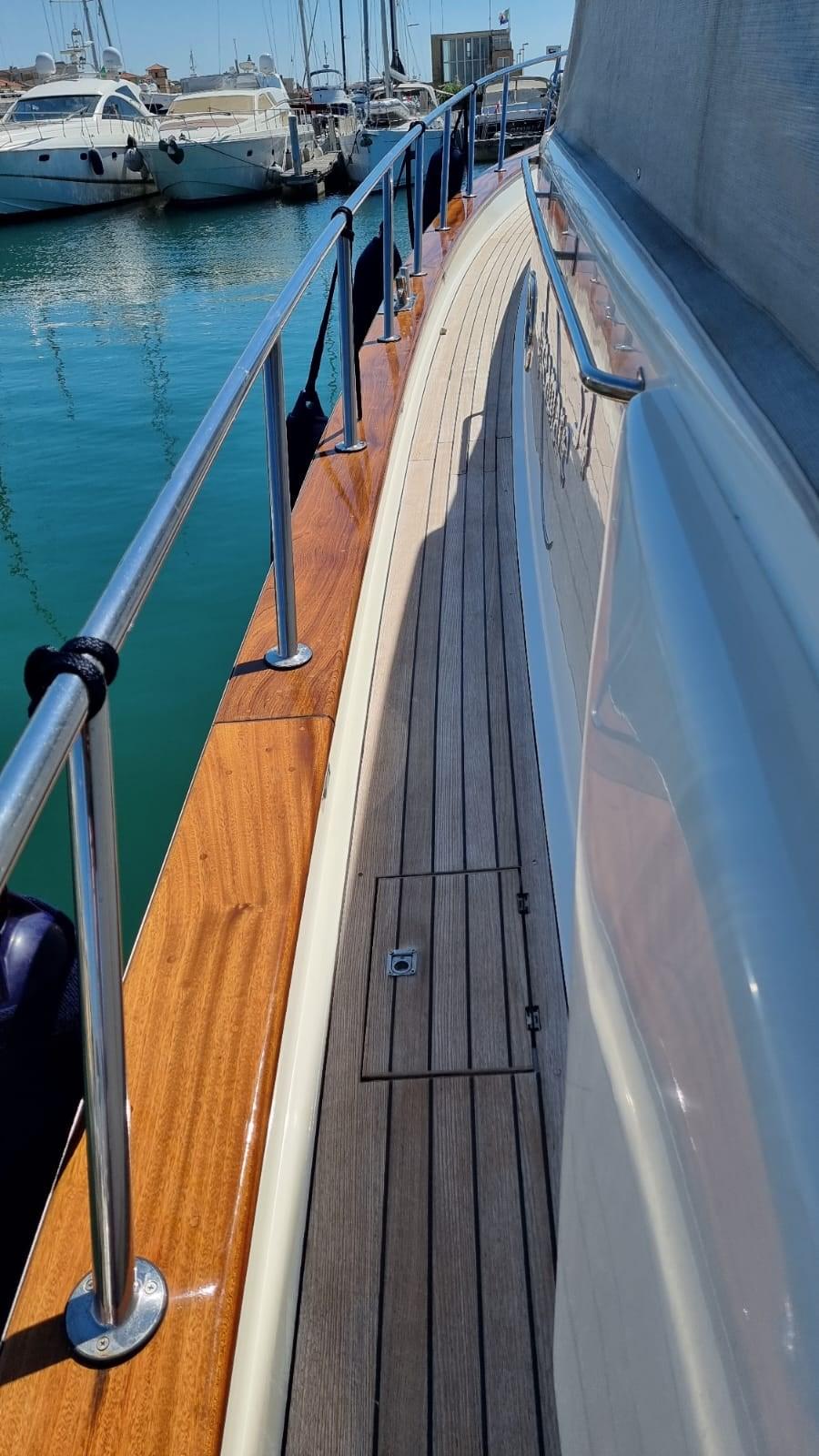 Allarme motore, Allarme sentina, Autoclave, 8 Batterie (4 per motori e 4 per servizi), Camminamenti laterali in teak, 2 Caricabatterie, Doccia esterna, Fari fissi a poppa, Faro orientabile, Flap idraulici, Impianto antincendio, Indicatori Flaps, Lavaggio catena, Luci di cortesia, Passerella (Idraulica), Piattaforma, Pompa di sentina automatica, Porta ingresso, Pozzetto Teak, Presa 220V banchina, Presa acqua banchina, Raddrizzatore, Salpa Ancore Elettrico, Scaletta da bagno, Tavolo pozzetto, Tender (2,30 m con Evenrude 4 hp), Tromba, 2 Winch tonneggio di poppa.