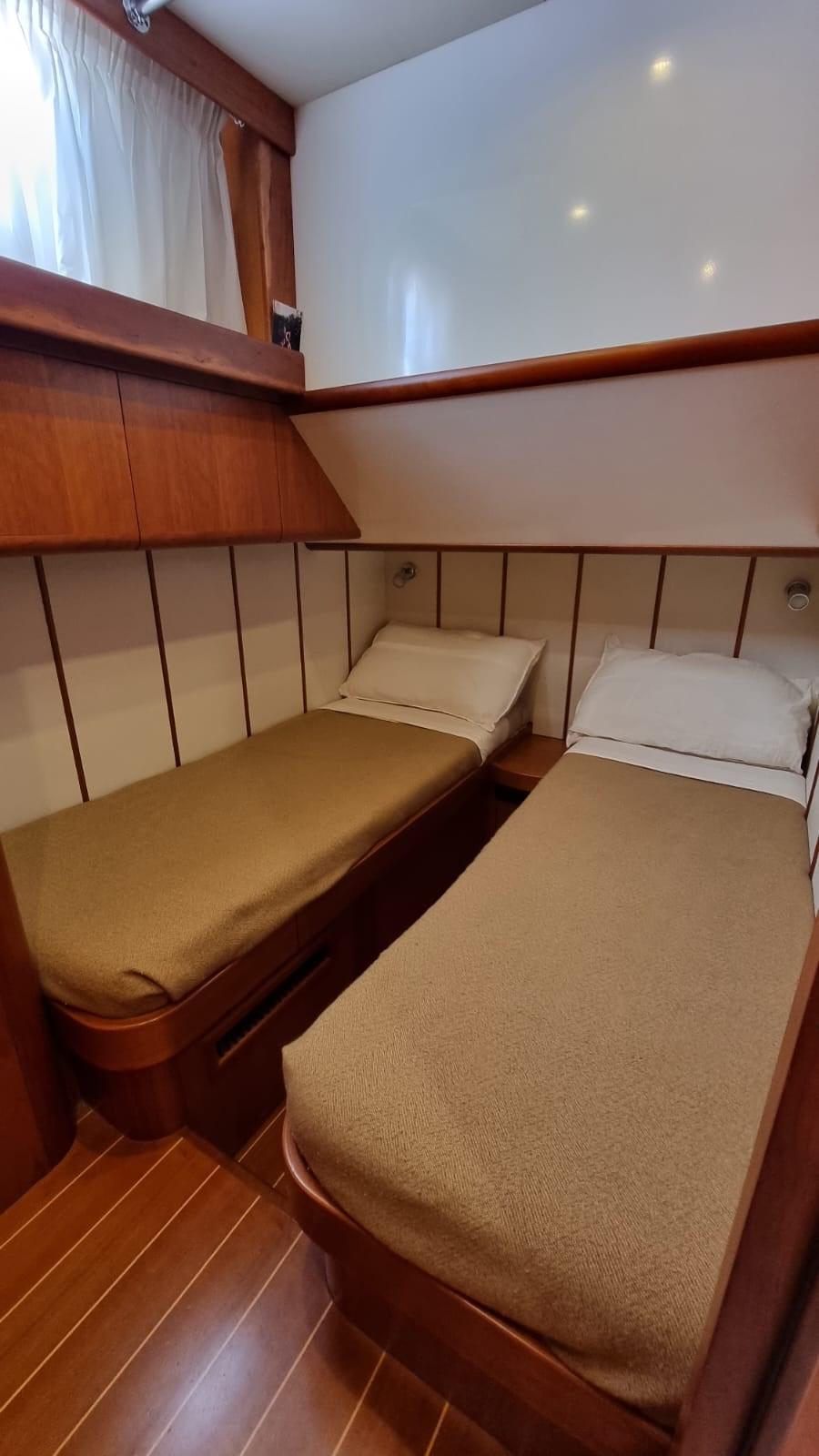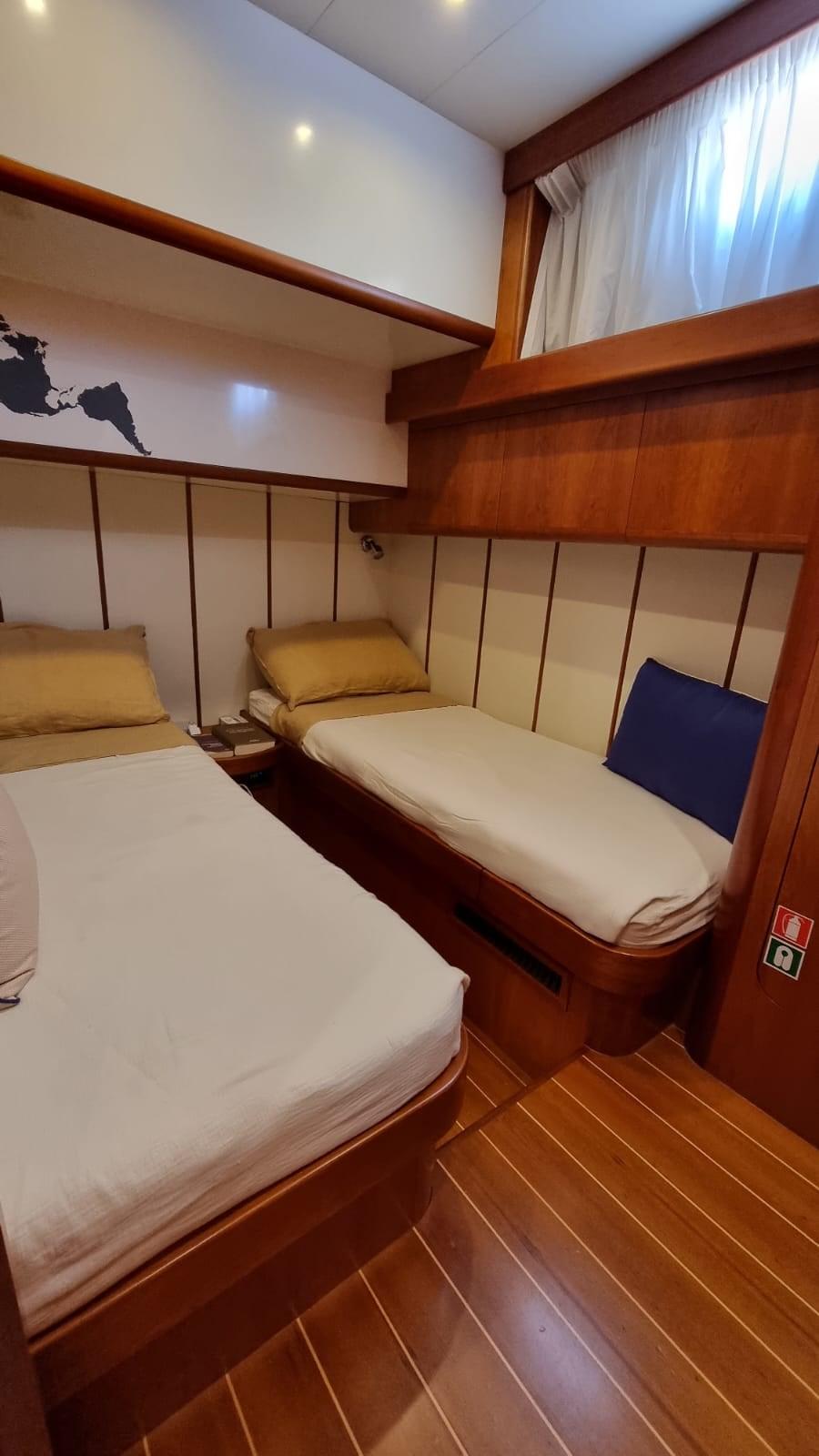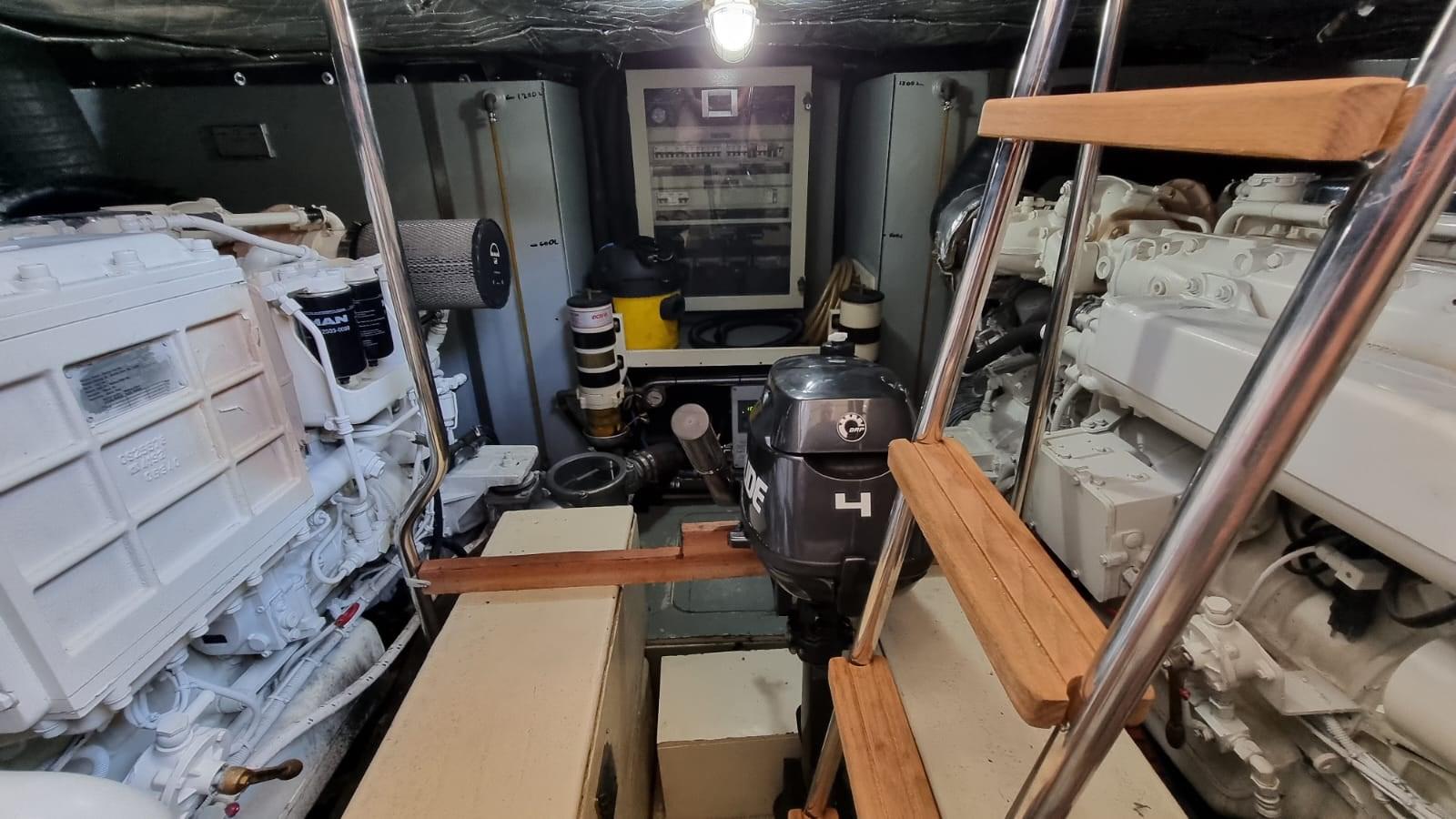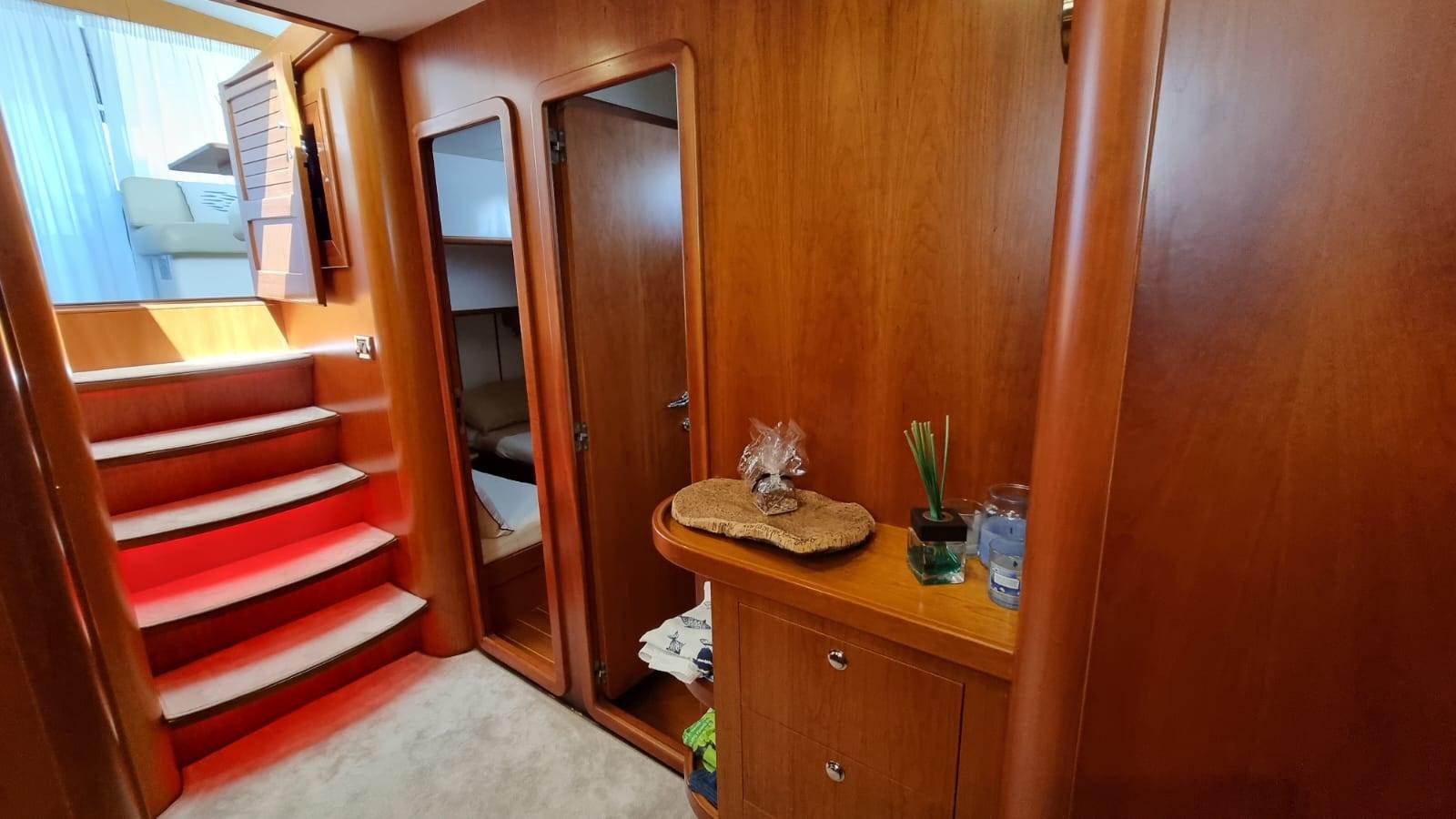 Allarme motore, Allarme sentina, Autoclave, 8 Batterie (4 per motori e 4 per servizi), Camminamenti laterali in teak, 2 Caricabatterie, Doccia esterna, Fari fissi a poppa, Faro orientabile, Flap idraulici, Impianto antincendio, Indicatori Flaps, Lavaggio catena, Luci di cortesia, Passerella (Idraulica), Piattaforma, Pompa di sentina automatica, Porta ingresso, Pozzetto Teak, Presa 220V banchina, Presa acqua banchina, Raddrizzatore, Salpa Ancore Elettrico, Scaletta da bagno, Tavolo pozzetto, Tender (2,30 m con Evenrude 4 hp), Tromba, 2 Winch tonneggio di poppa.