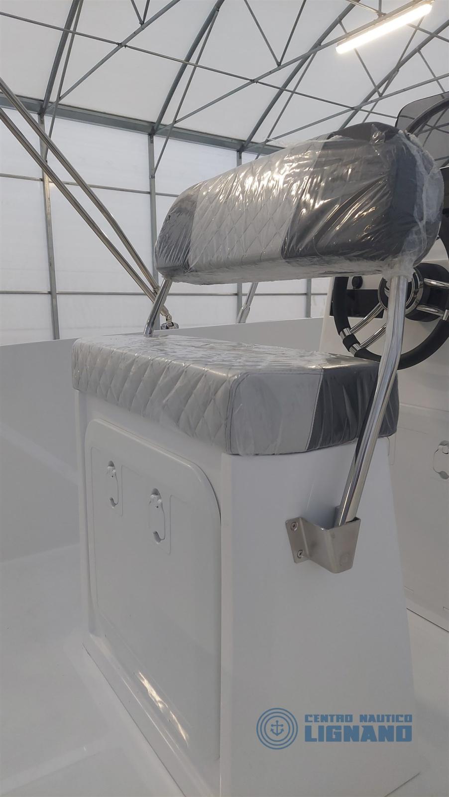 cuscineria bicolore grigia, prendisole prua, timoneria meccanica, luci di navigazione e fonda, scaletta di risalita mare, autosvuotante e impianto pompa sentina, impianto batterie 12V con scatola, staccabatterie, bussola in console, tendalino in acciaio inox, serbatoio carburante fisso 82 lt, presa 12V in console, impianto stereo Fusion con 2 casse, pannello utenza 12V, colore FIANCA DARK GRAY, luci ci cortesia (4) nei camminamenti, filtro benzina ispezionabile, monitor motore SVH85
