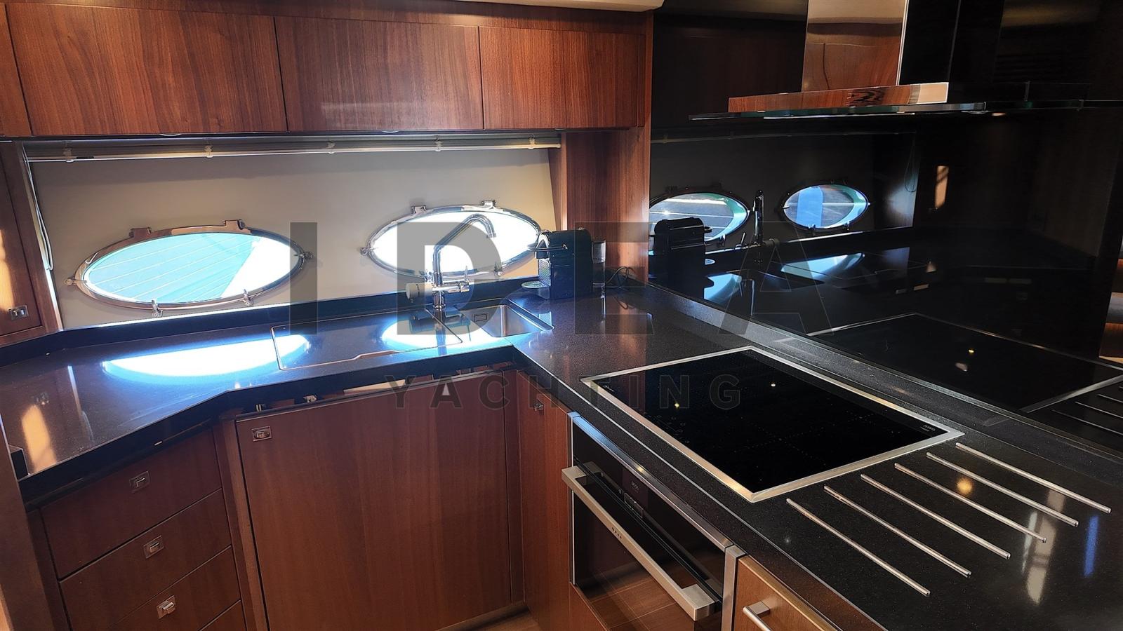 Congelatore (Vitifrigo), Forno (Neff), Frigorifero esterno (Vitifrigo), Frigorifero interno (Vitifrigo), ICE Maker (Vitifrigo), Lavasciuga (Bosch), Lavastoviglie (Neff), 2 Piastra in vetroceramica (Neff - Galley + Cockpit), Winecooler (Vitifrigo).