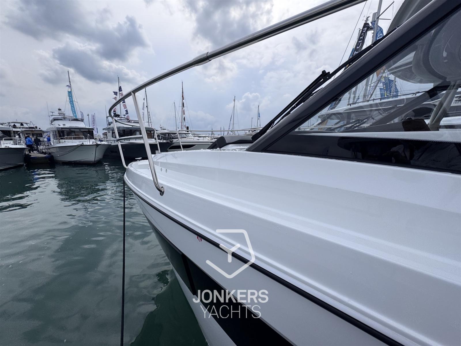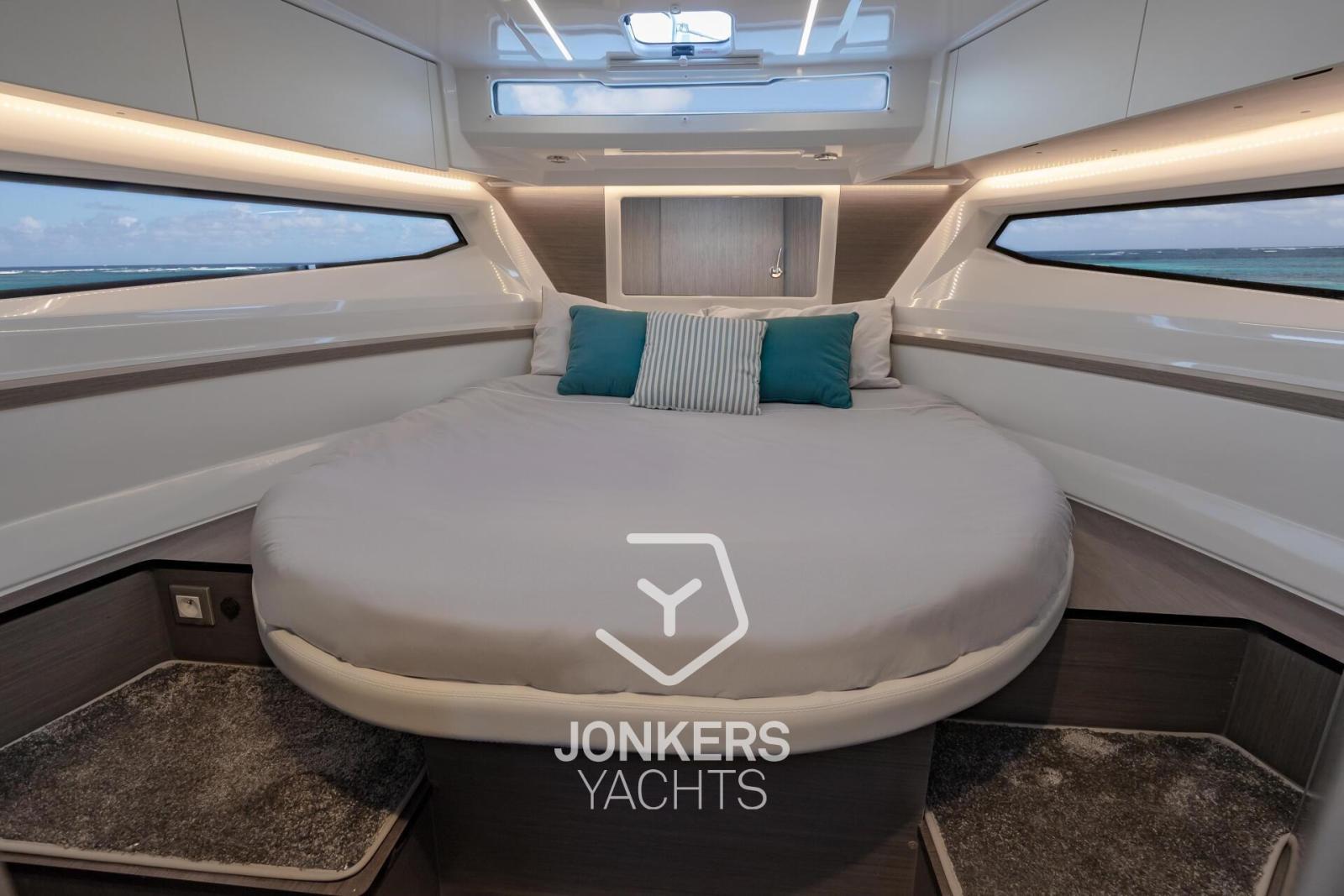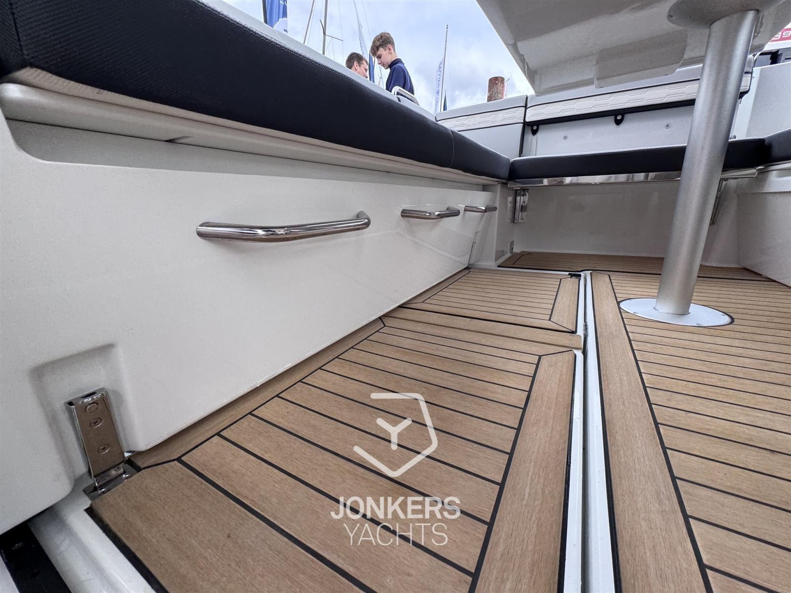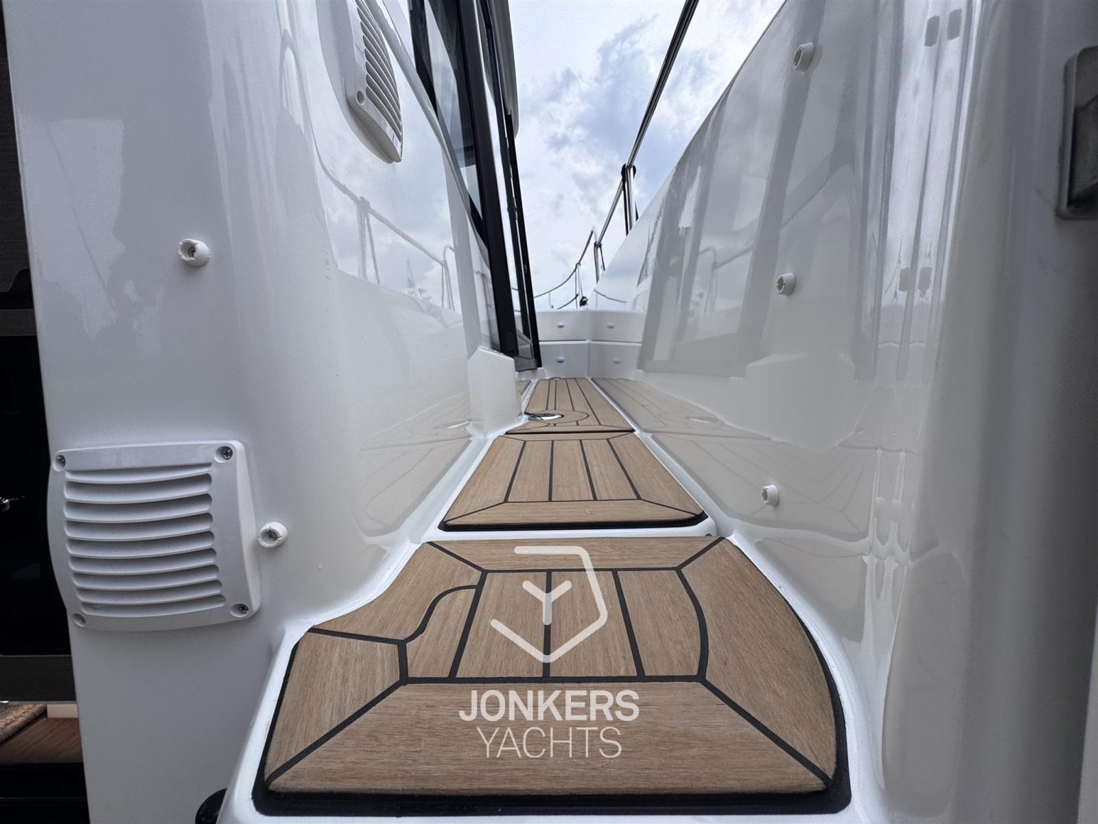 Le grandi finestre nello scafo e nel tetto della tuga si inseriscono perfettamente nella silhouette potente e sportiva. Il nuovo scafo permette di planare a partire da 20 nodi, una velocità facilmente raggiungibile con i suoi due motori, 2 x 250 CV alla massima velocità, garantendo comfort e manovrabilità.
