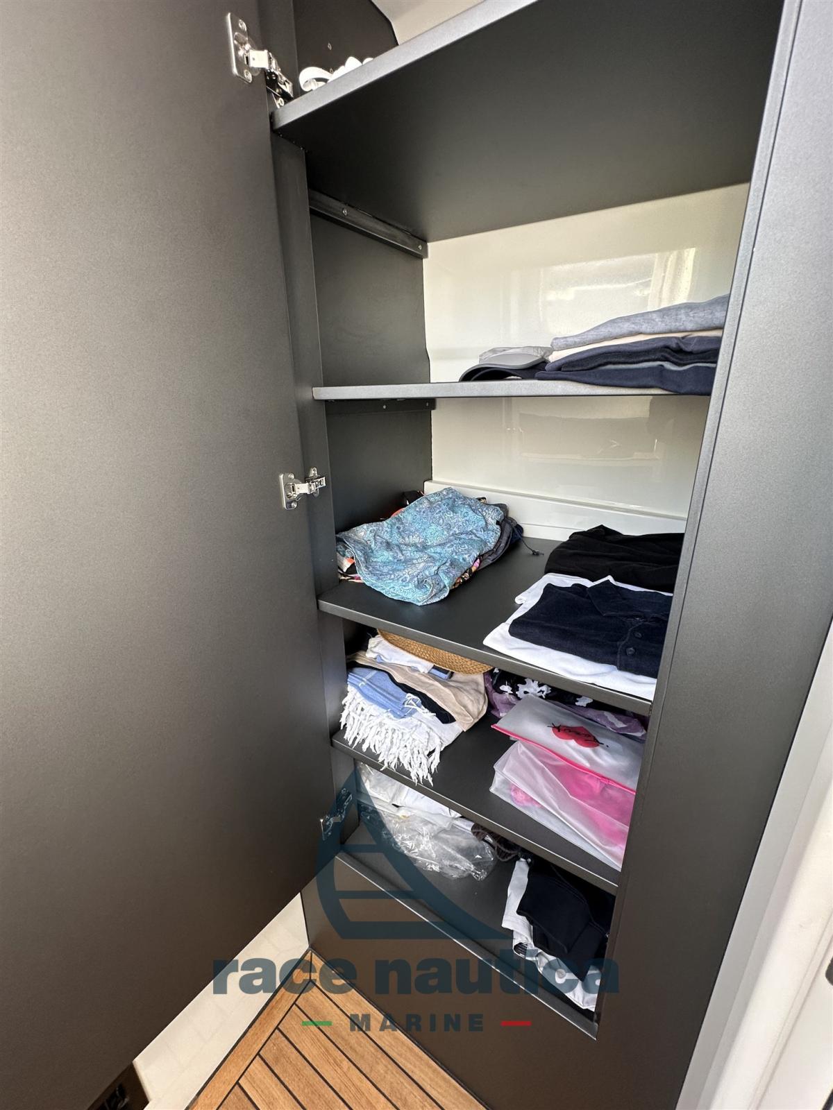 Allarme motore, Allarme sentina, Alternatore, Apertura Vano Motore Elettrica, Auto Dynamic Trim Interceptor, Autoclave, Bitte Abbattibili, Camminamenti laterali in teak, 2 Doccia esterna (calda e fredda), Fari fissi a poppa, Faro orientabile, Lavandino nel Pozzetto, Luci di cortesia, Luci subacquee, Passerella (Carbonio), Piattaforma, Pompa di sentina automatica, Pompa di sentina manuale, Pozzetto Teak, Presa 220V banchina, Presa acqua banchina, Raddrizzatore, Salpa Ancore Elettrico, Scaletta da bagno, Tavolo pozzetto, Tromba, T-Top.