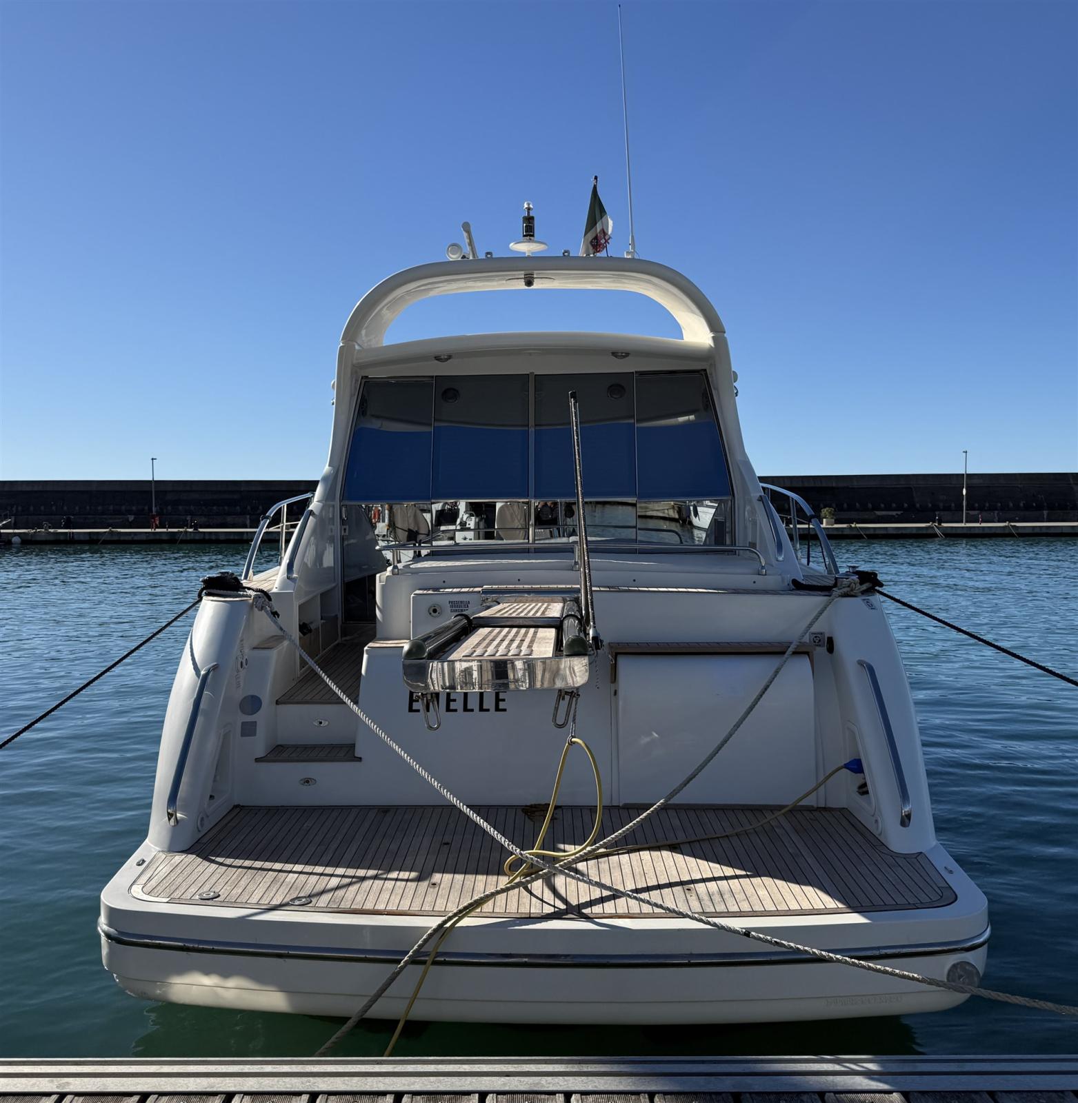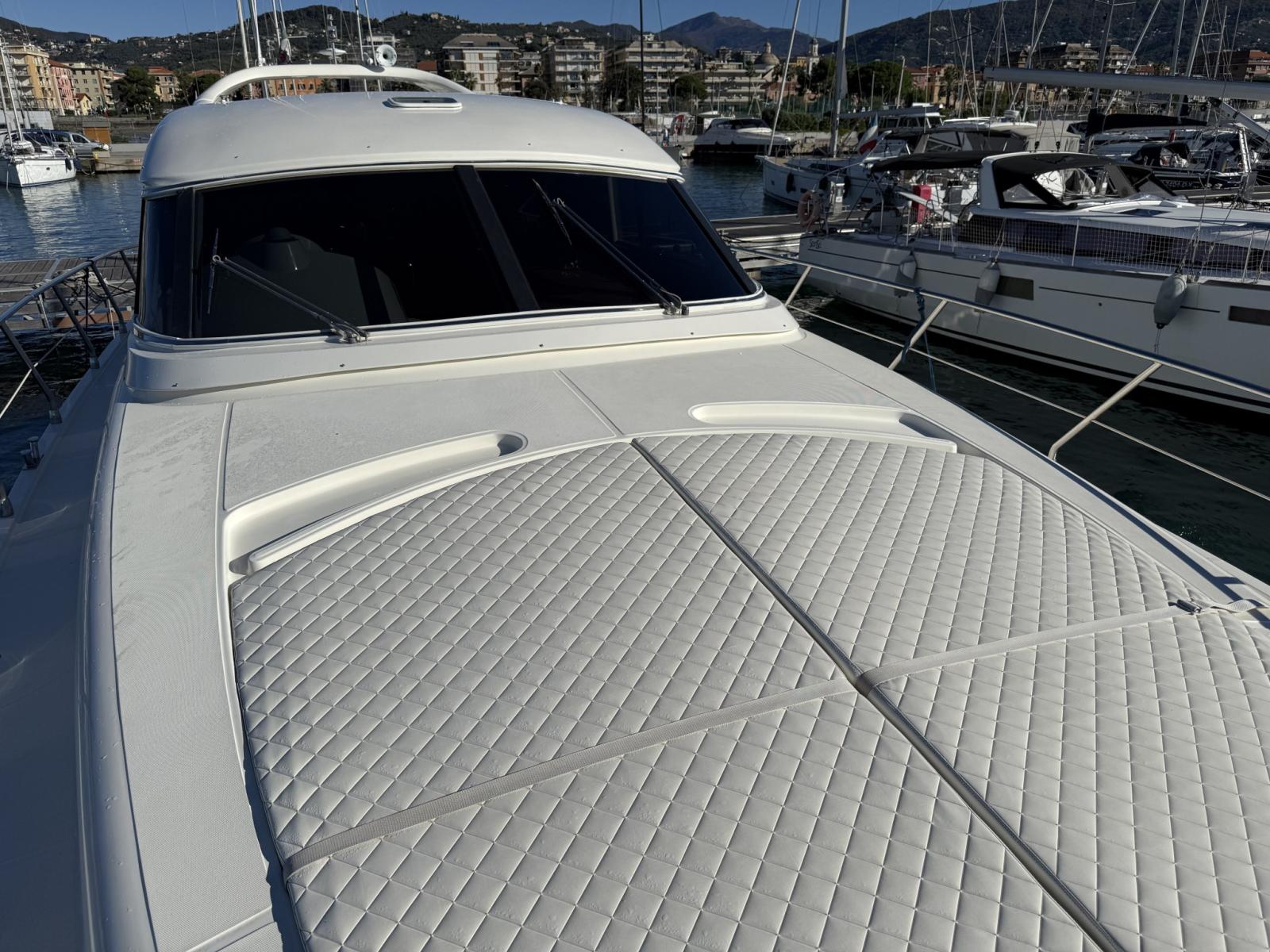 Allarme motore, Allarme sentina, Alternatore, Autoclave, Cavo corrente di banchina, Corrimano, Doccia esterna, Flap idraulici, Hard top, Impianto antincendio, Luci di cortesia, Pannelli Solari, Passerella, Piattaforma, Pompa di sentina automatica, Pompa di sentina manuale, Ponte in teak, Porta ingresso, Pozzetto Teak, Presa 220V banchina, Rollbar, Salpa Ancore Elettrico, Scaletta da bagno, Tientibene con cancelletti, Tromba, Winch tonneggio di poppa.