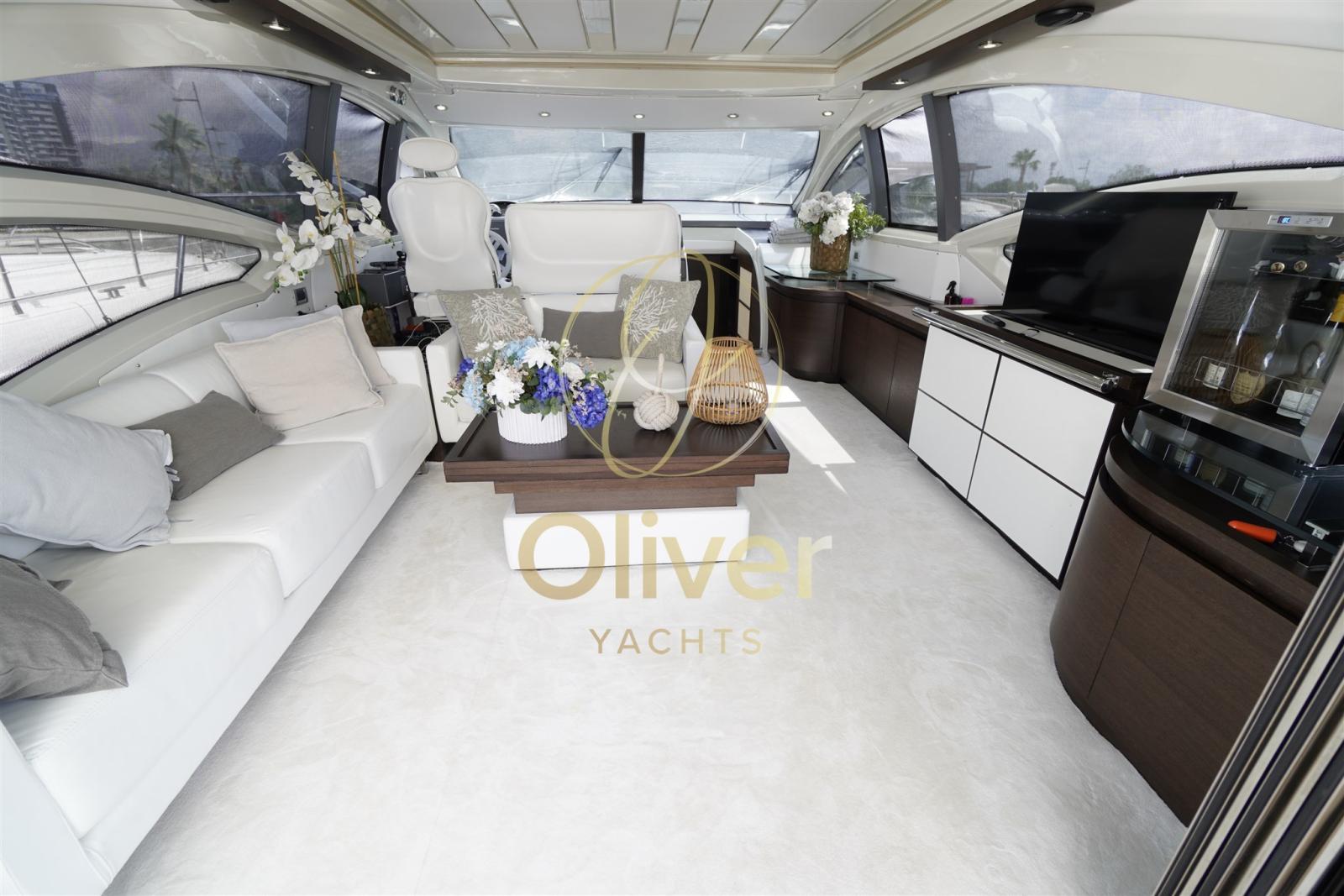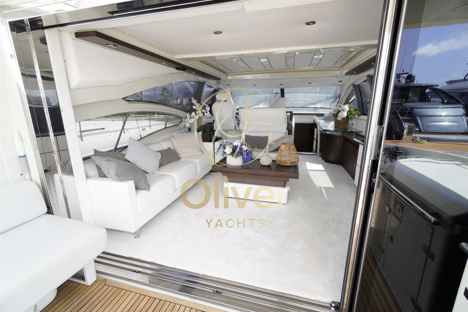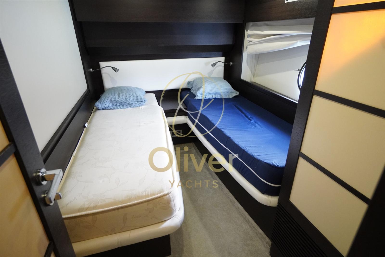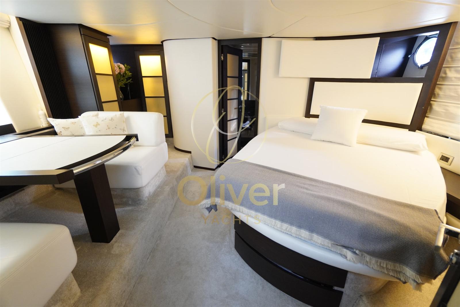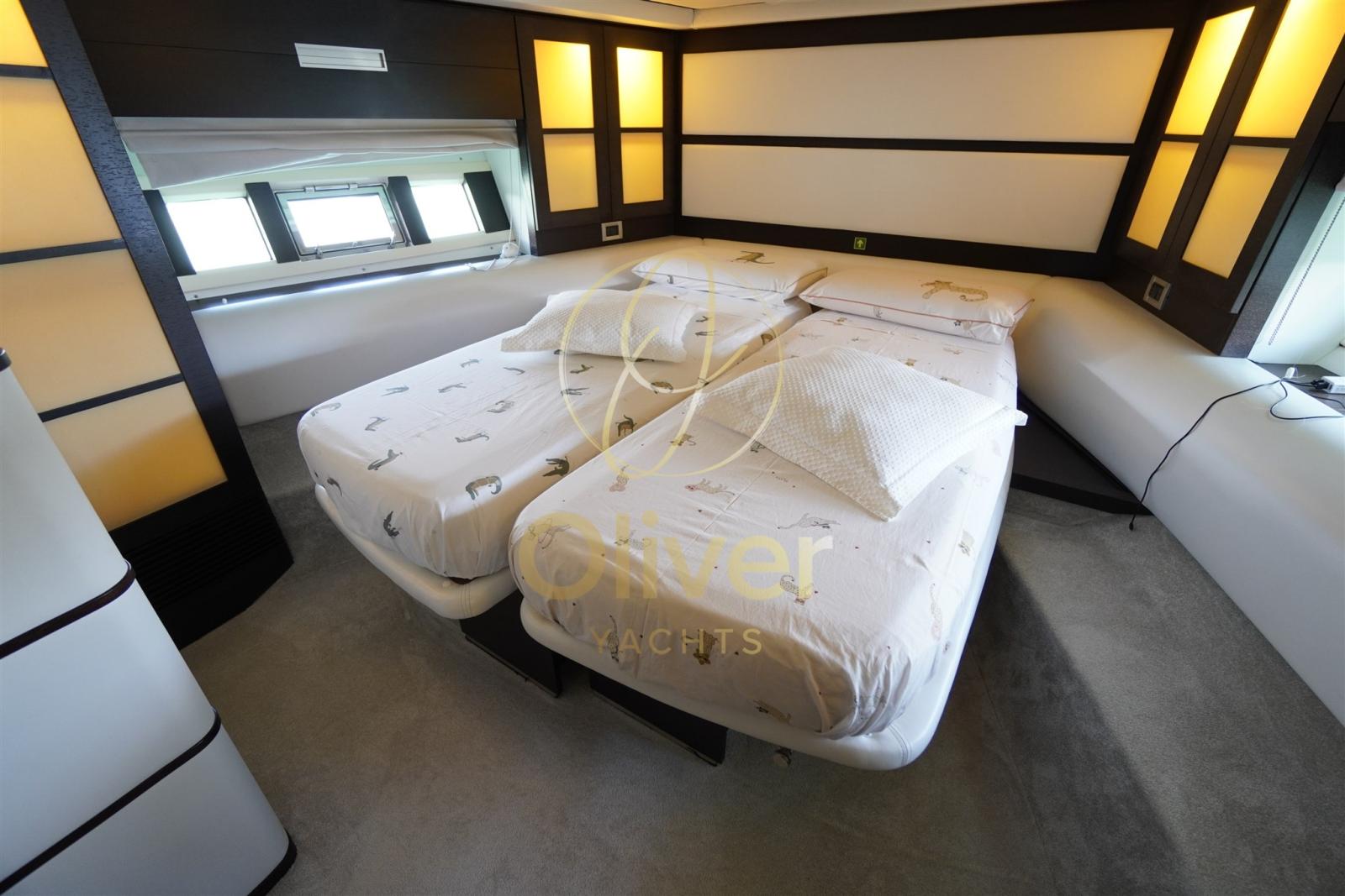 Gli interni di questa imbarcazione riflettono uno stile elegante e contemporaneo, con finiture di pregio e una distribuzione degli spazi studiata per offrire massimo comfort a bordo. Il salone sul ponte principale è ampio e luminoso, arredato con divani in pelle Etro e un tavolo estensibile/telescopico affiancato da un angolo bar completo, dove una smart TV Hisense a scomparsa e un impianto hi-fi creano un ambiente ideale per il relax o l’intrattenimento. La cucina, posizionata sottocoperta a dritta, è completamente attrezzata con elettrodomestici di qualità, tra cui forno digitale Panasonic, piano cottura a induzione, frigorifero e freezer a colonna, lavastoviglie integrata. La cabina armatoriale a tutto baglio a mezzanave è un vero e proprio appartamento privato sul mare, con letto matrimoniale, zona relax con due divani, cabina armadio, TV Philips e stereo Sony, oltre a bagno en-suite con box doccia separato. La cabina VIP di prua, con letti separati trasformabili in matrimoniale, dispone anch’essa di bagno privato e impianto audio. Completano la zona notte una cabina ospiti doppia con letti in piano e bagno con doccia, oltre alla cabina marinaio a poppa, con accesso indipendente e servizi riservati. L’attenzione ai dettagli, i materiali di qualità e la razionale suddivisione degli ambienti rendono questi interni ideali per lunghe permanenze a bordo. Ogni cabina è dotata di impianto stereo Sony, offrendo comfort personalizzato per ogni ospite. Una barca pensata per vivere il mare con classe, privacy e funzionalità.