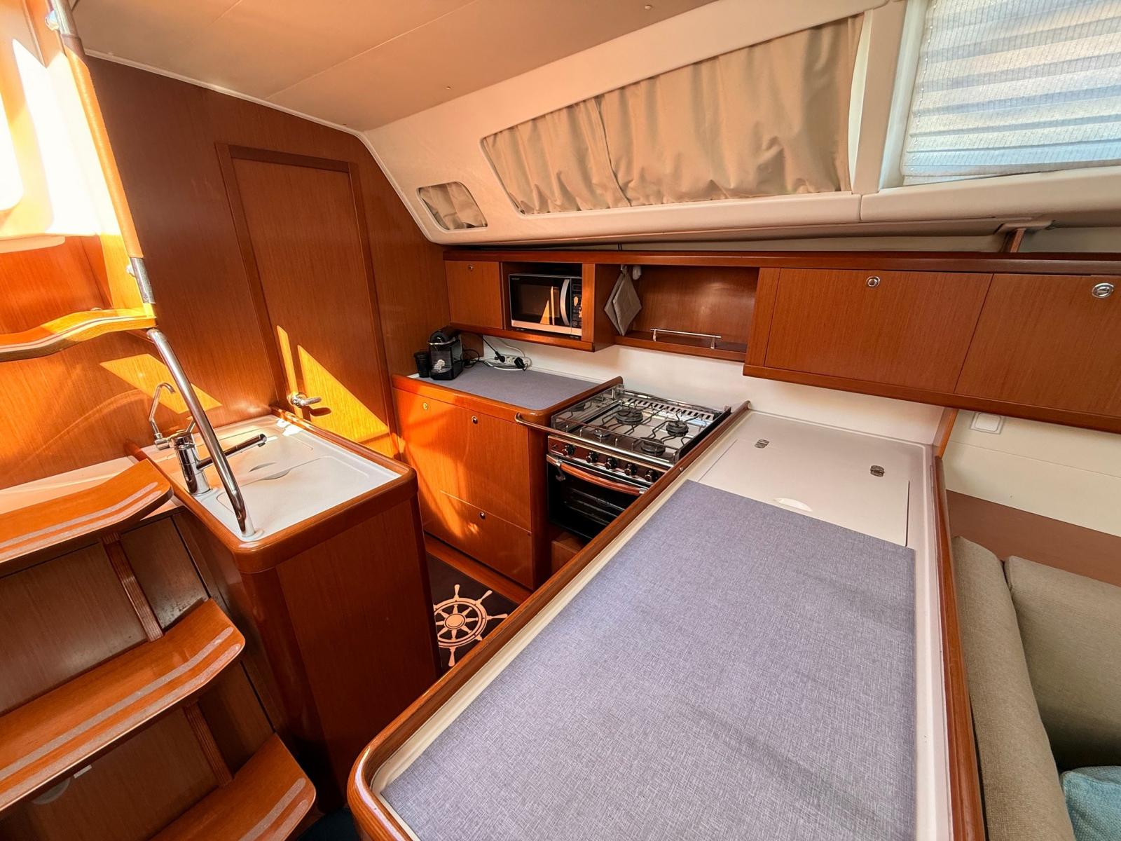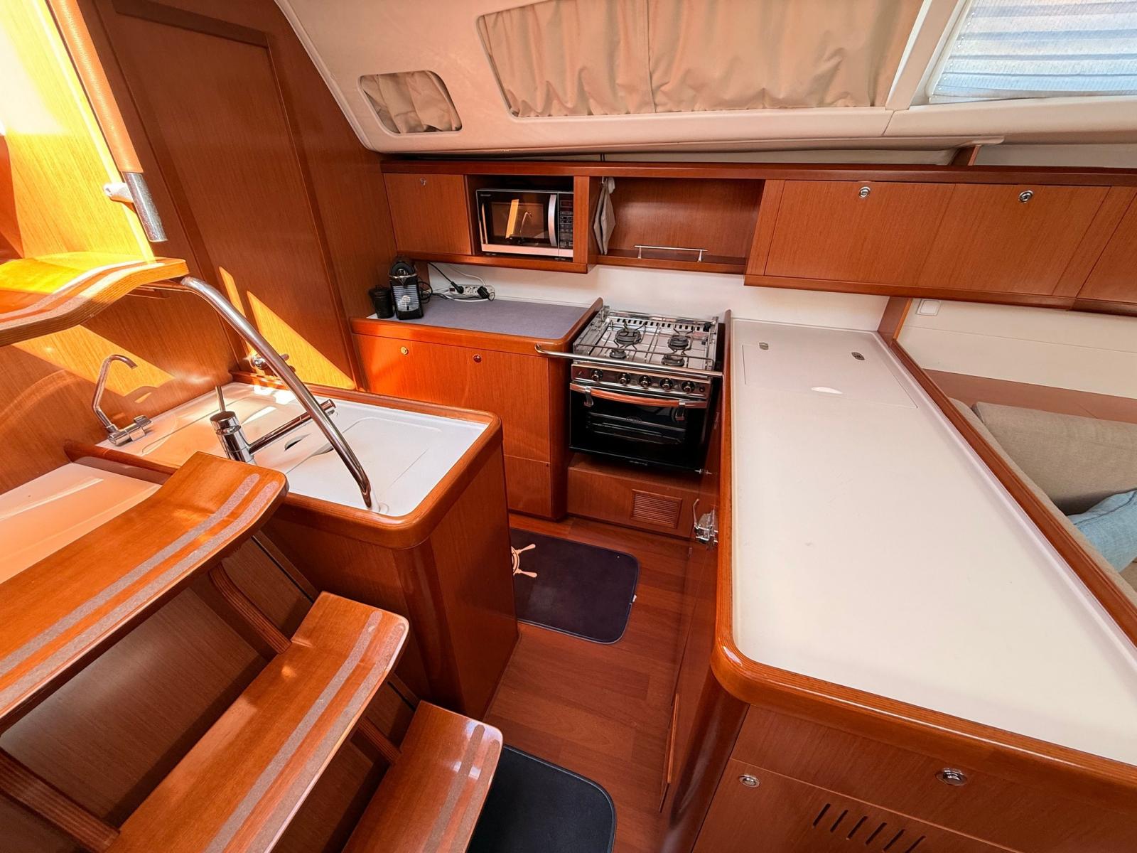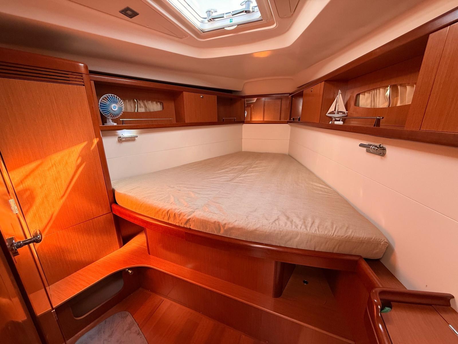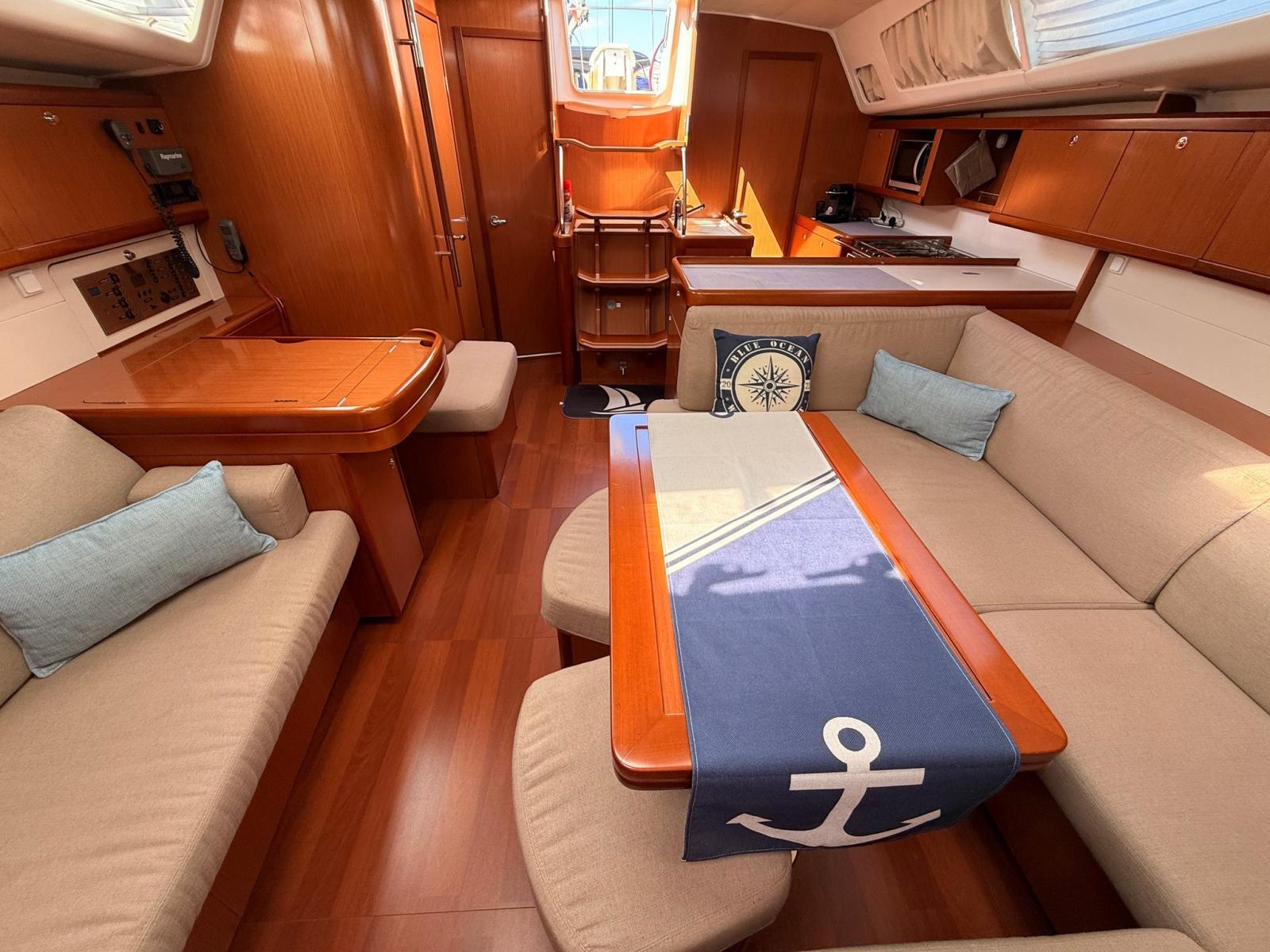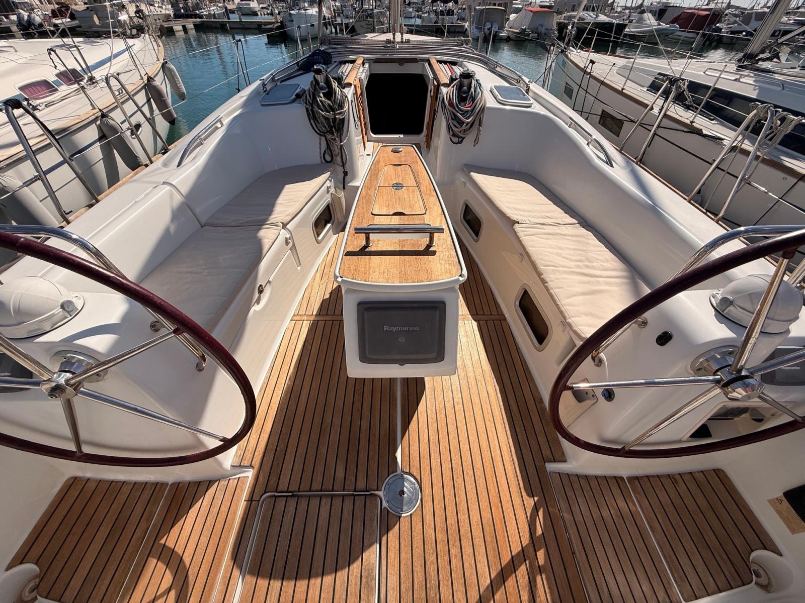 La coperta è concepita per garantire comfort e sicurezza: pozzetto ampio con doppia timoneria, facile accesso alla piattaforma di poppa, winch a portata di mano e piano velico ben bilanciato, ideale anche per equipaggio ridotto.