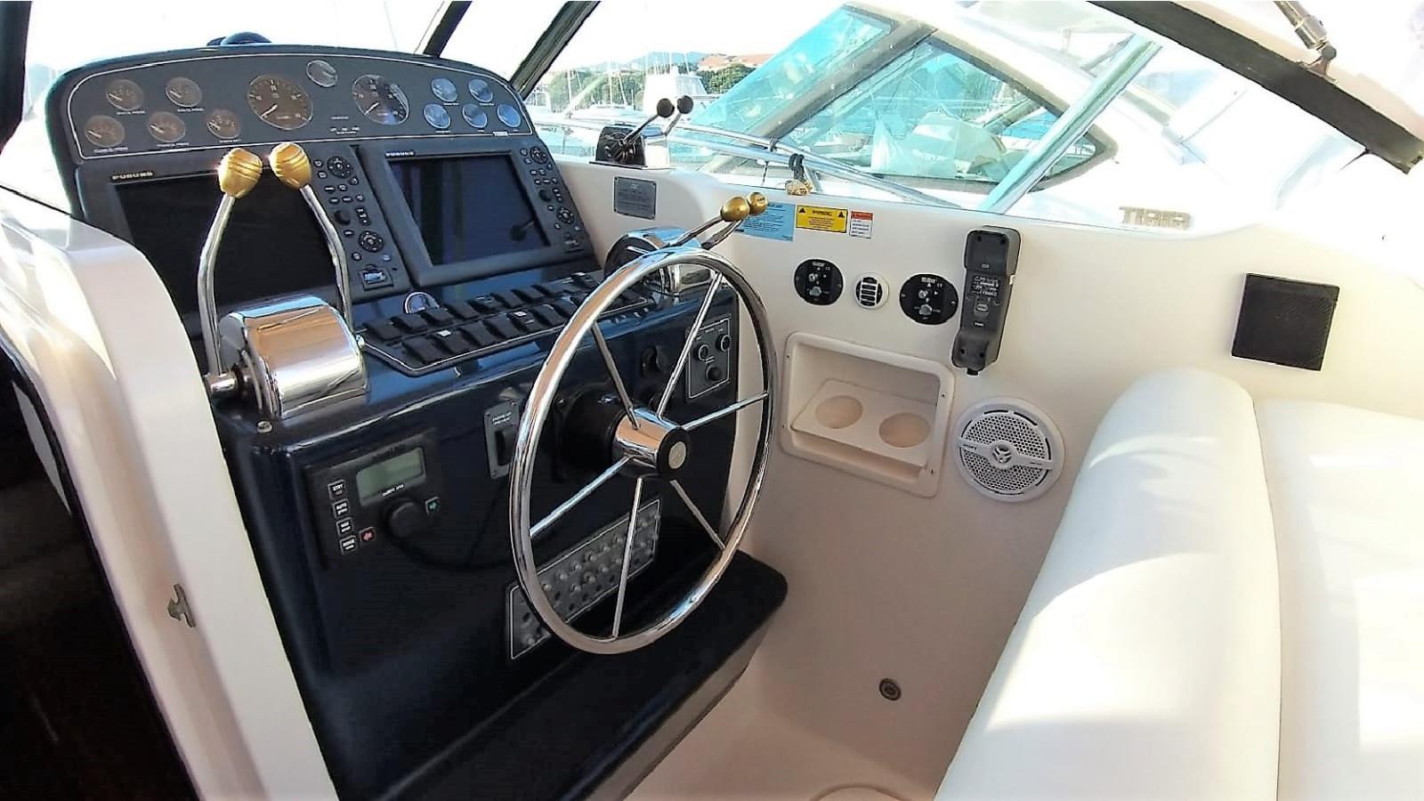 Angolo barra, Antenna radar, Comando motori elettronico, Ecoscandaglio (FURUNO), Pilota automatico (SIMRAD), Plotter con antenna GPS (FURUNO DOPPIO SCHERMO), Radar (FURUNO).