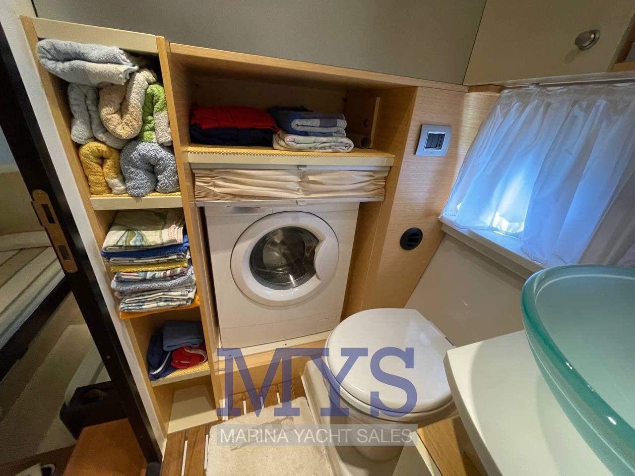 Secondo bagno con entrata sia da cabina di poppa che da disimpegno con doccia, lavello, wc elettrico e lavatrice