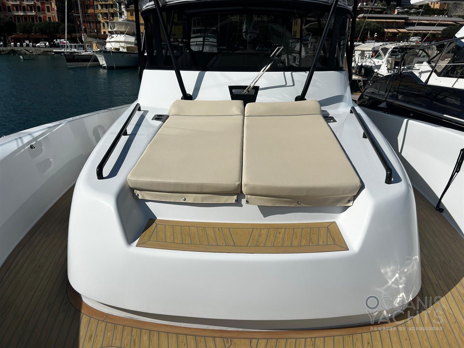Allarme motore, Allarme sentina, Alternatore, Apertura Vano Motore Elettrica, Autoclave, Colorazione speciale, Doccia esterna, Gruette per tender, Indicatori Flaps, Lavandino nel Pozzetto, Luci di cortesia, Monitor batteria, Parabordi, Passerella, Pompa di sentina automatica, Ponte in teak (sintetico), Porta ingresso, Pozzetto Teak (sintetico), Salpa Ancore Elettrico, Scaletta da bagno, Tavolo pozzetto, Tavolo Salone Abbattibile, Tromba, T-Top.